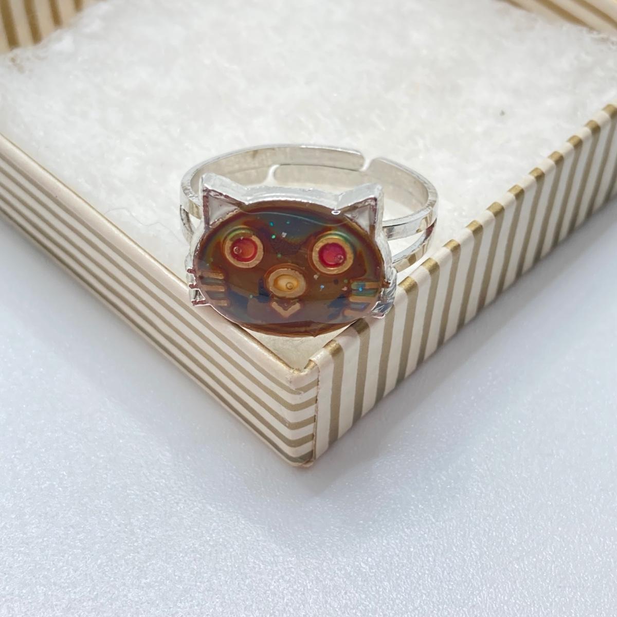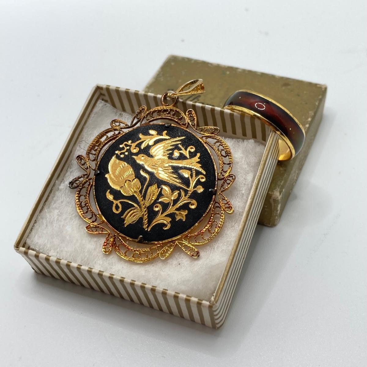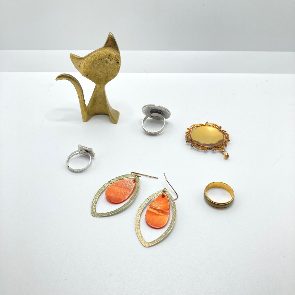 LOT 164: Vintage Jewelry and Ring Holder - Gold Tone Cat Ring Holder, Damascene Pendant, Mood Ring and More
