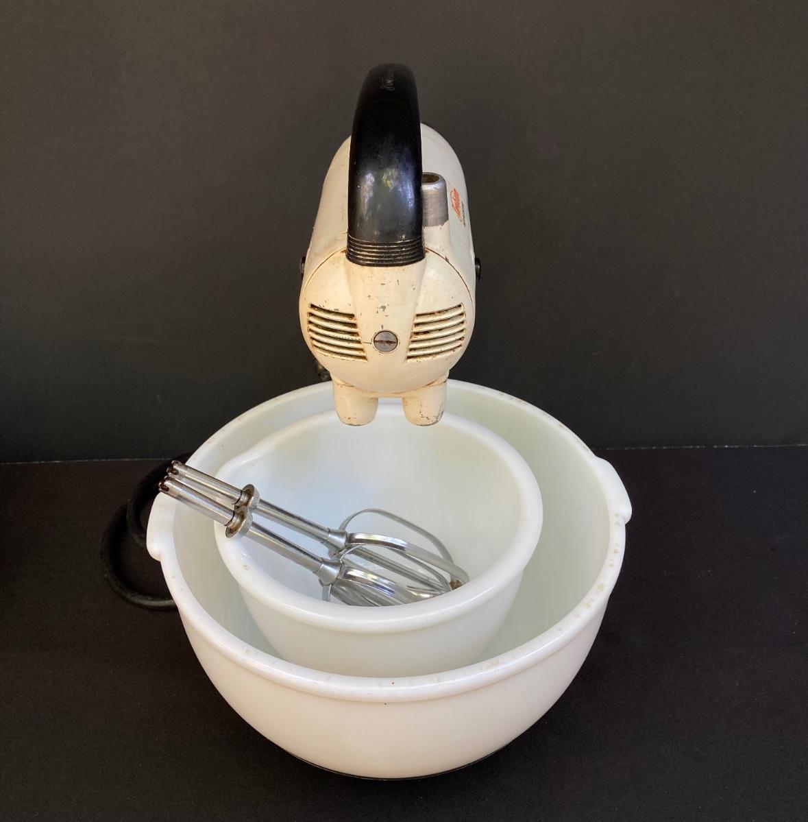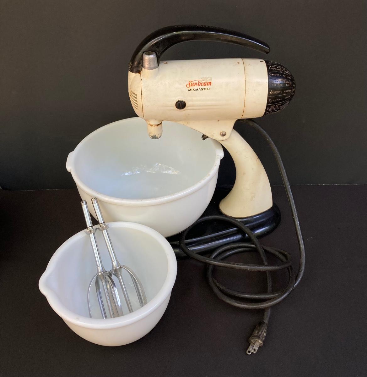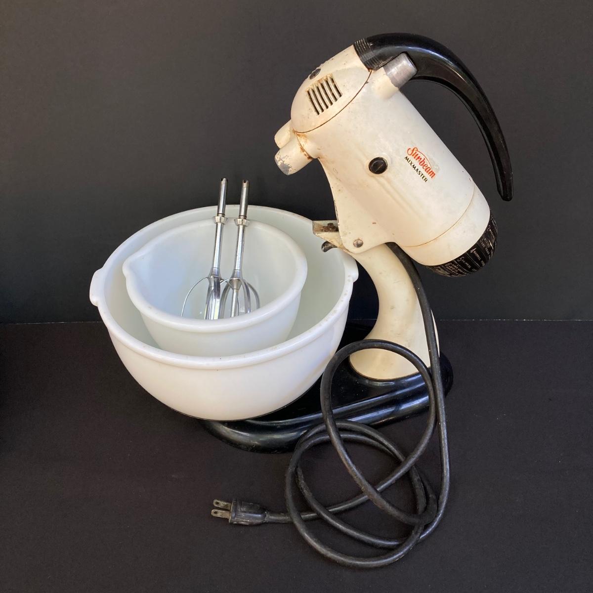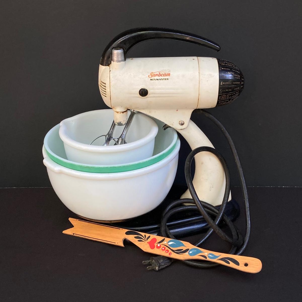 LOT 167: Vintage Sunbeam Mixer, Green Pyrex Mixing Bowl and Wooden Oven Stick