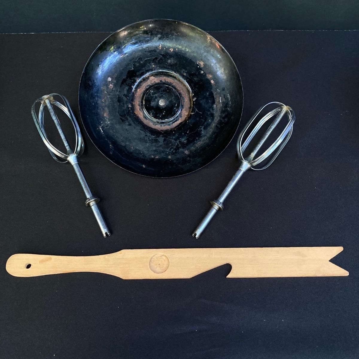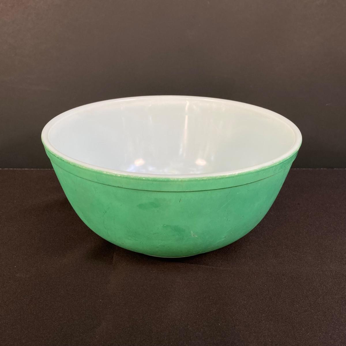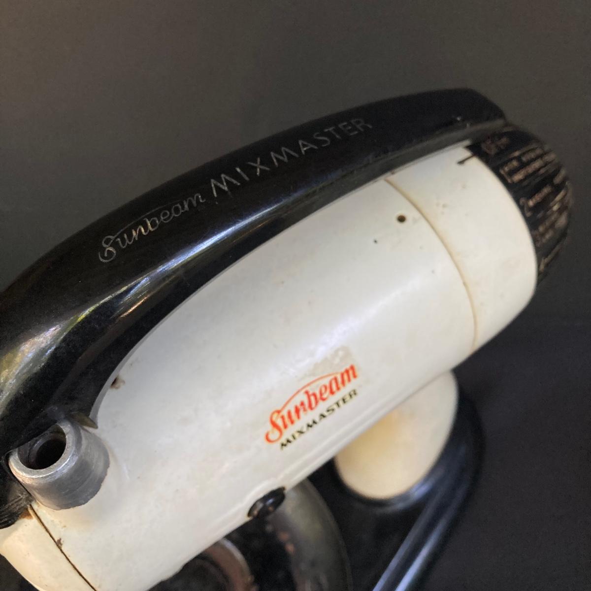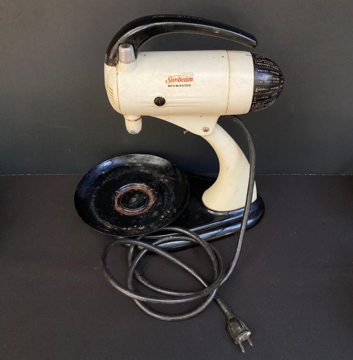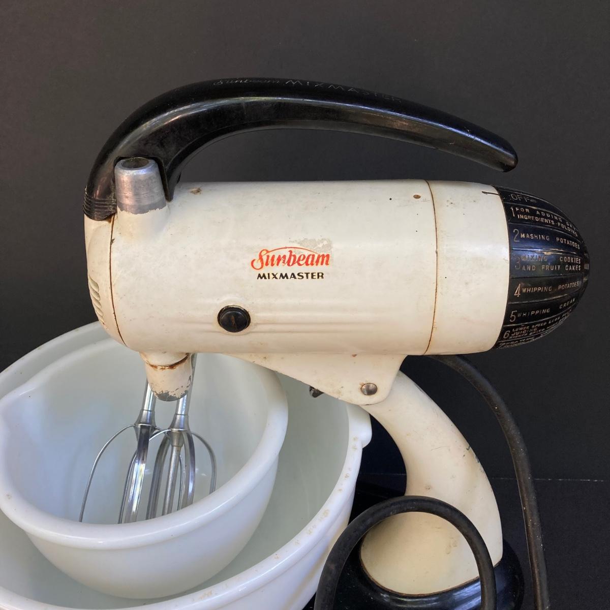 LOT 167: Vintage Sunbeam Mixer, Green Pyrex Mixing Bowl and Wooden Oven Stick
