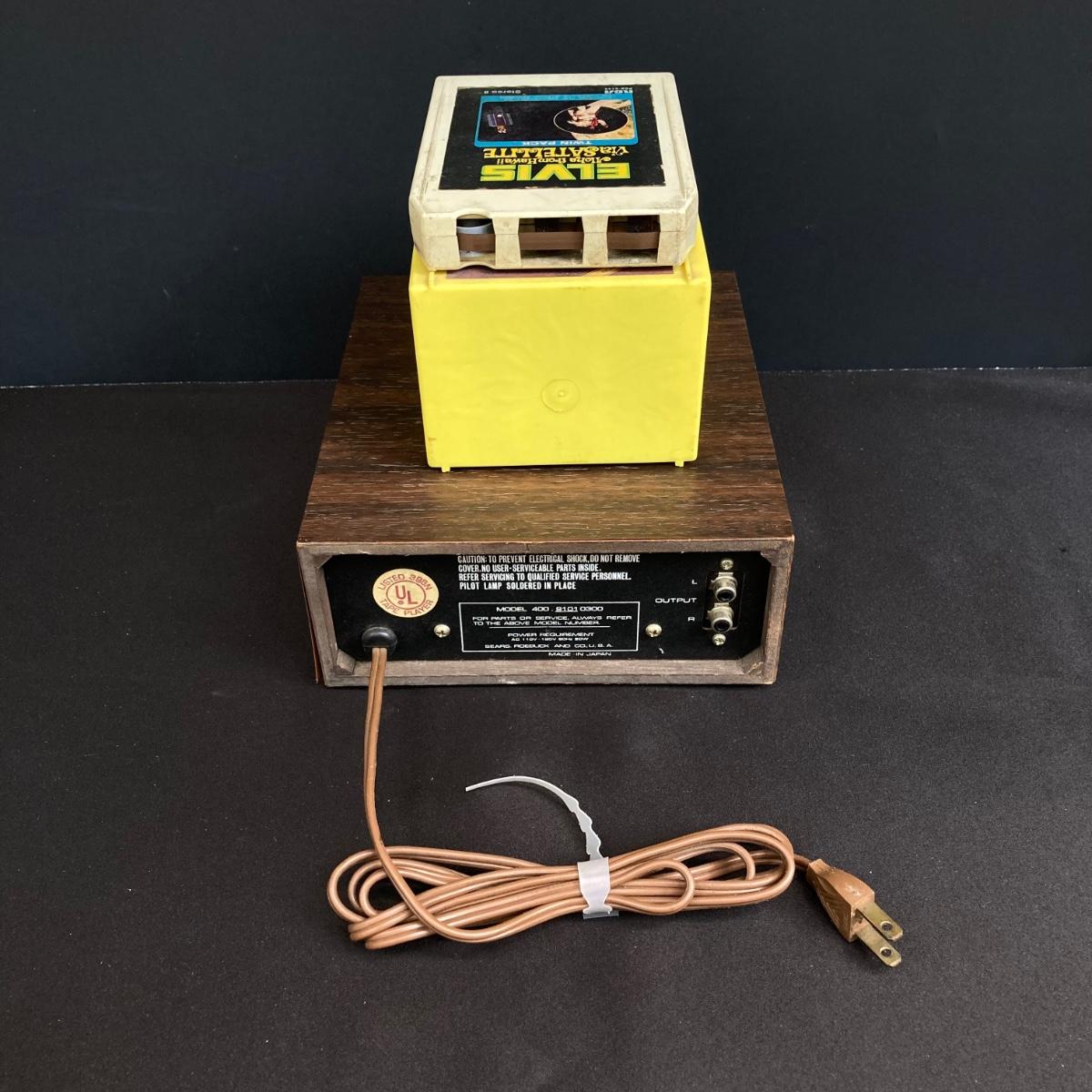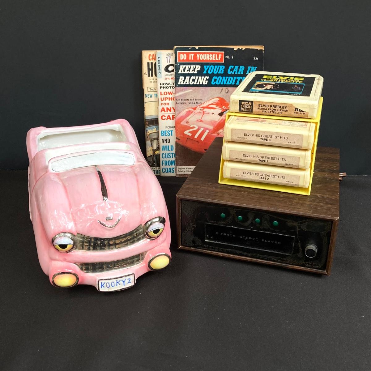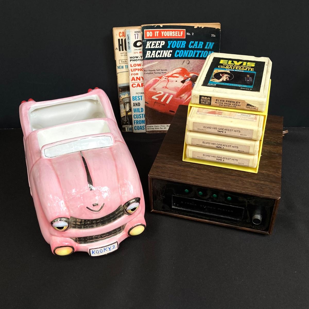 LOT 172: Vintage Sears Roebuck and Co. 8 Track Player Model 400 9101 0300, Elvis 8 Track Tapes, Car Books and Kooky2 Pink Cadillac Candy Dish / Planter