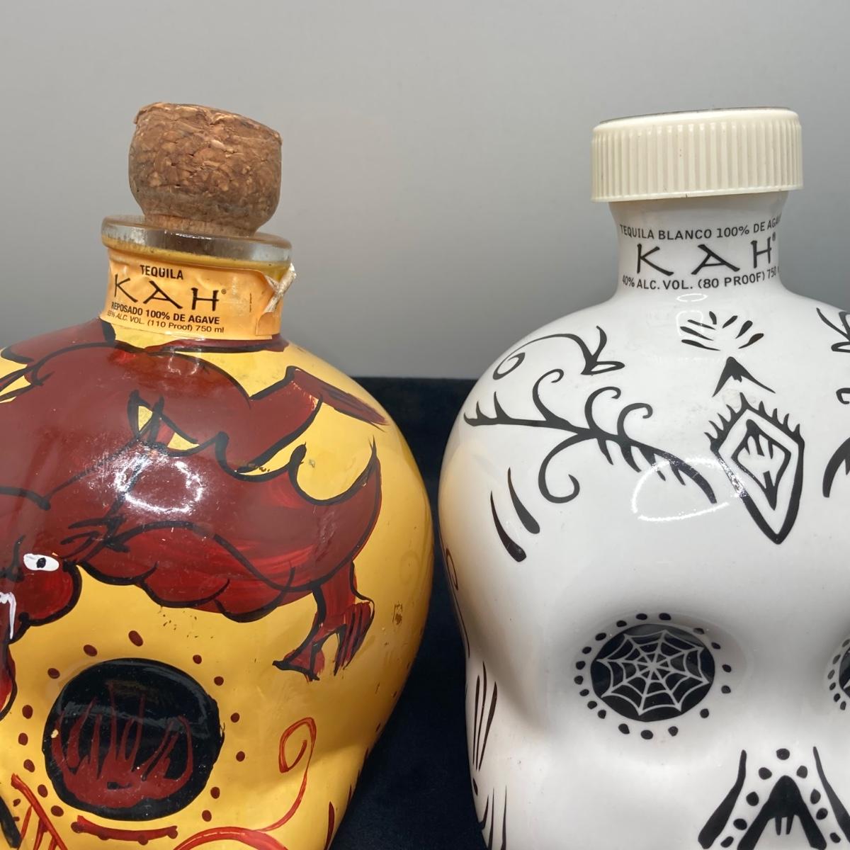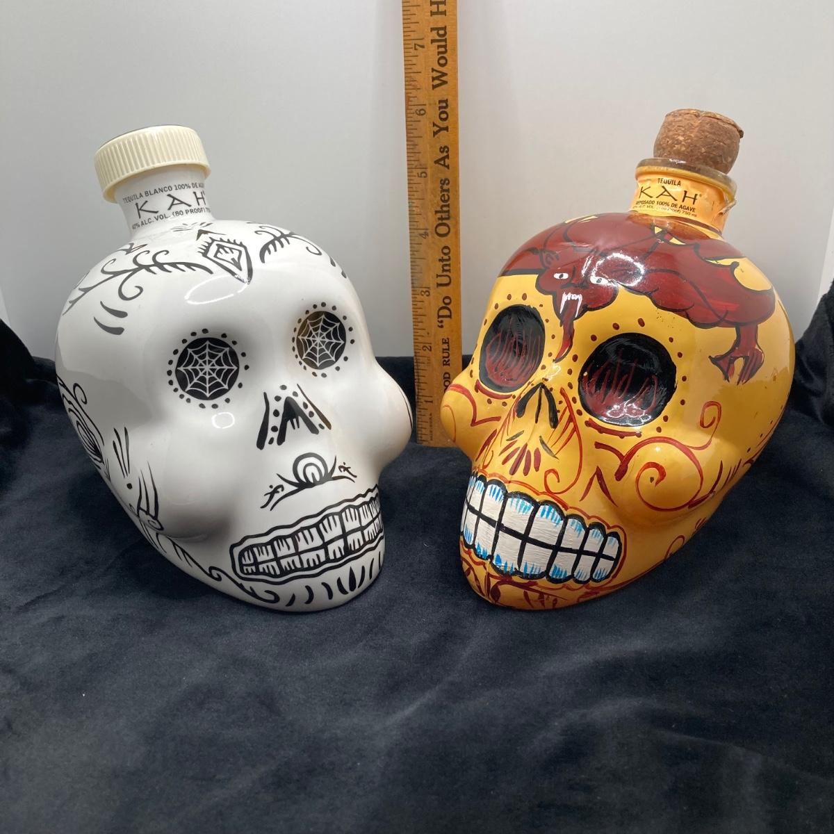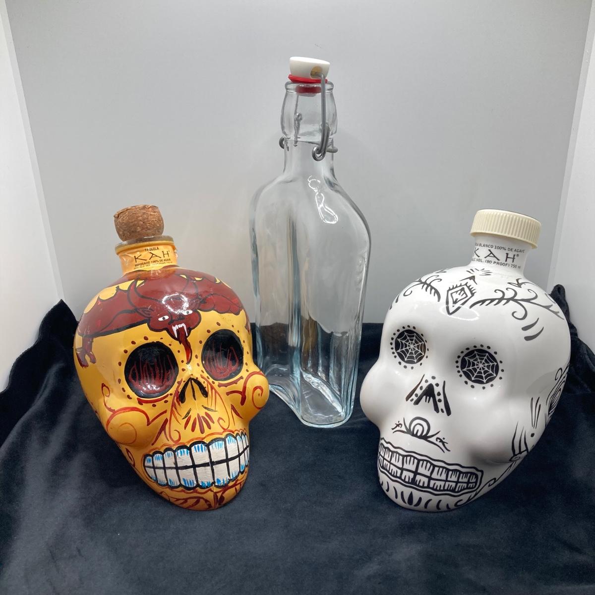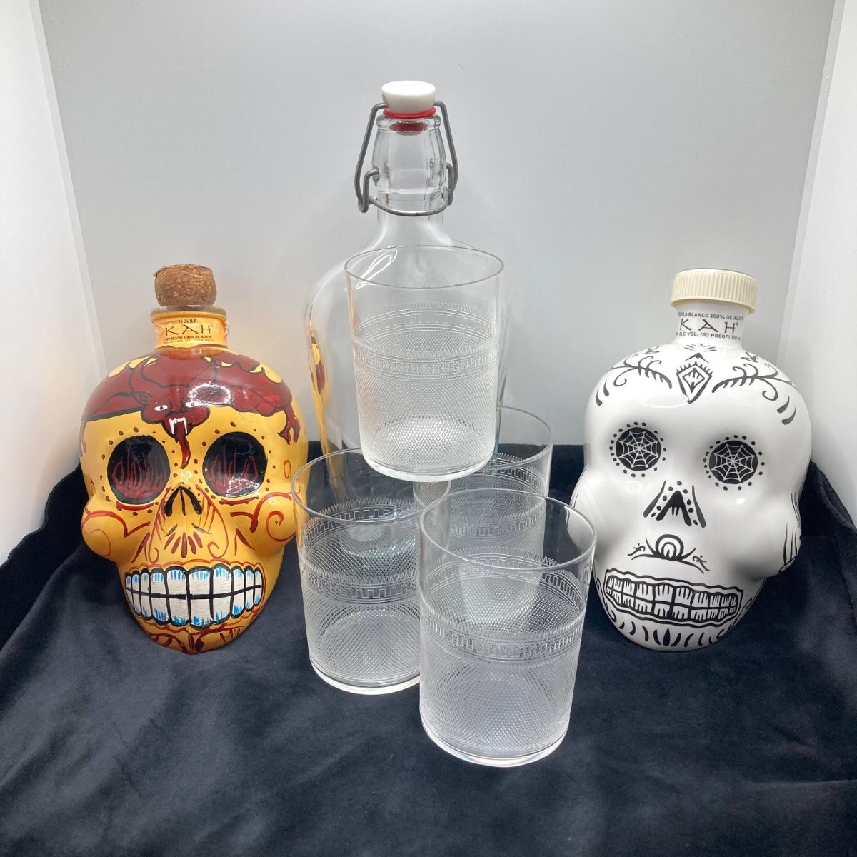 LOT 177: Pair of Kah Tequila Scull Bottles / Decanters, Set of Four Rocks Glasses and Glass Bottle with Wire Bail Swing Top Lid