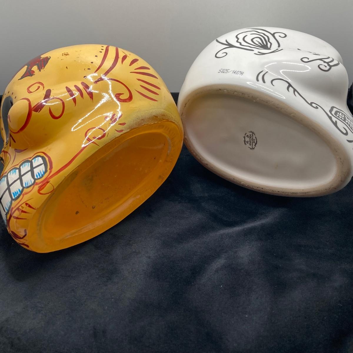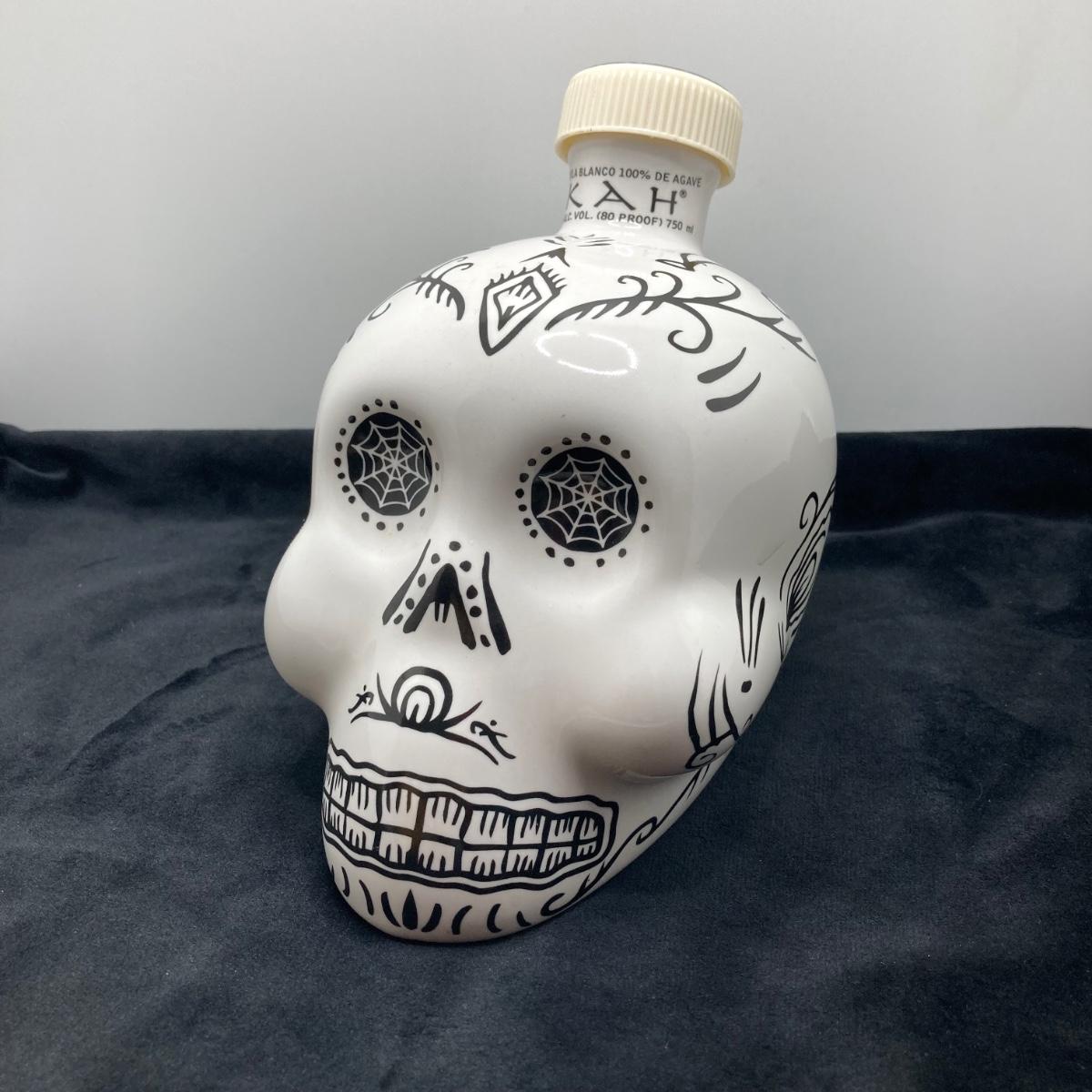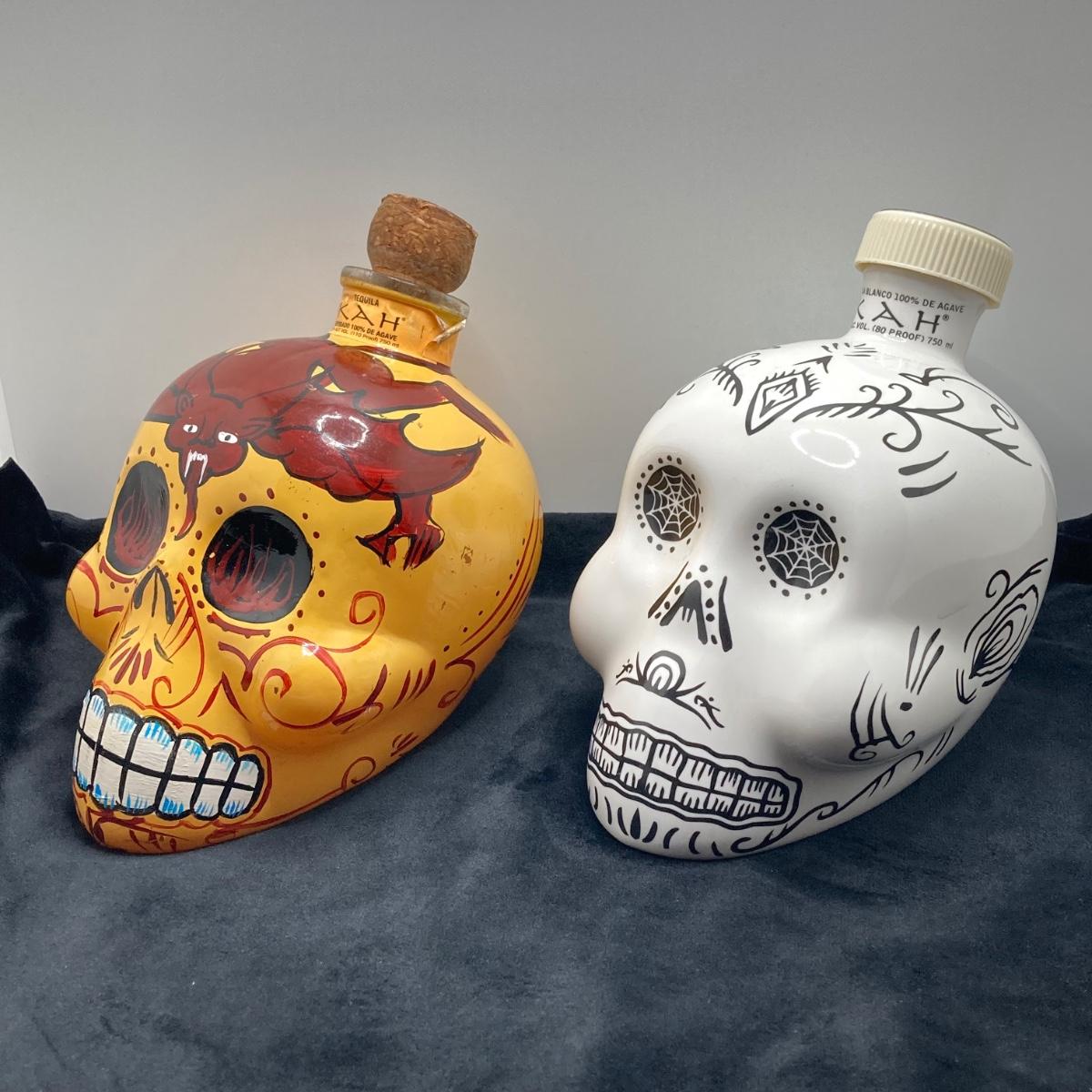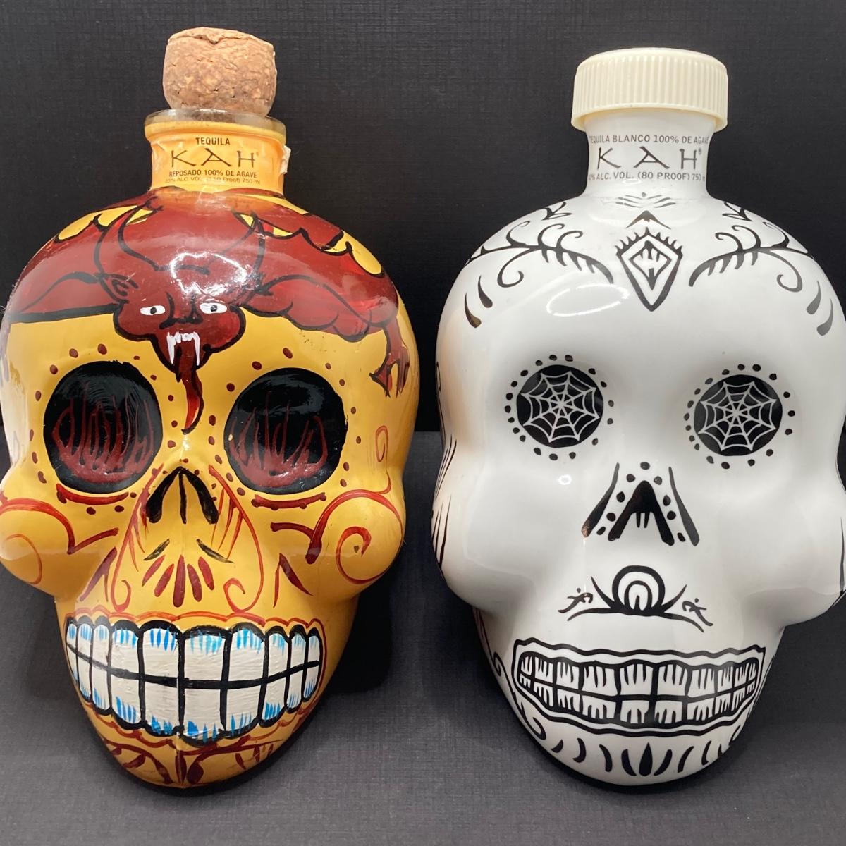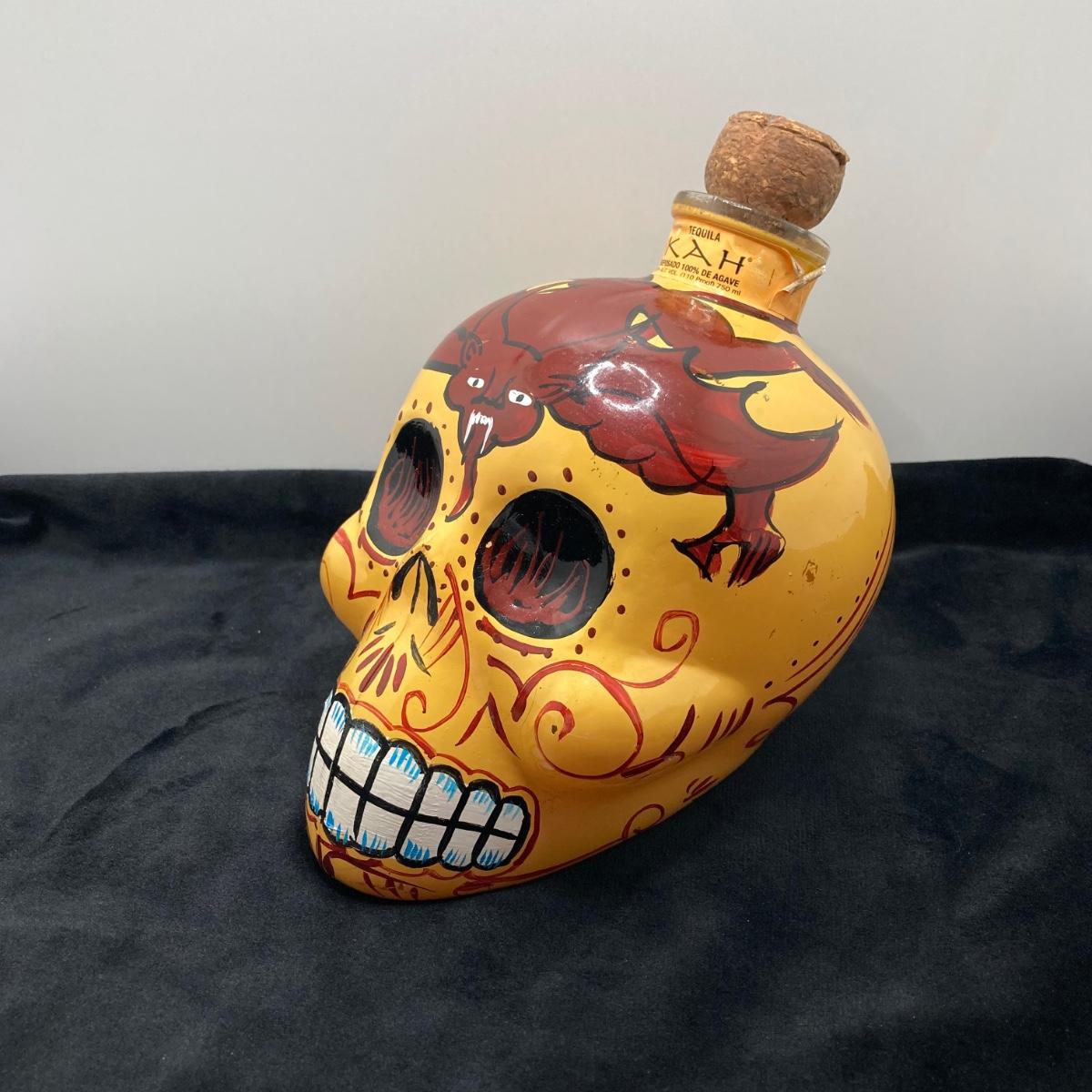 LOT 177: Pair of Kah Tequila Scull Bottles / Decanters, Set of Four Rocks Glasses and Glass Bottle with Wire Bail Swing Top Lid