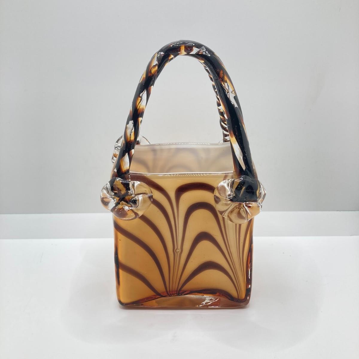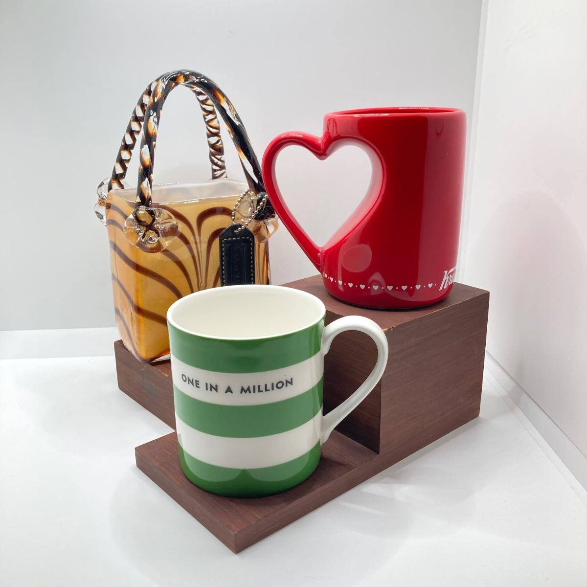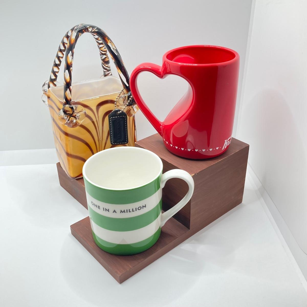 LOT 178: Lenox Kate Spade One In A Million Mug, Art Glass Animal Print Handbag Vase, Leather Coach Hang Tag and Krispy Kreme Mug