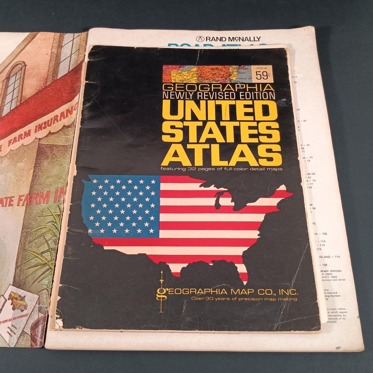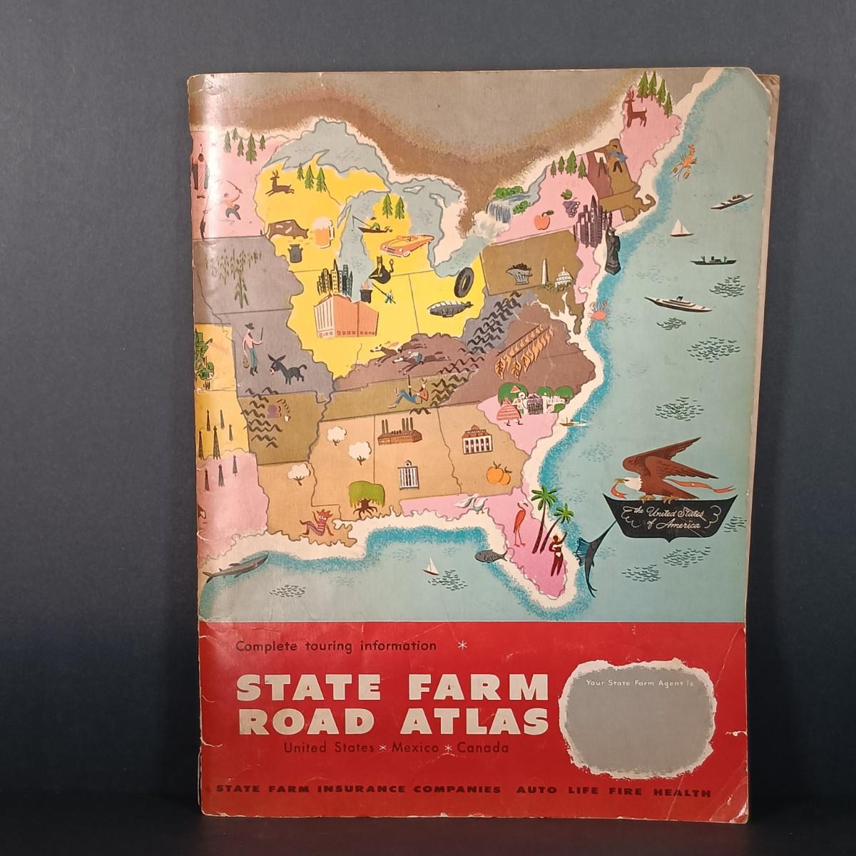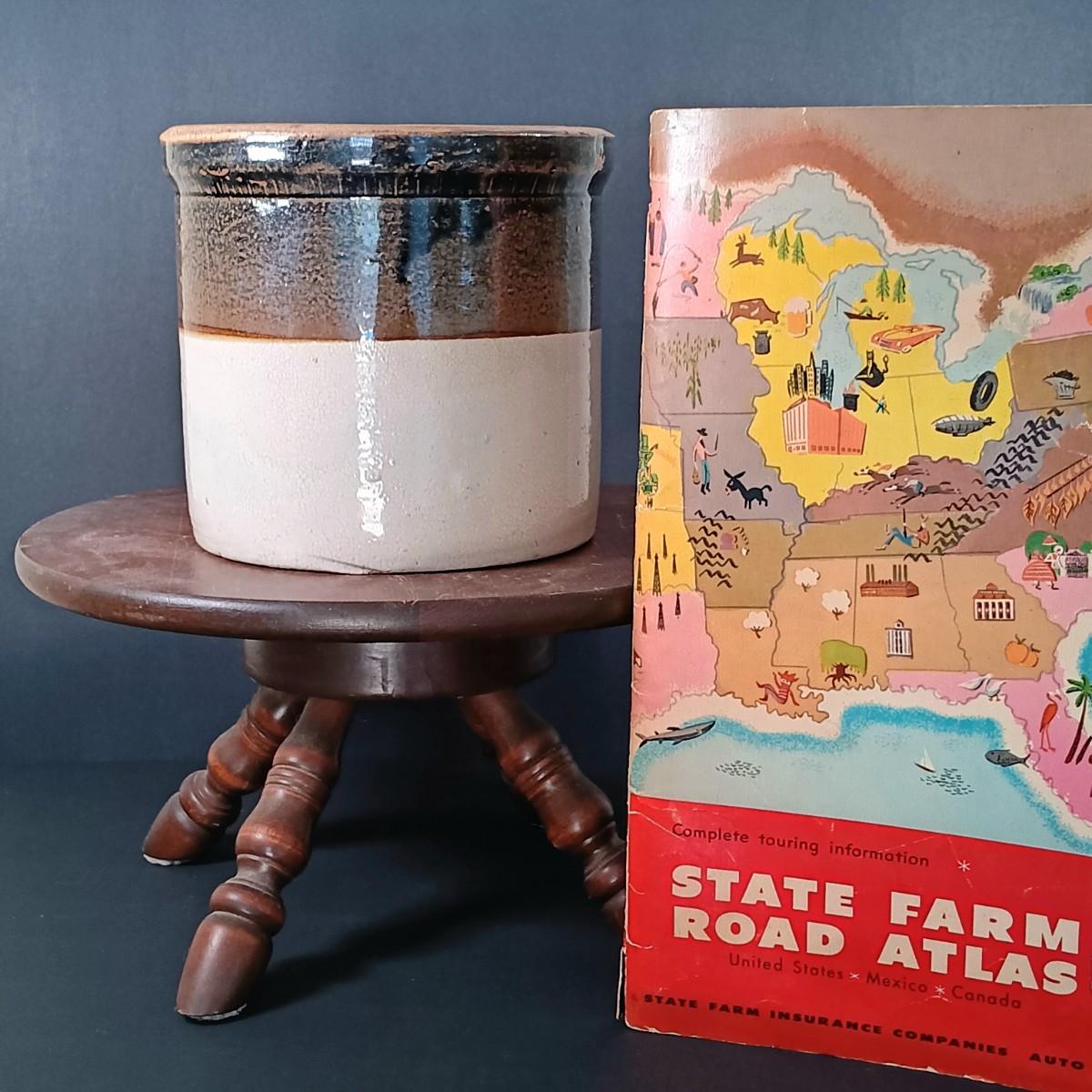 LOT 24: Stoneware Crock, Vintage Footstool & 1978 State Farm Road Atlas