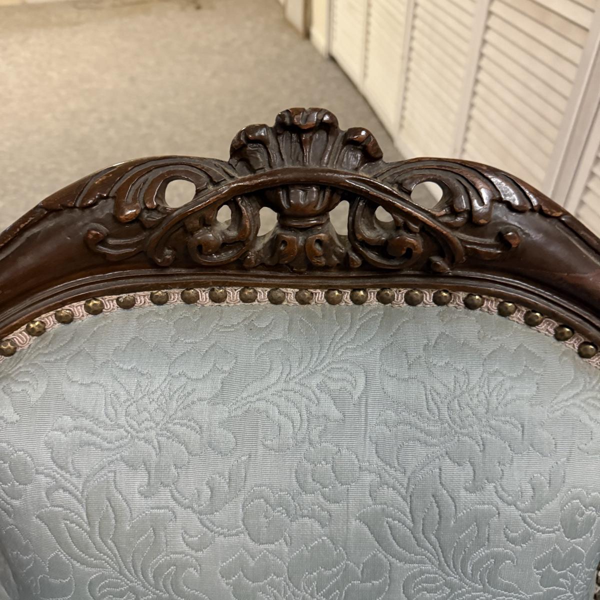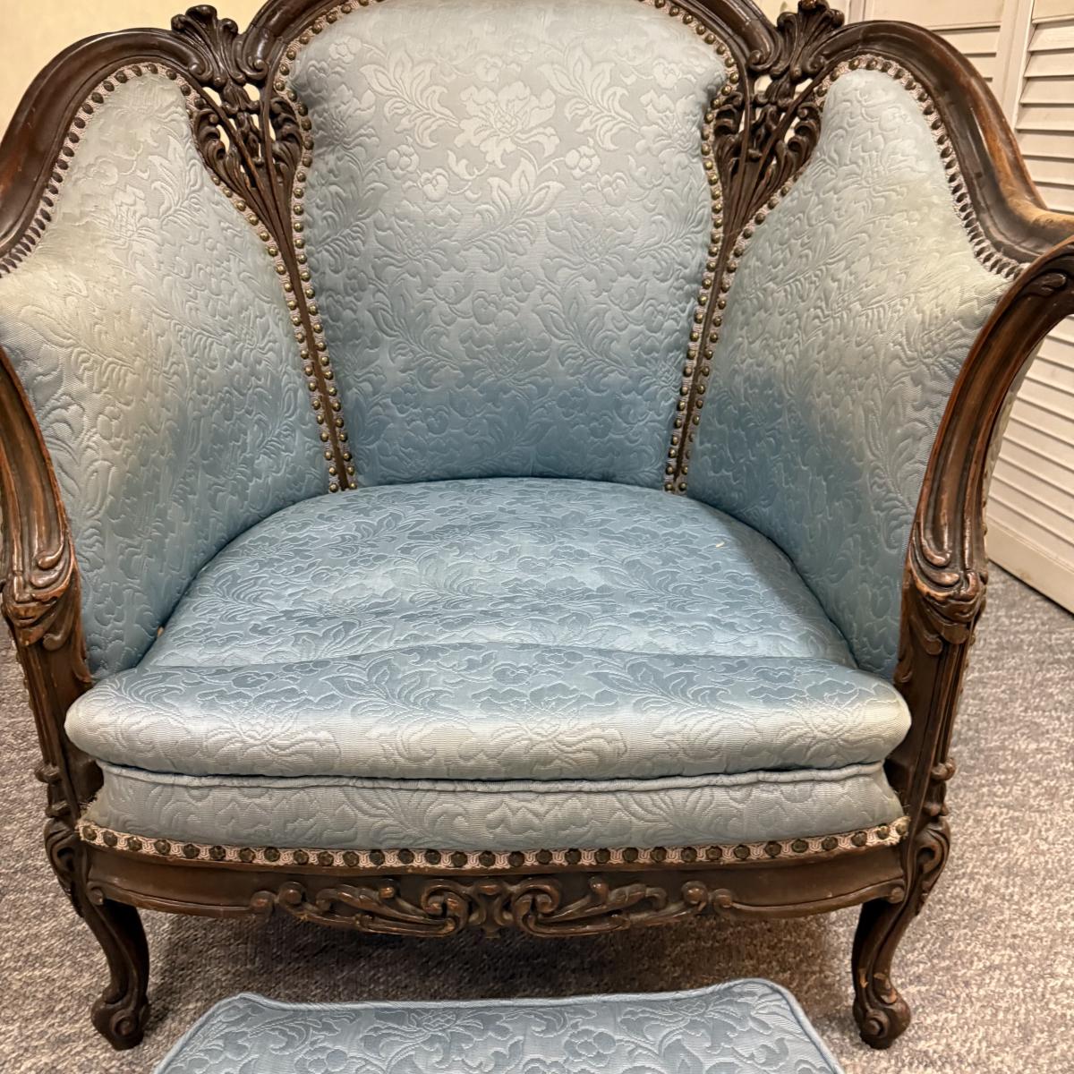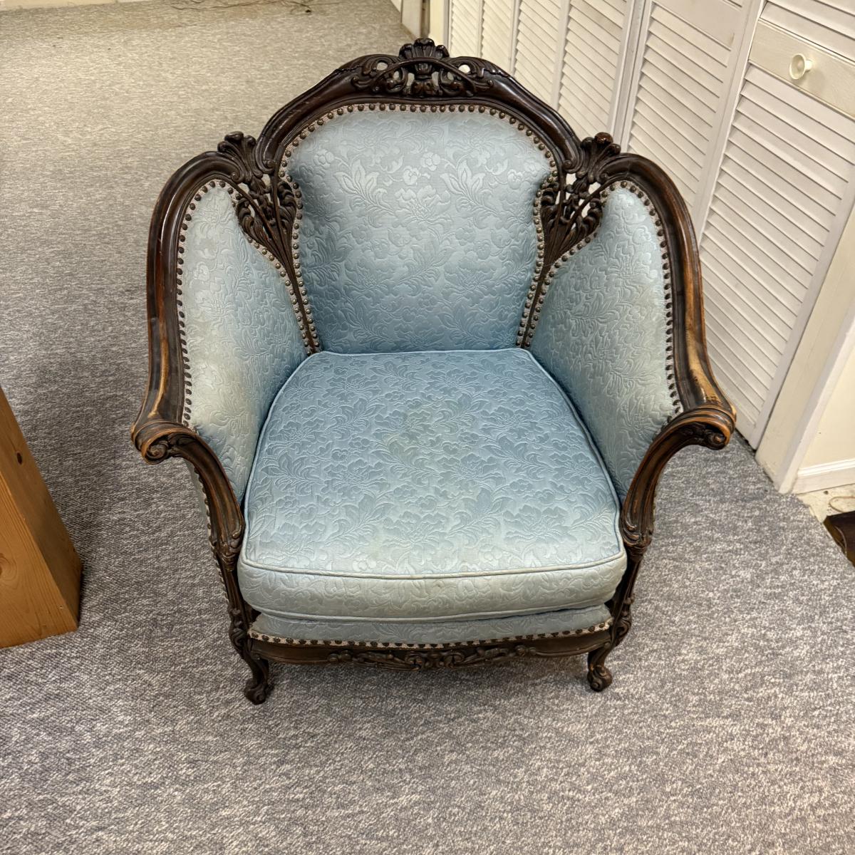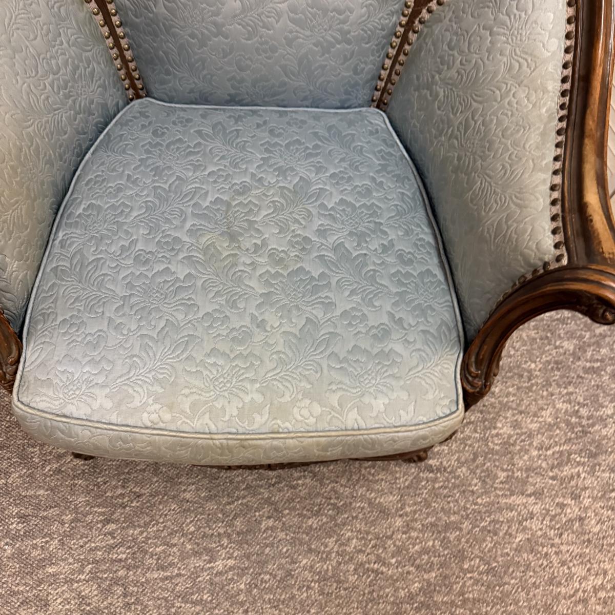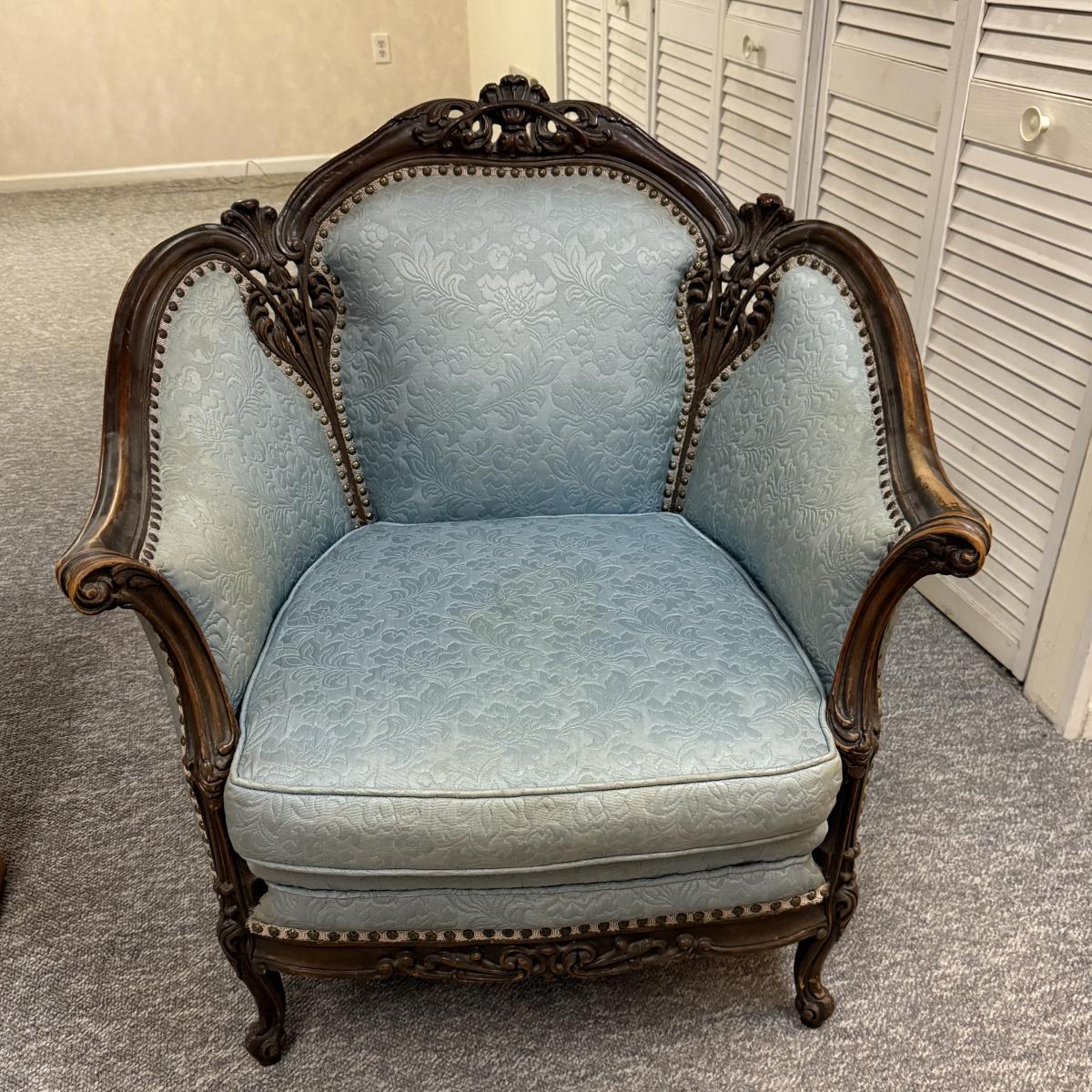 LOT 31: Vintage Victorian Style Parlor Chair with Blue Embossed Floral upholstery