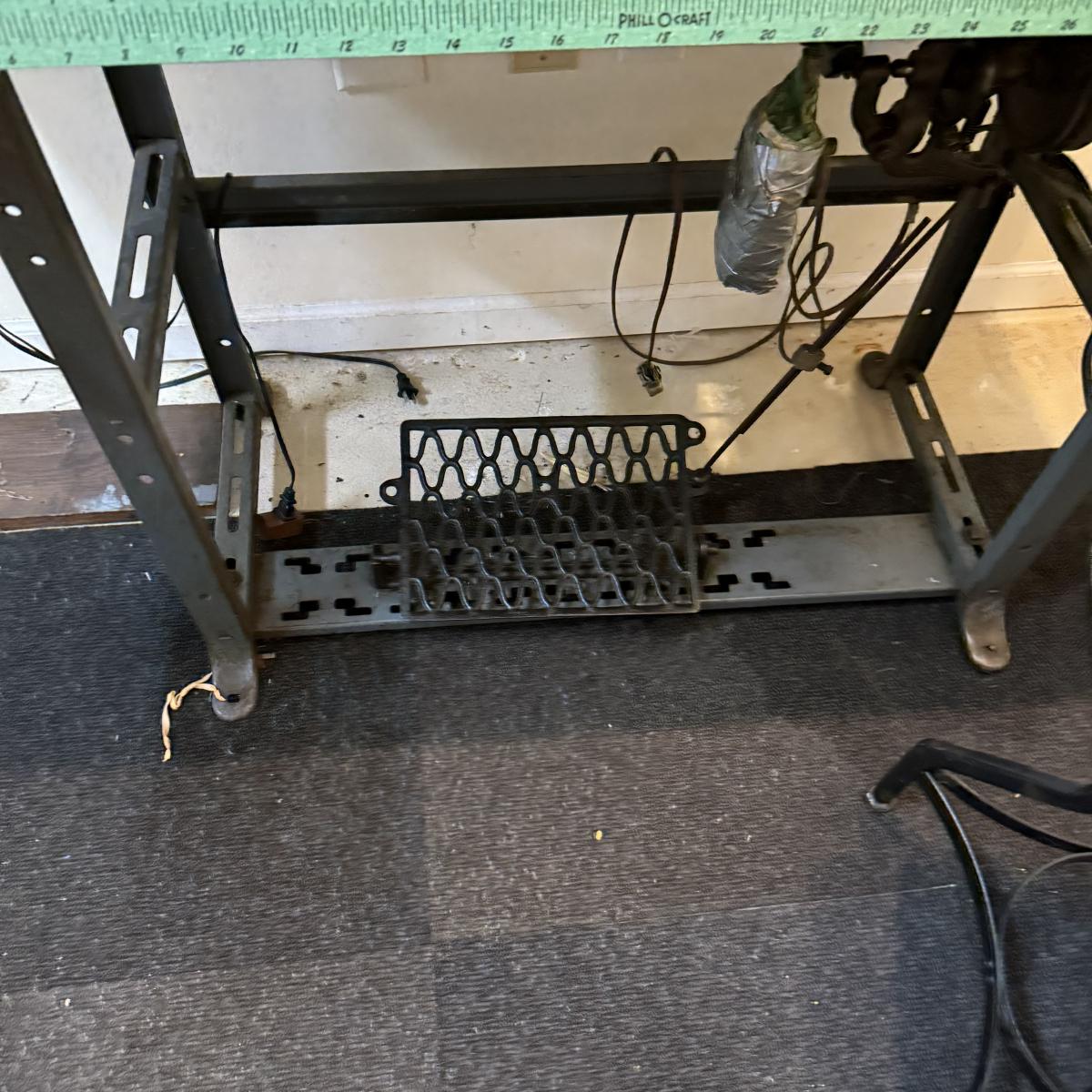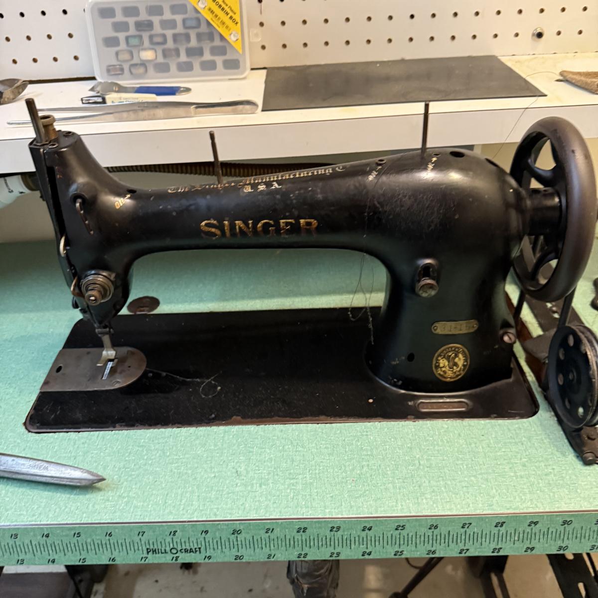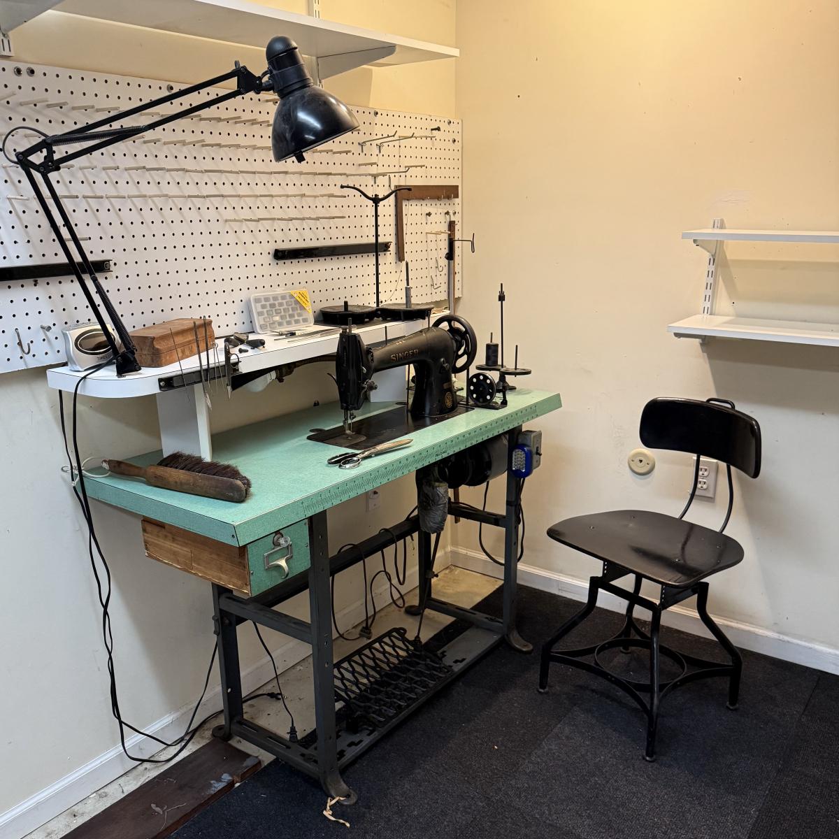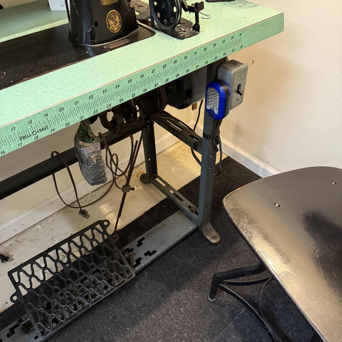 LOT 32: Taylor’s Corner Includes Vintage Singer Sewing Machine and Table Shelf with Light, Chair, Spool/ Tread Holder, Bobbins, and Many More Sewing Must Haves
