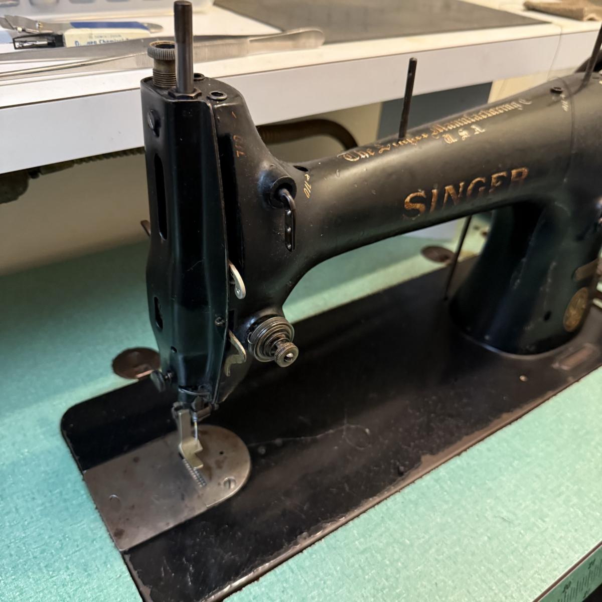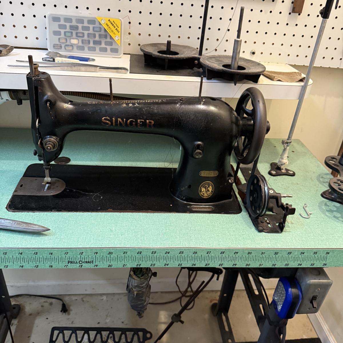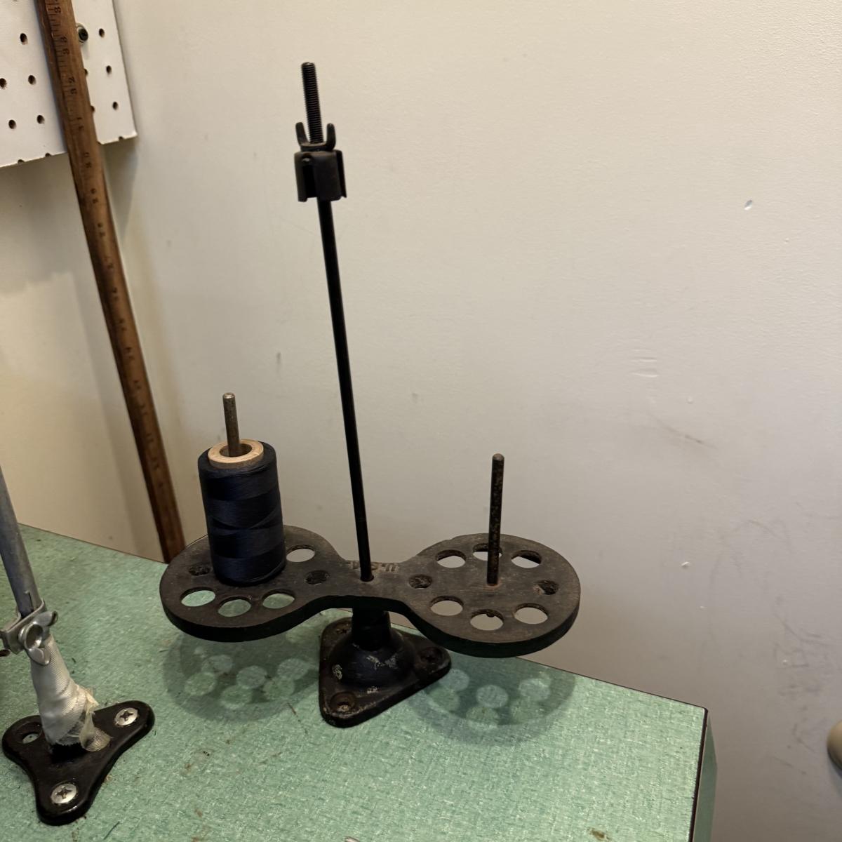 LOT 32: Taylor’s Corner Includes Vintage Singer Sewing Machine and Table Shelf with Light, Chair, Spool/ Tread Holder, Bobbins, and Many More Sewing Must Haves