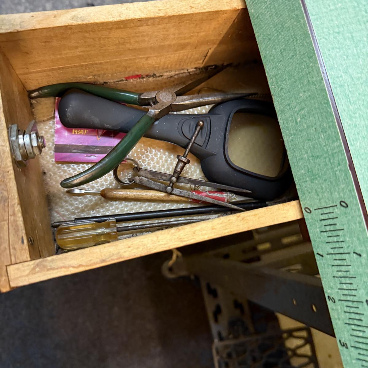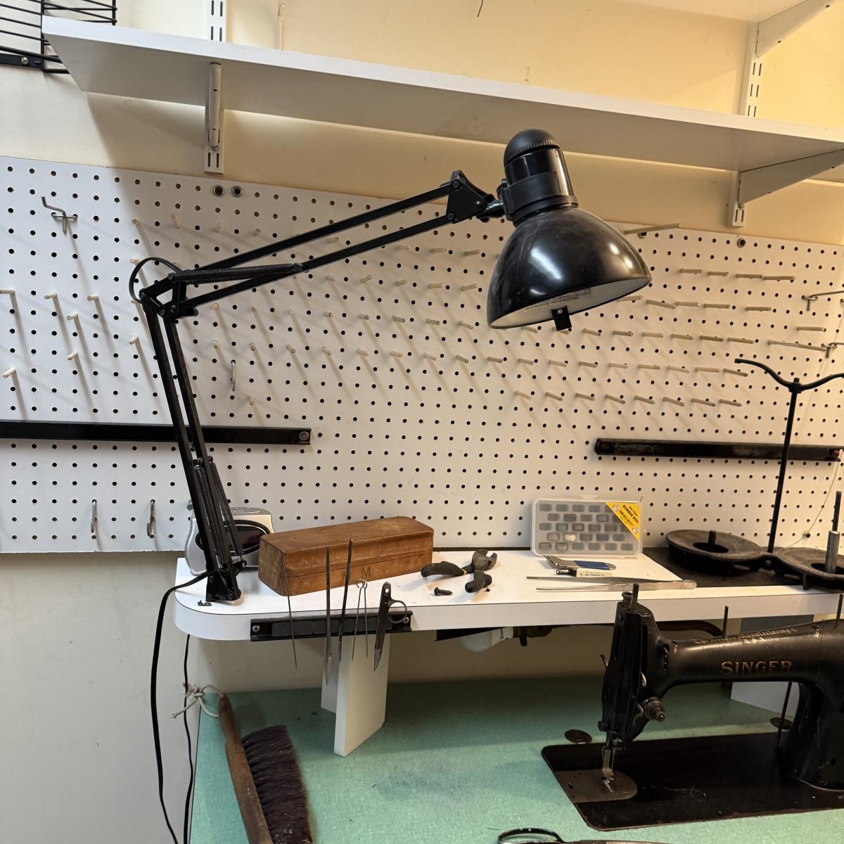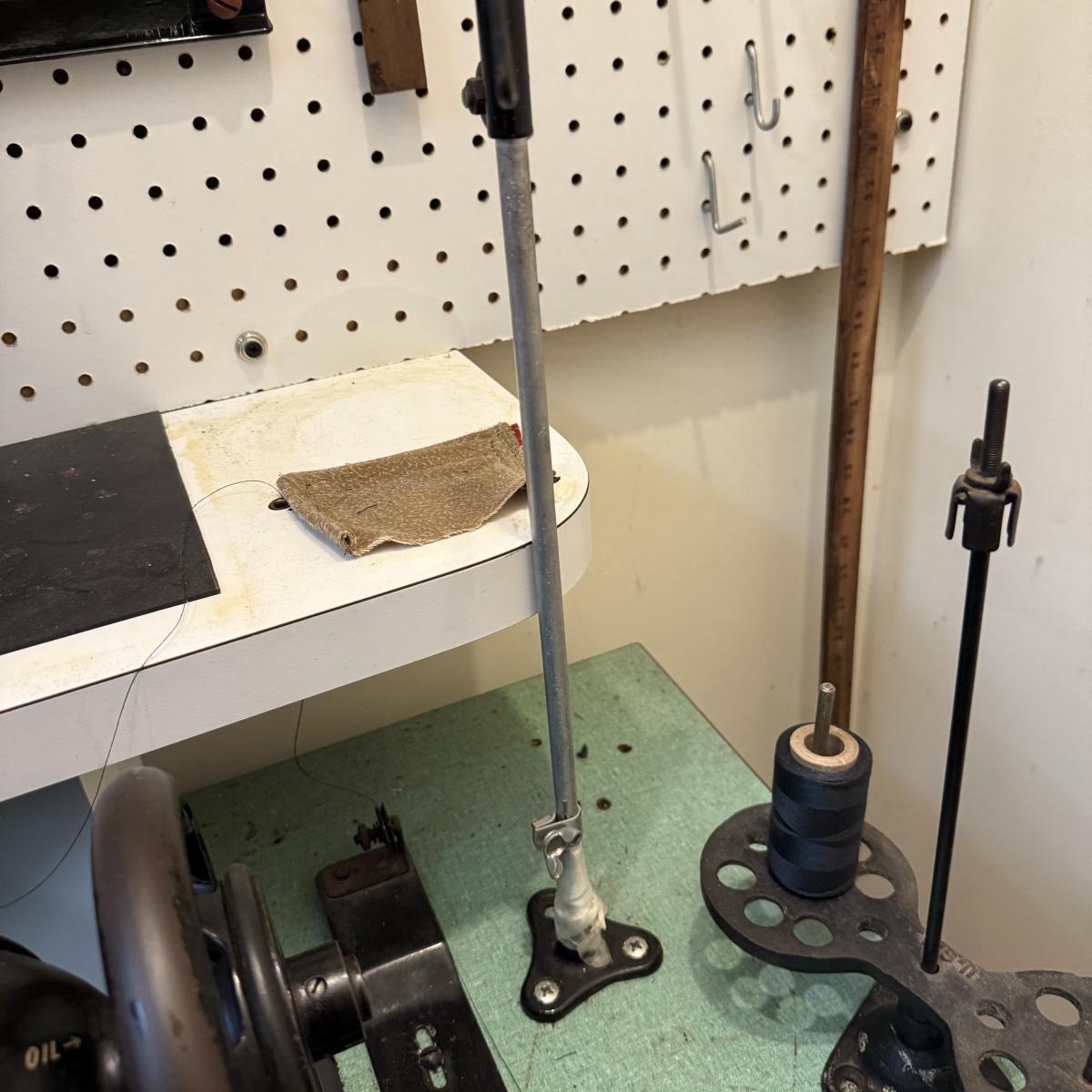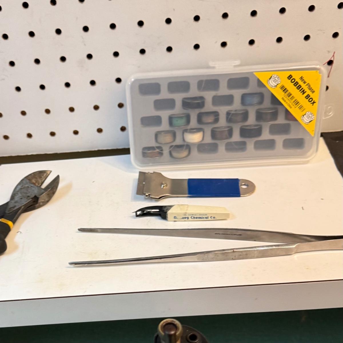 LOT 32: Taylor’s Corner Includes Vintage Singer Sewing Machine and Table Shelf with Light, Chair, Spool/ Tread Holder, Bobbins, and Many More Sewing Must Haves
