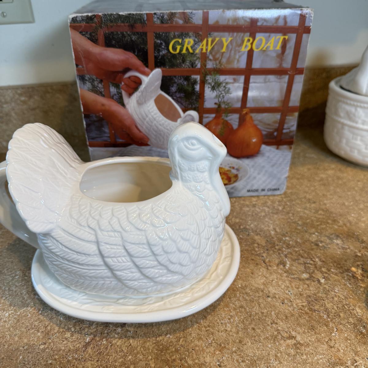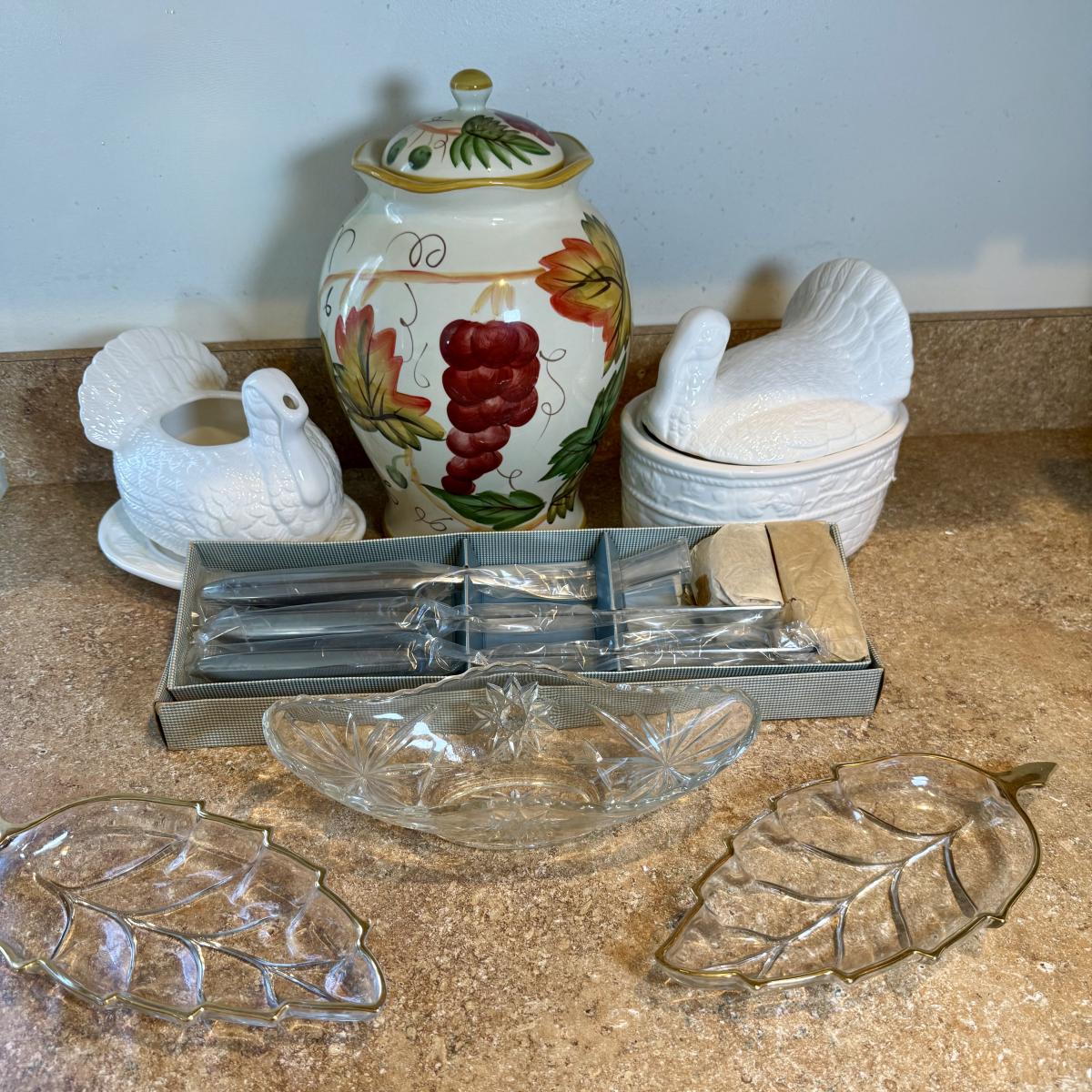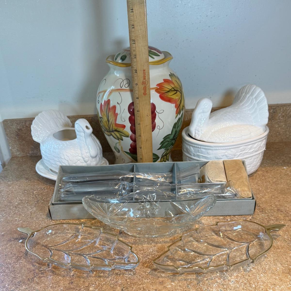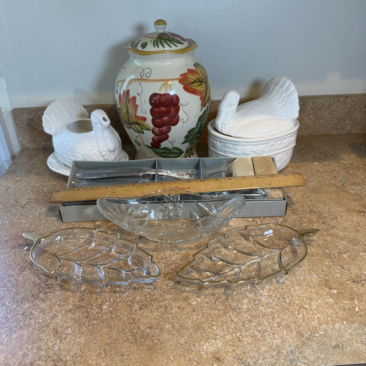 LOT 39: Fall Entertaining/ Serving Must Haves - Turkey Gravy Boat and Covered Stuffing Dish. Autumn Biscotti Jar, Carving Set, Leave Shaped Dishes and More