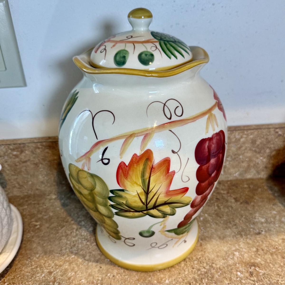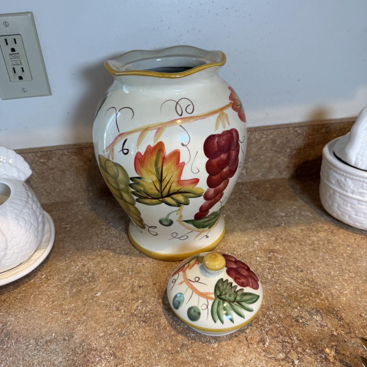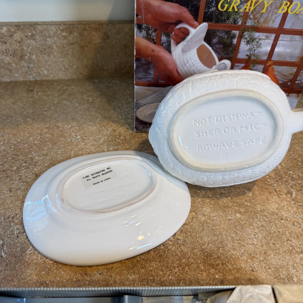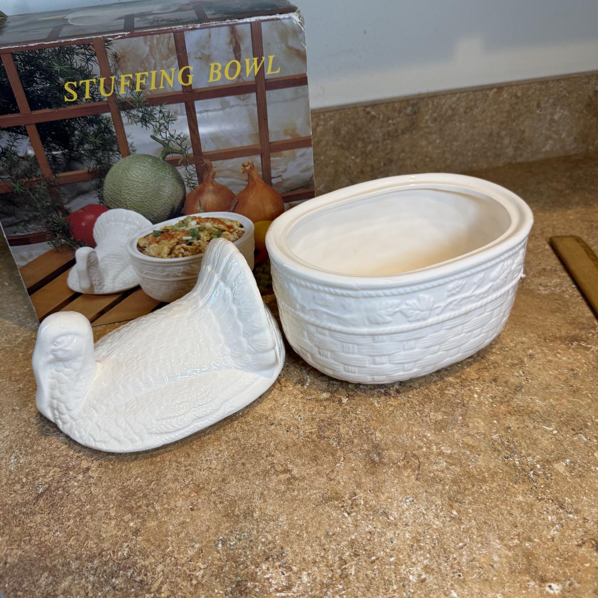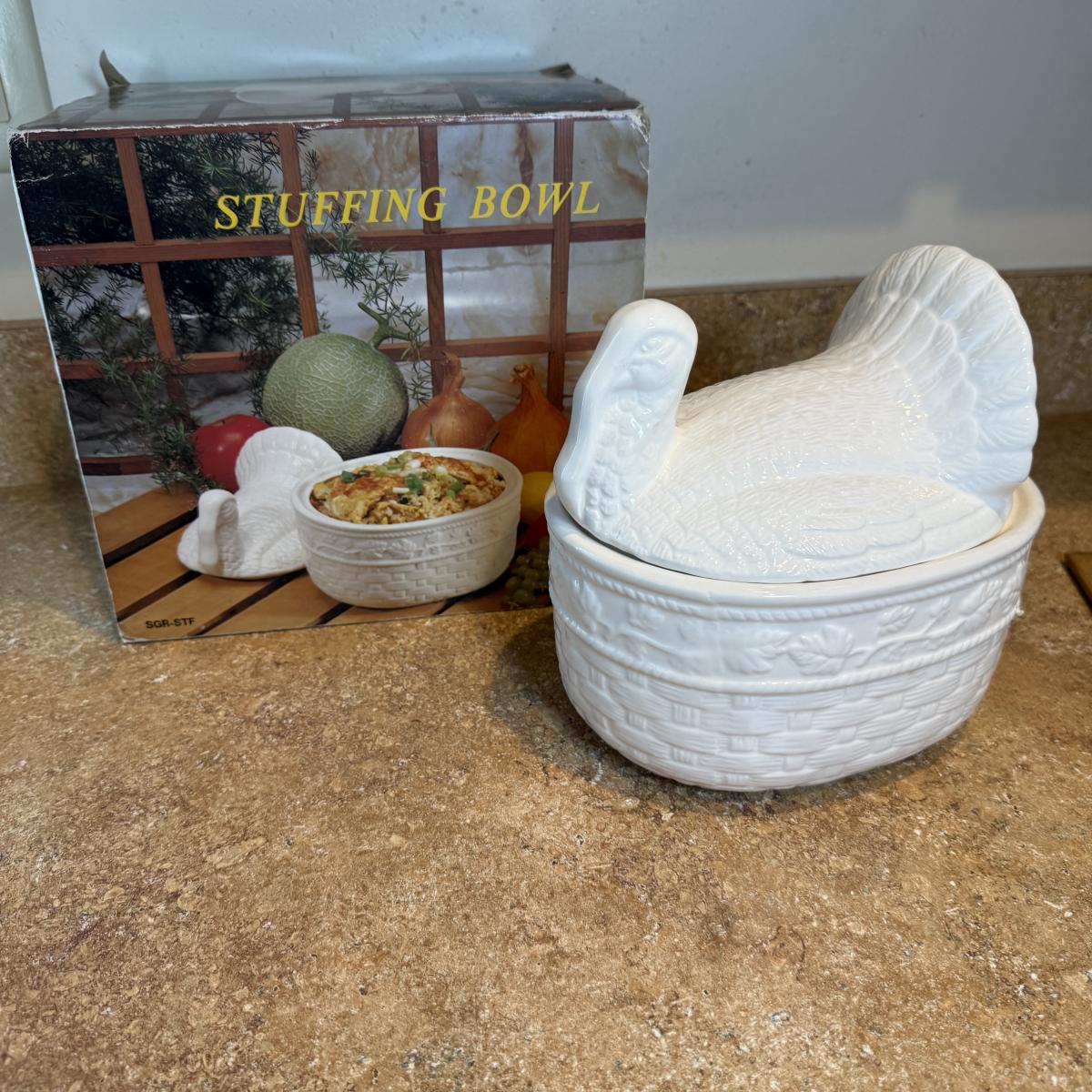 LOT 39: Fall Entertaining/ Serving Must Haves - Turkey Gravy Boat and Covered Stuffing Dish. Autumn Biscotti Jar, Carving Set, Leave Shaped Dishes and More