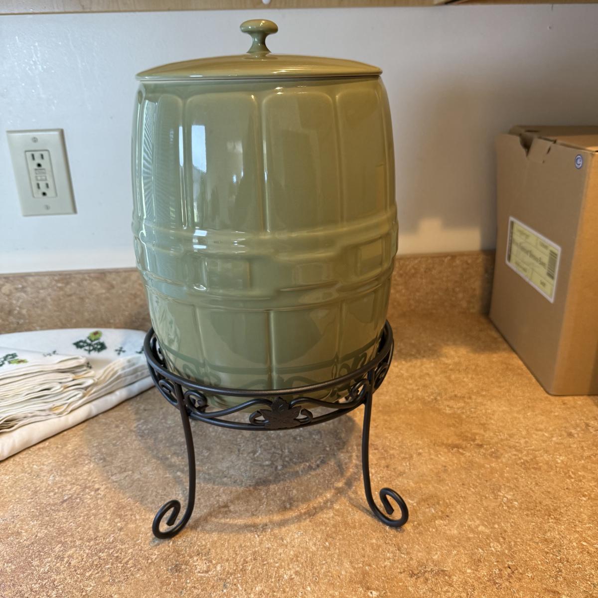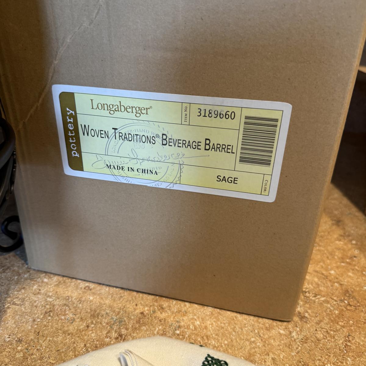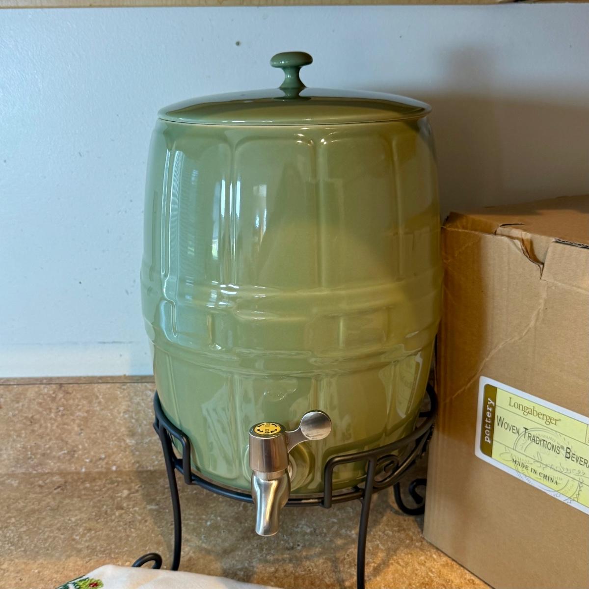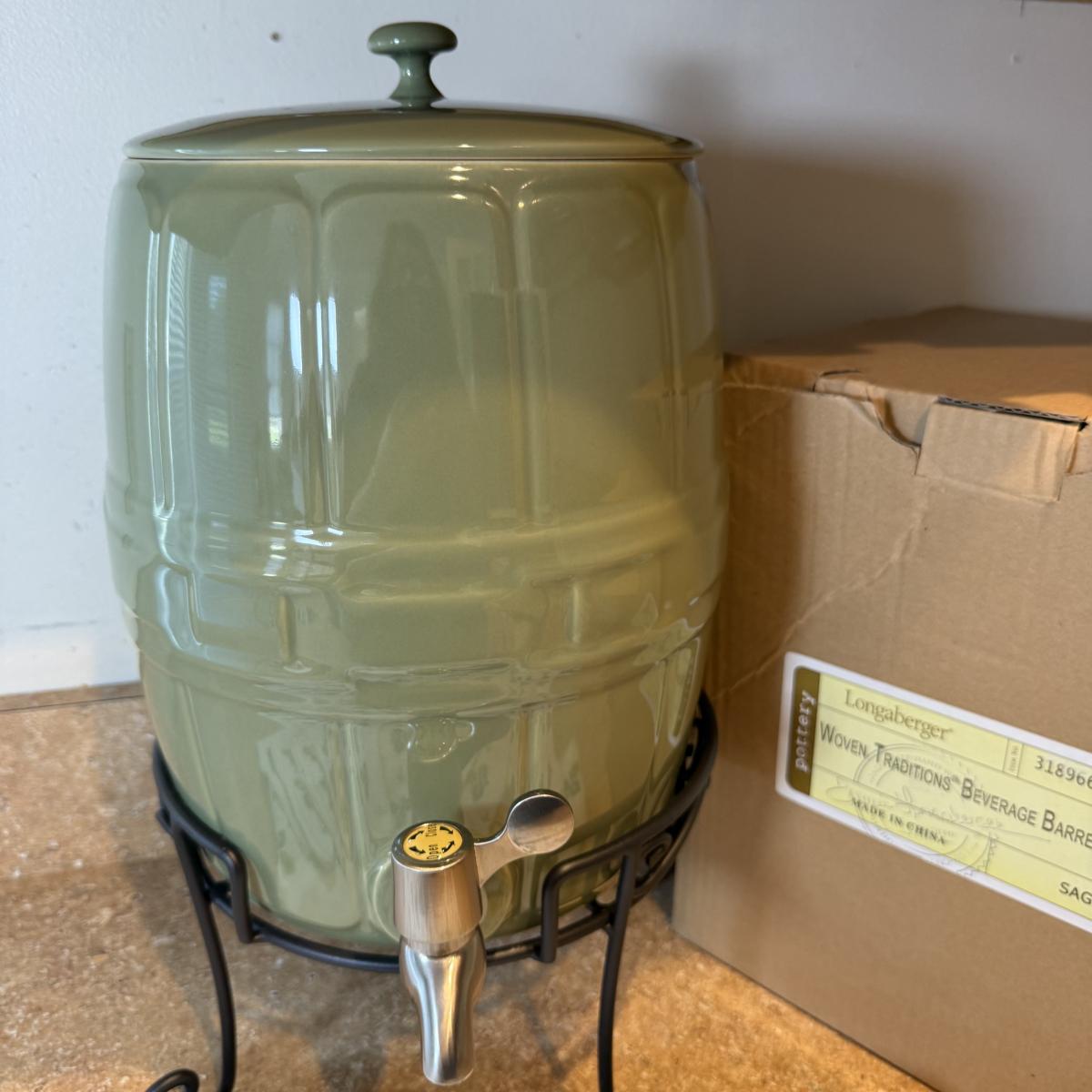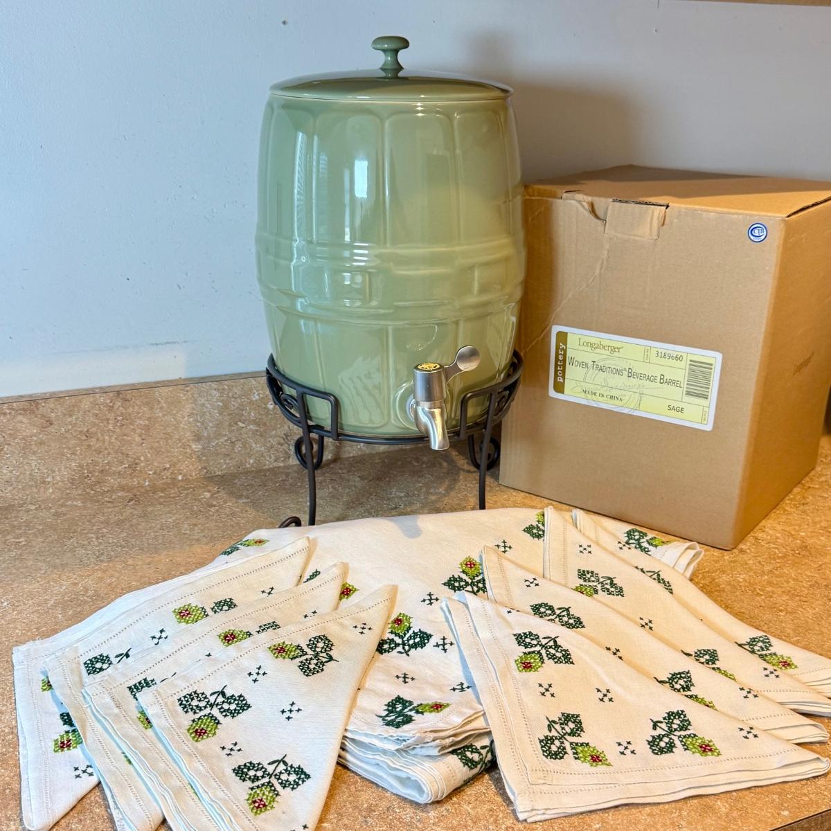 LOT 40: Longaberger Woven Traditions Ceramic Beverage Barrel and Stand with Embroidered Table Linens