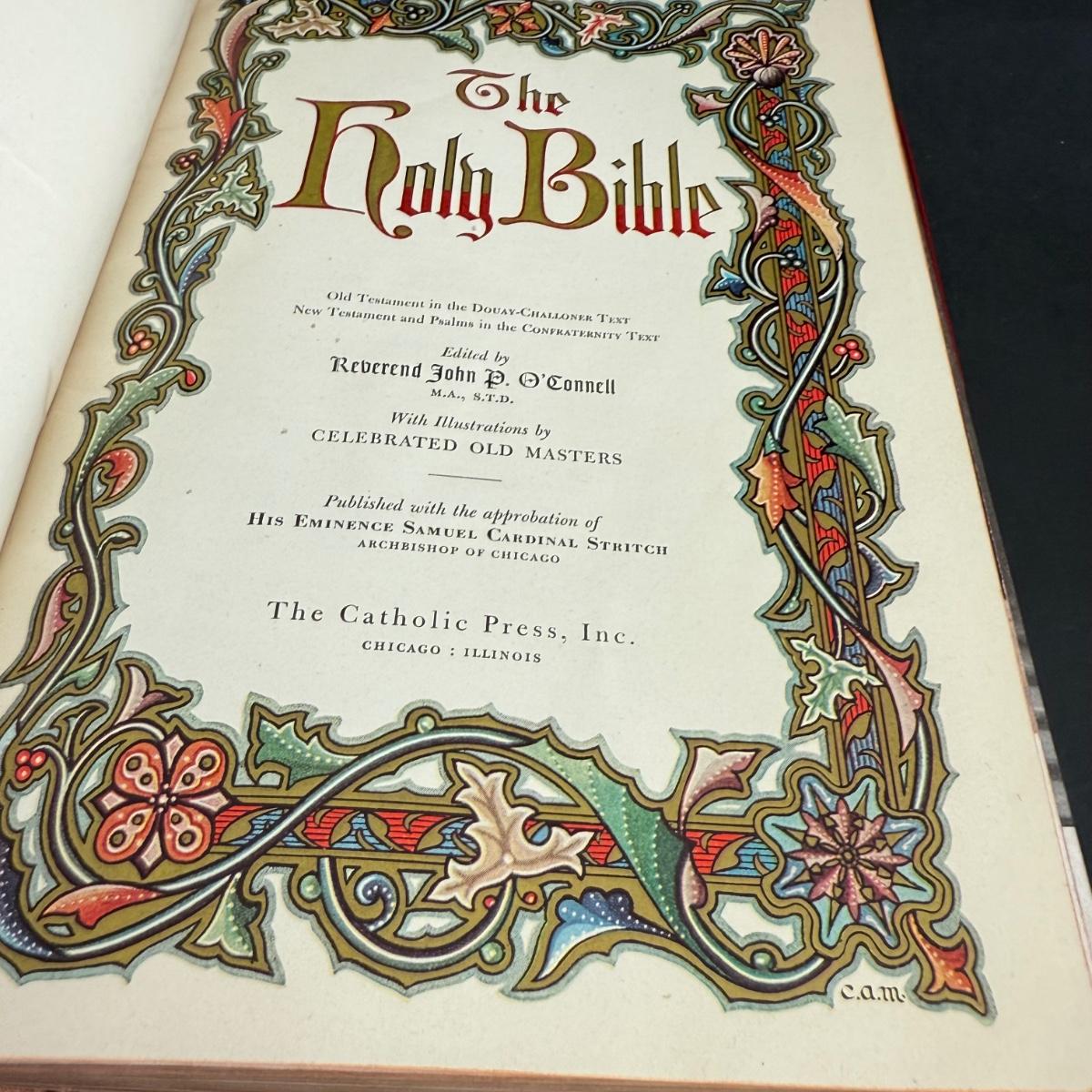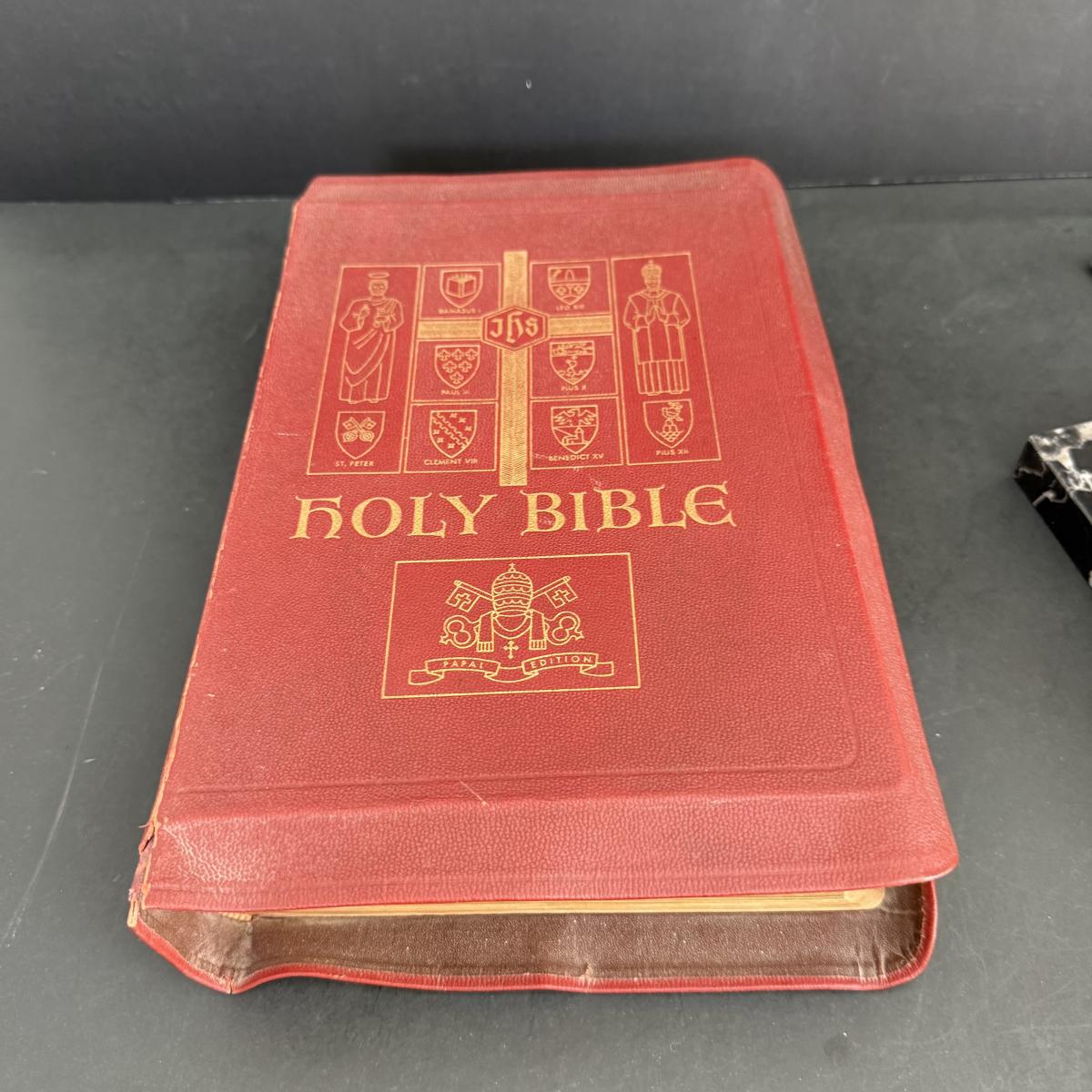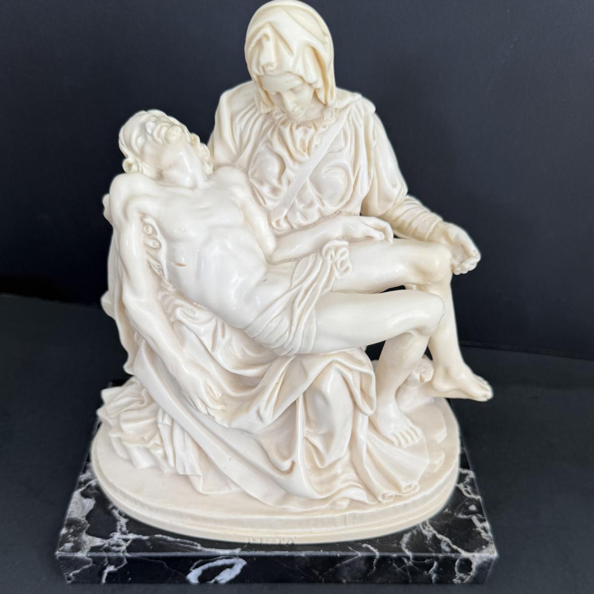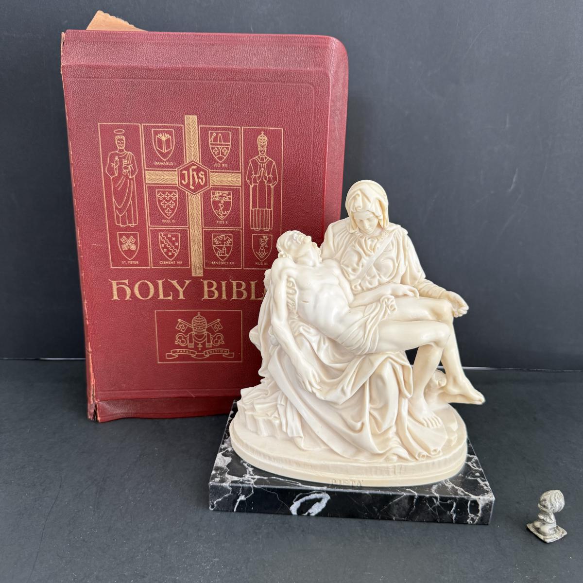 LOT 47: Vintage Santino Marble Based Depiction of Michelangelo’s Pieta (Mary and Jesus), Vintage Bible and Miniature Pewter Praying Child