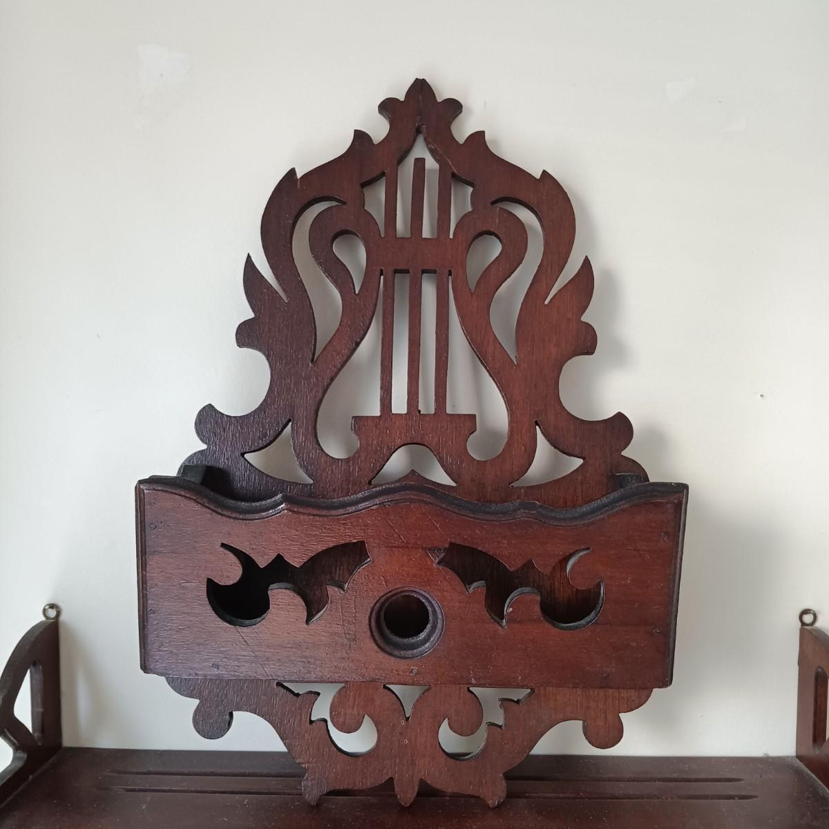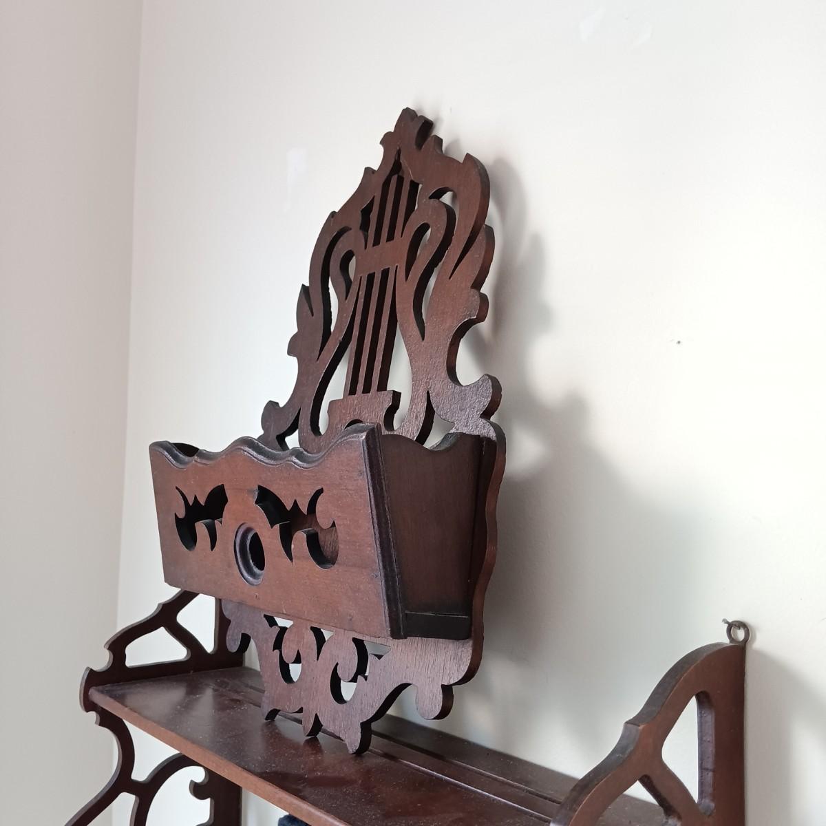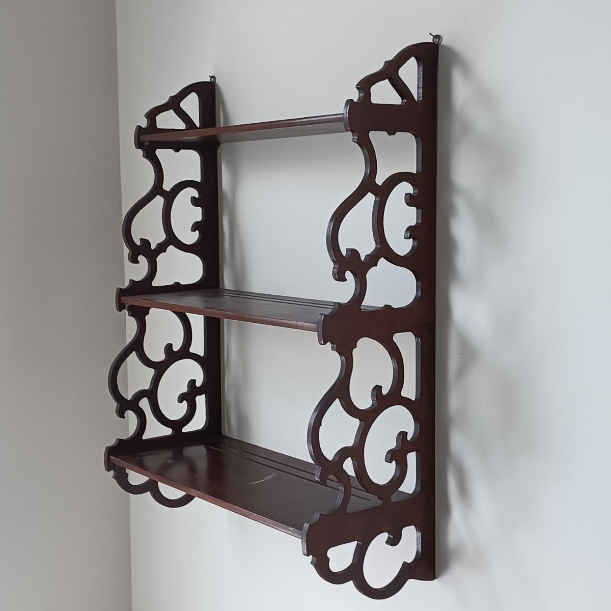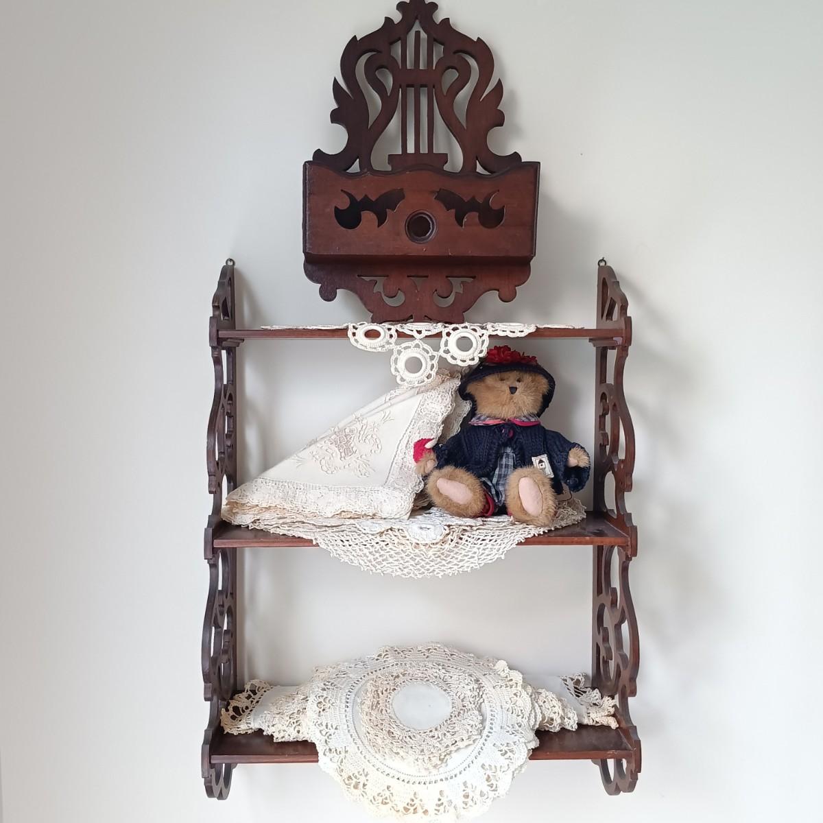 LOT 54: Victorian-Style Wall Shelf with Crocheted Linens, a Small Scrollwork Shelf & Teddy Bear
