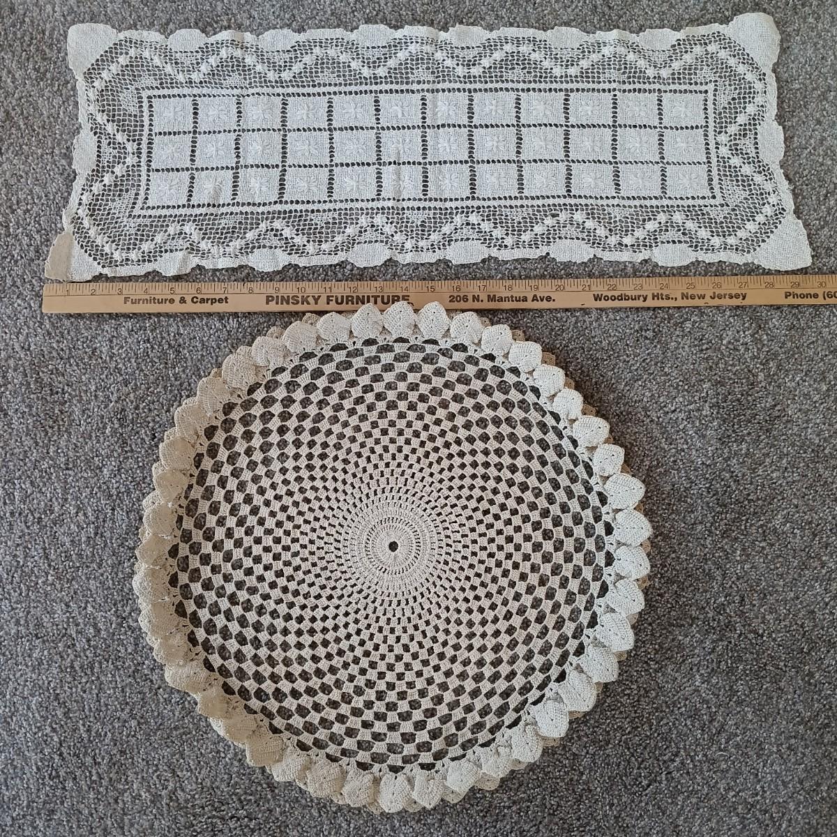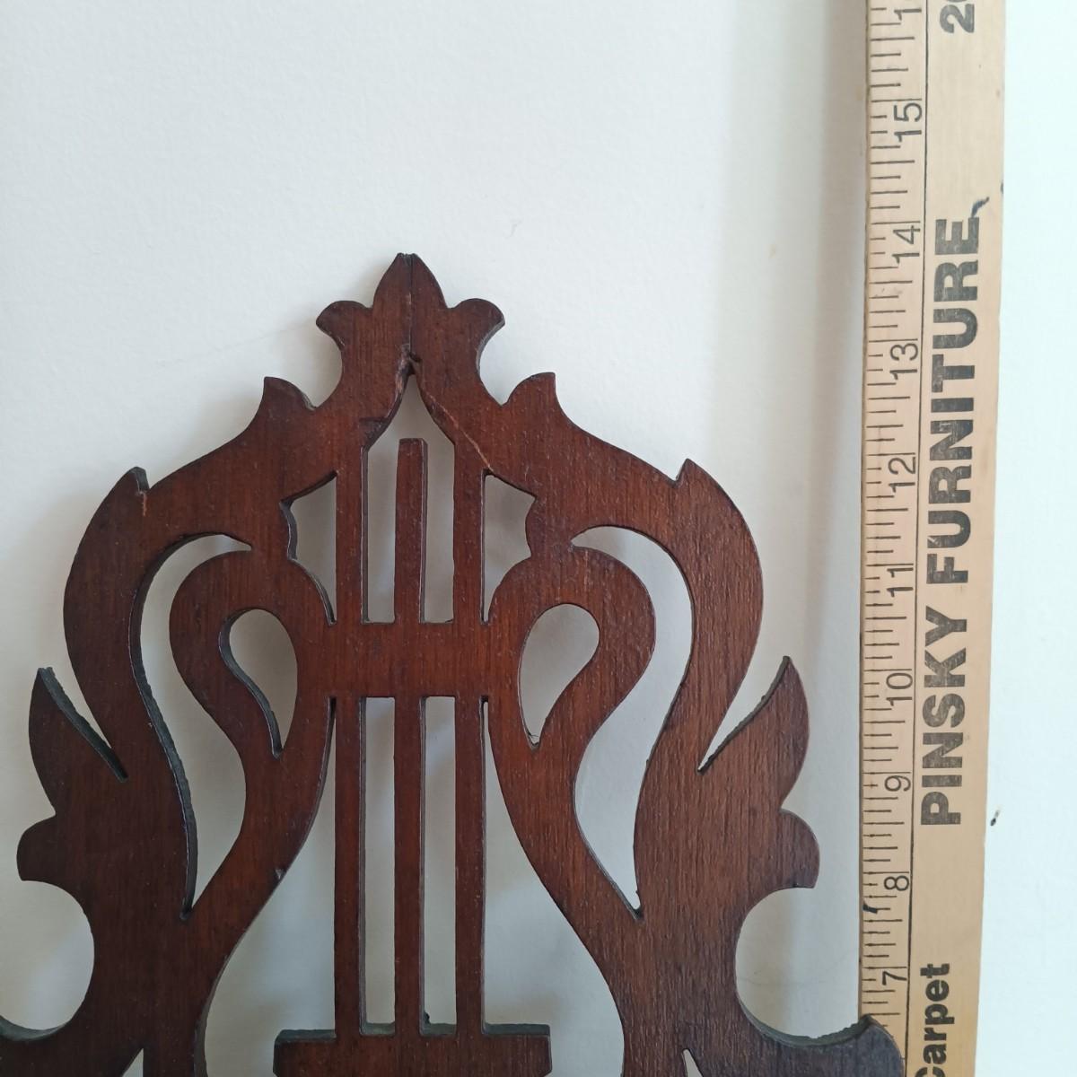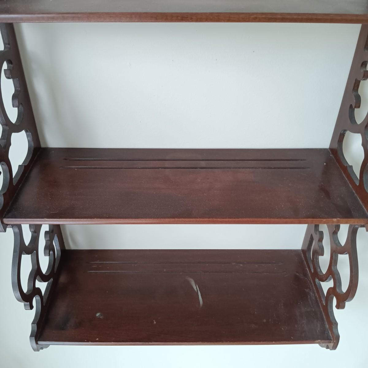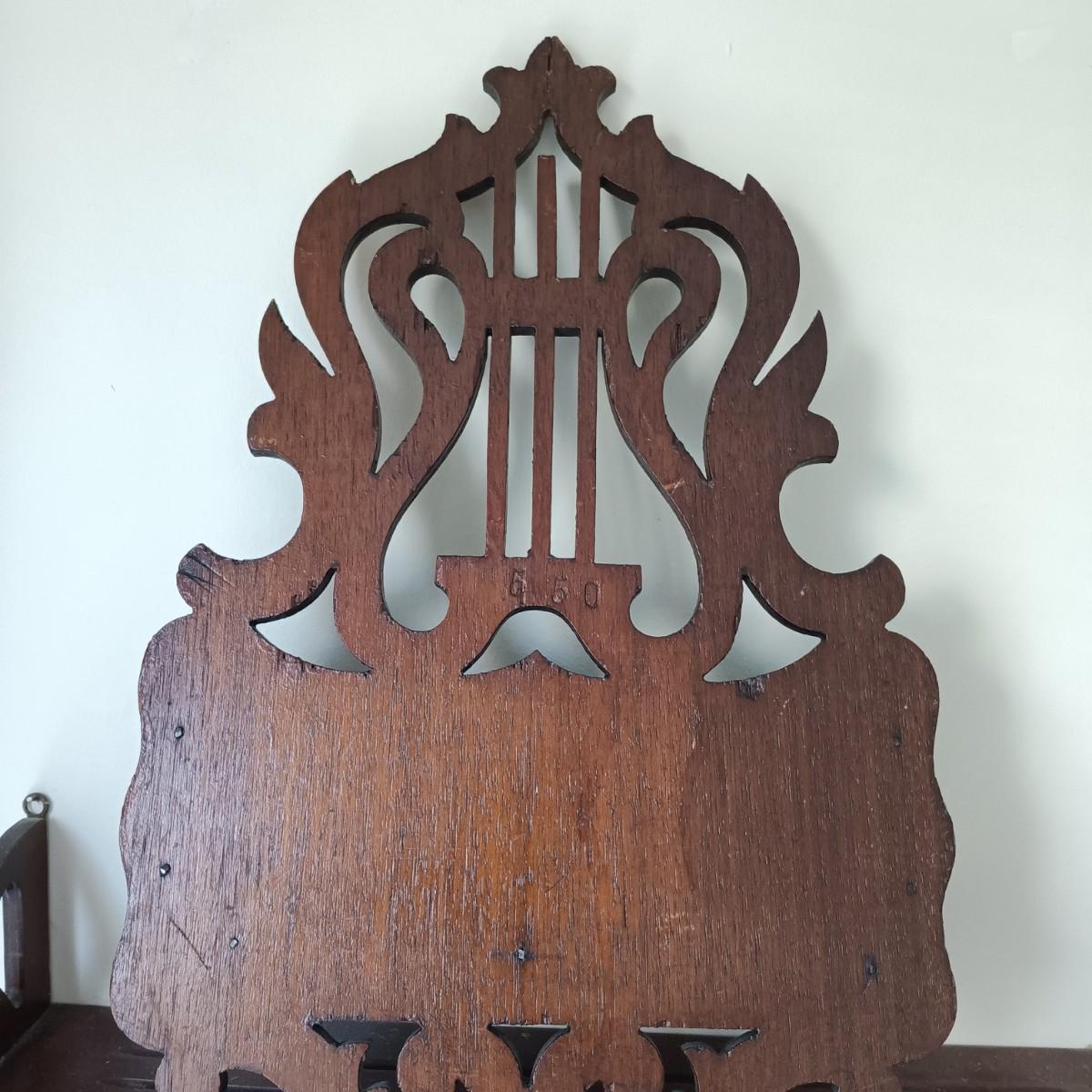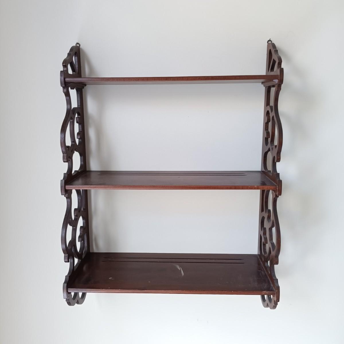 LOT 54: Victorian-Style Wall Shelf with Crocheted Linens, a Small Scrollwork Shelf & Teddy Bear