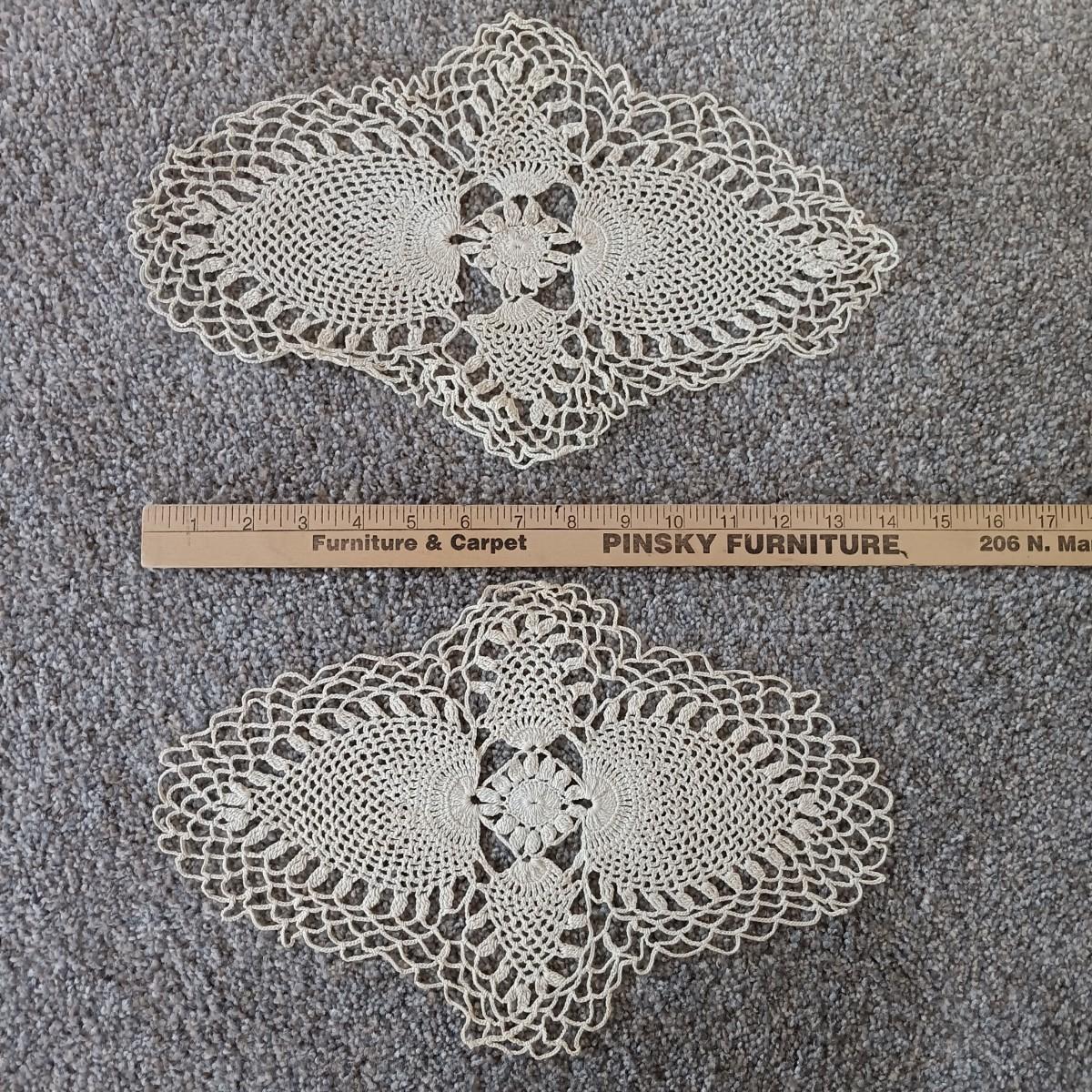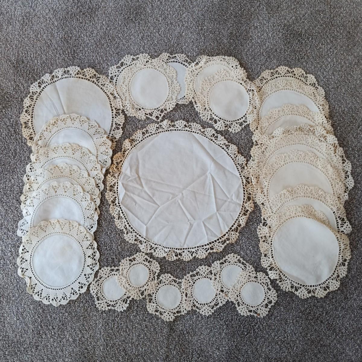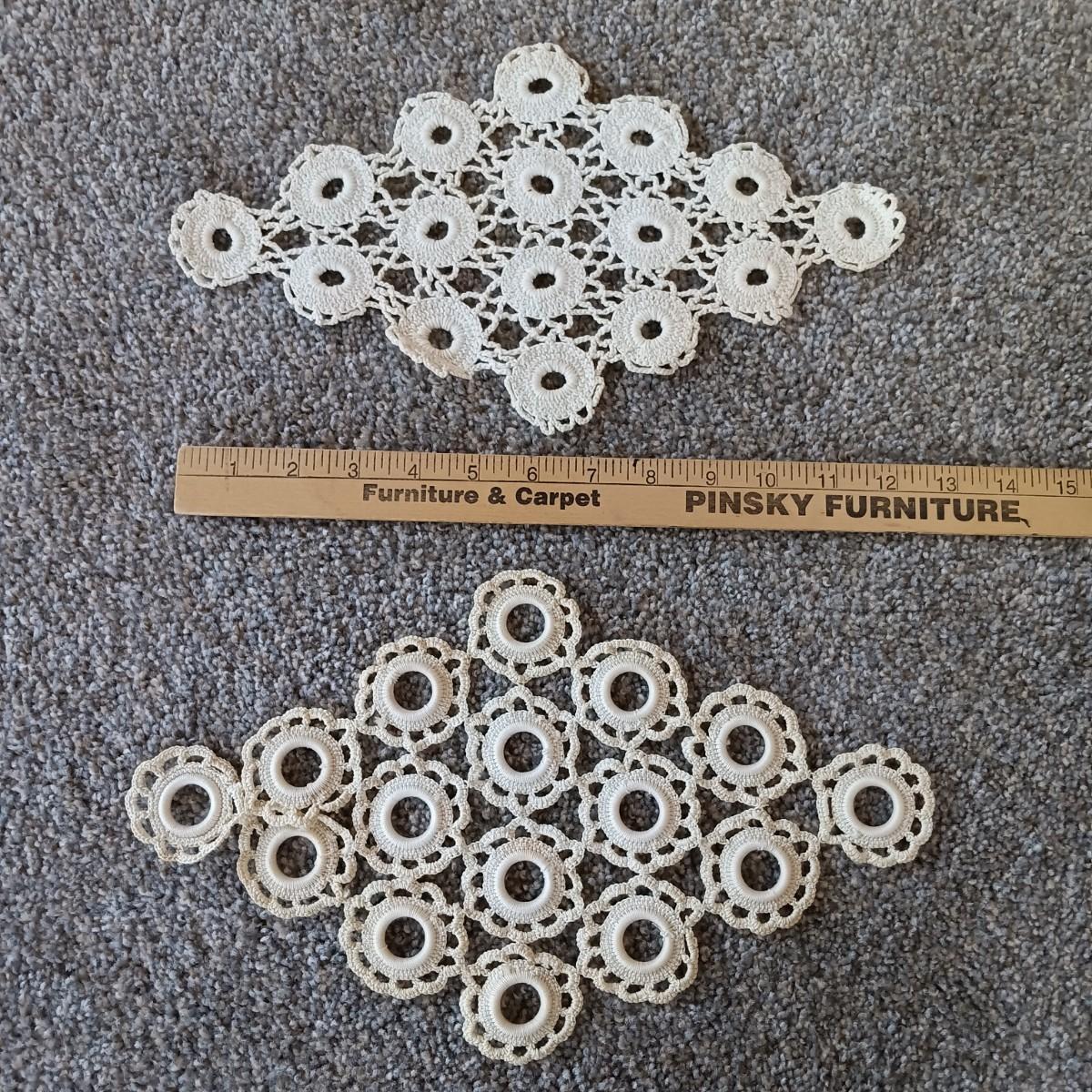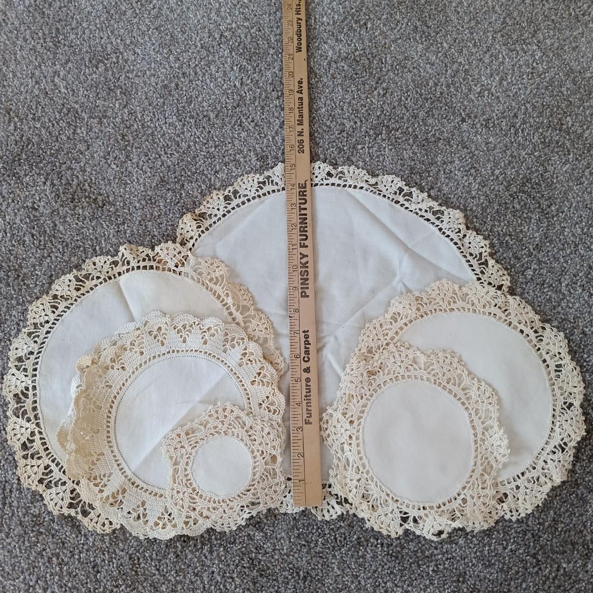 LOT 54: Victorian-Style Wall Shelf with Crocheted Linens, a Small Scrollwork Shelf & Teddy Bear