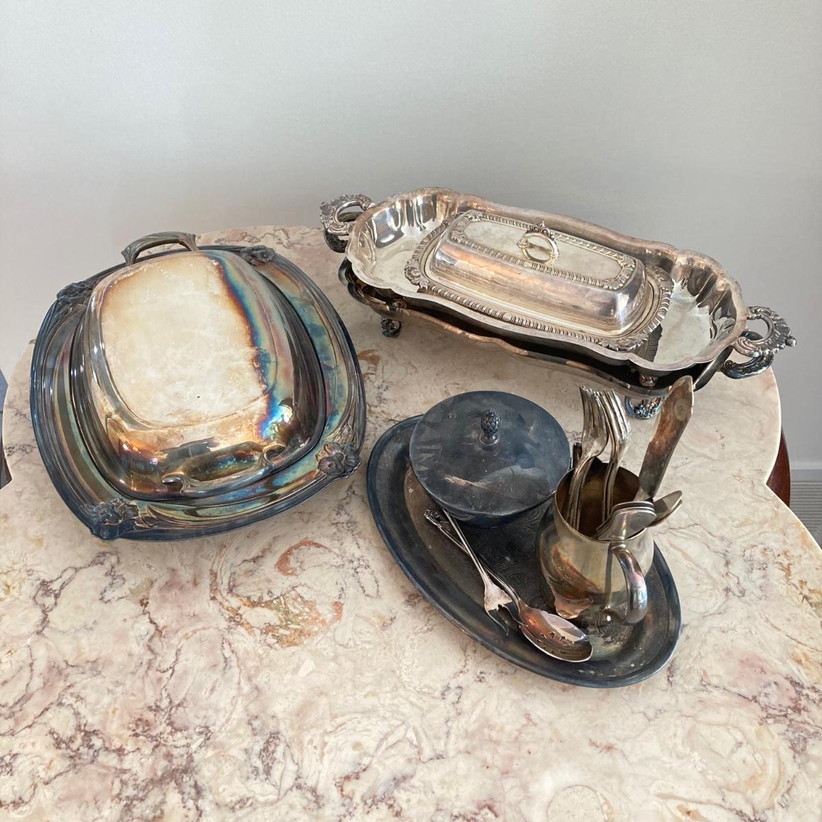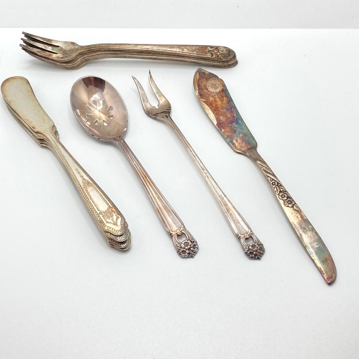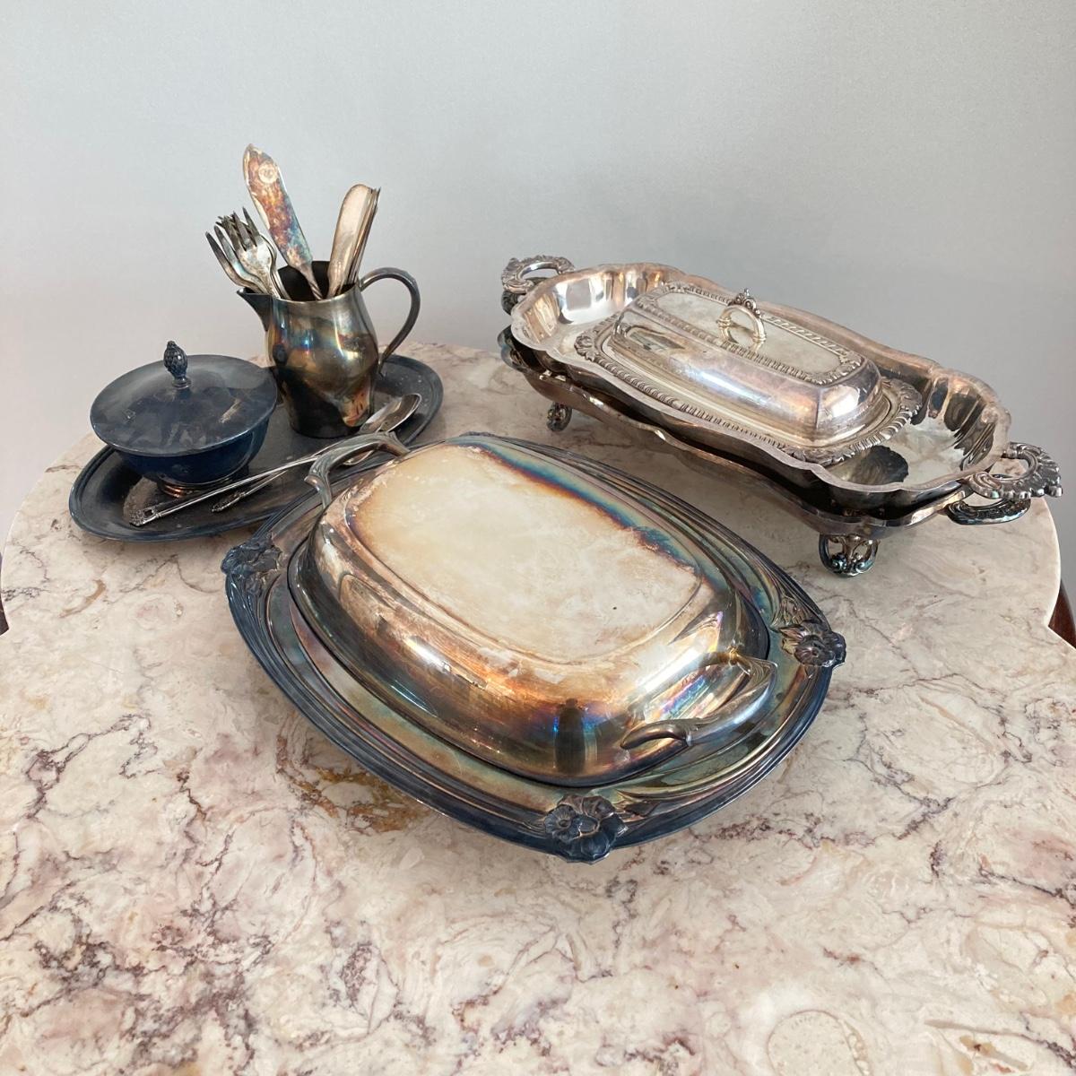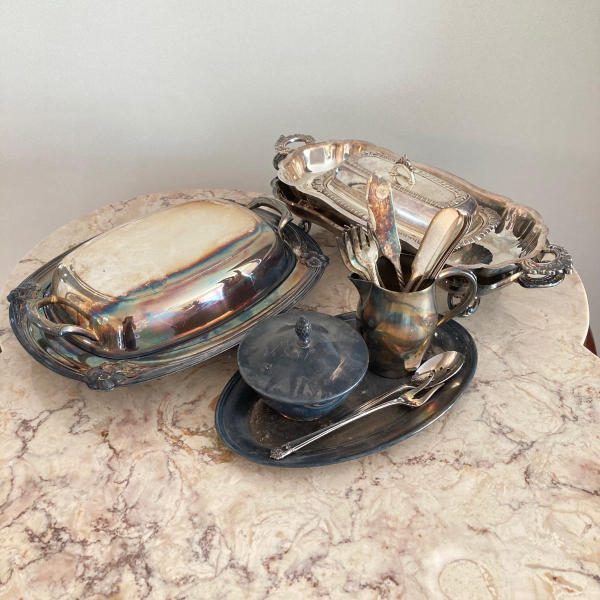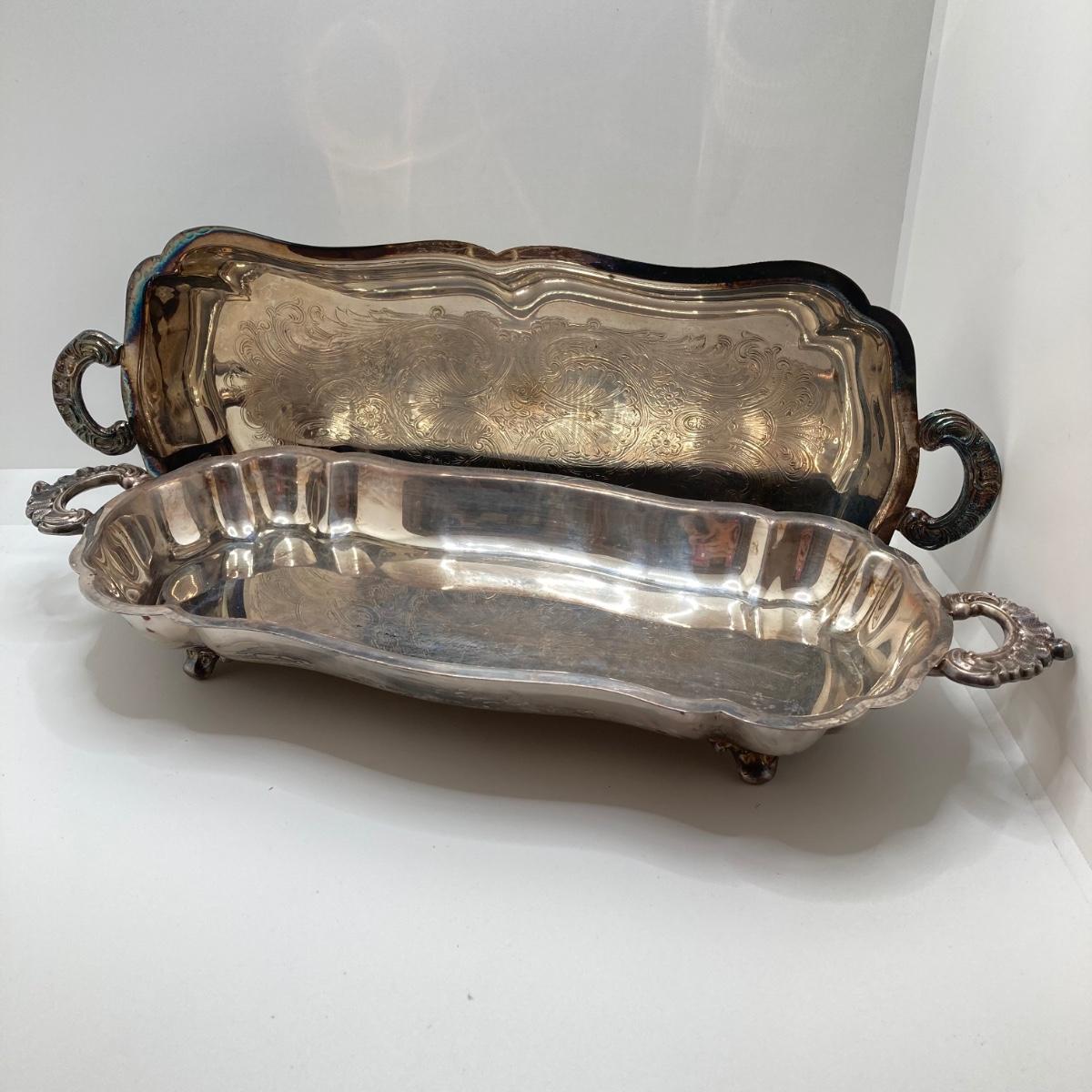 LOT 56: Silver Plated Serving Collection - Trays, Butter Dish, Flatware and More