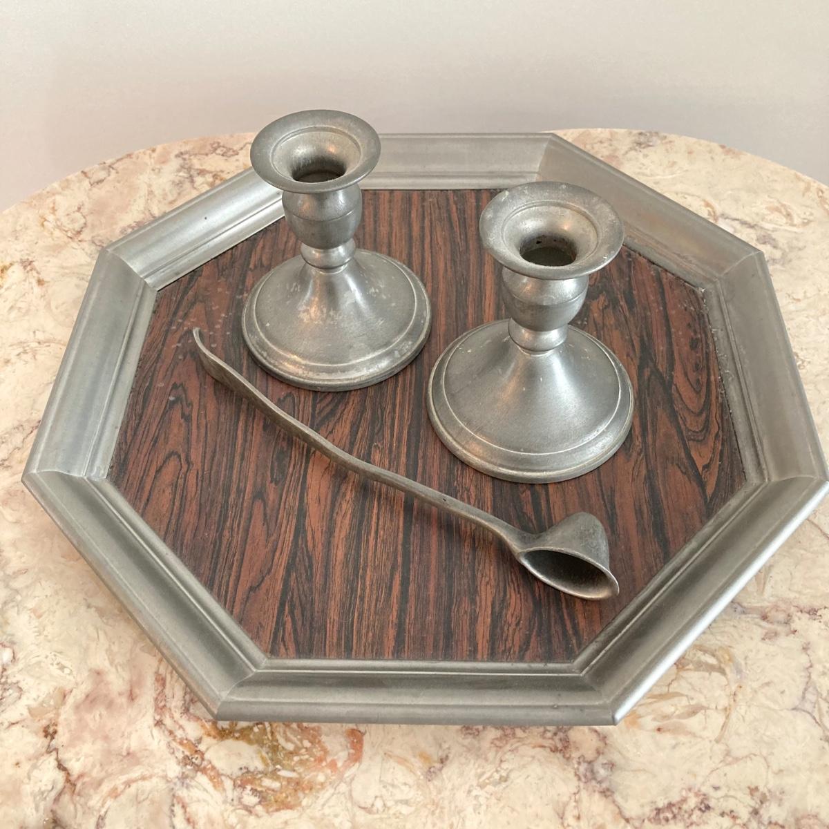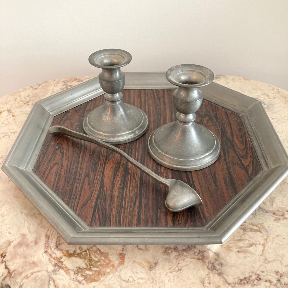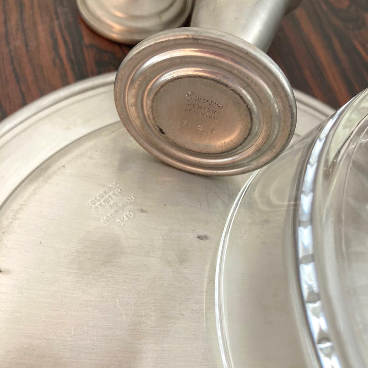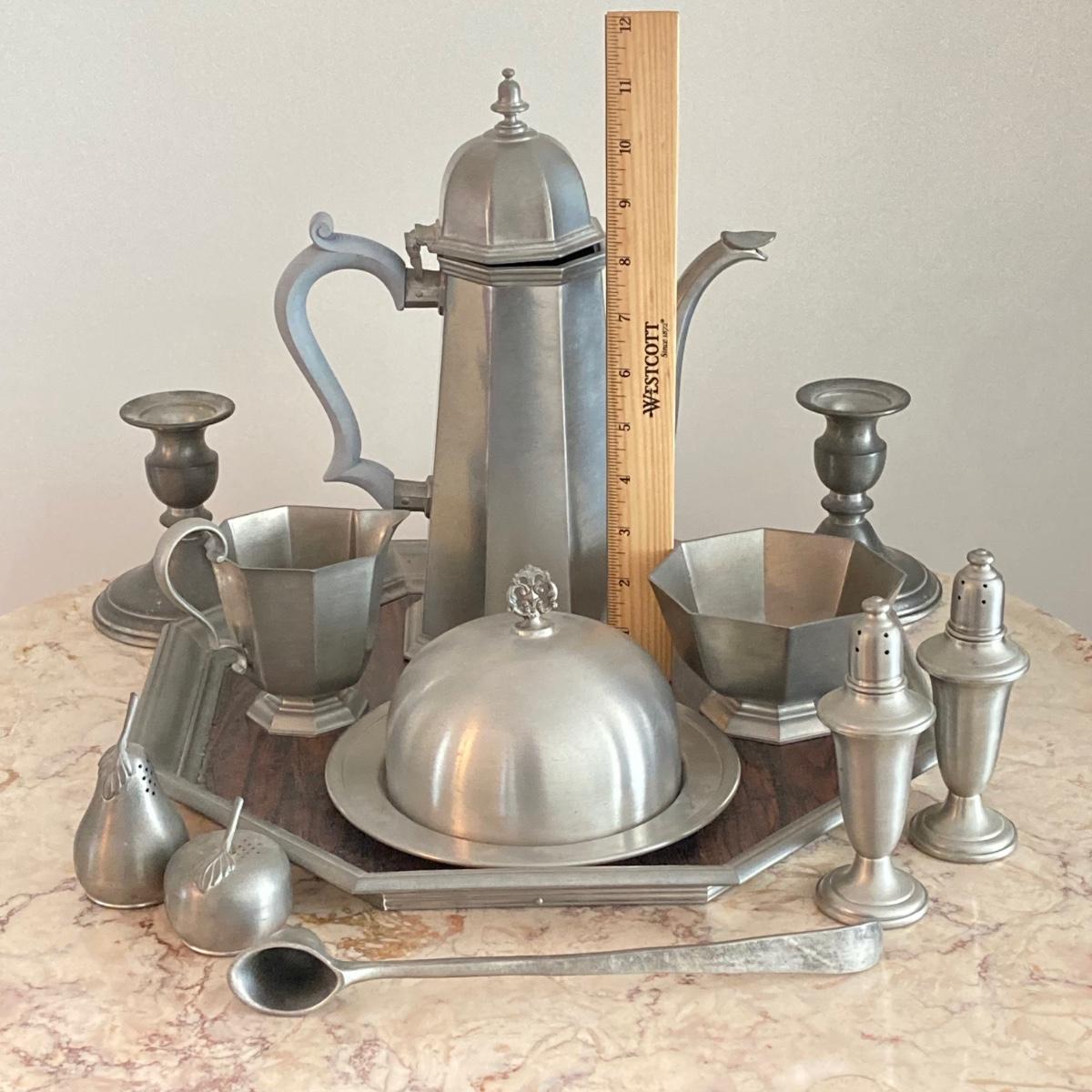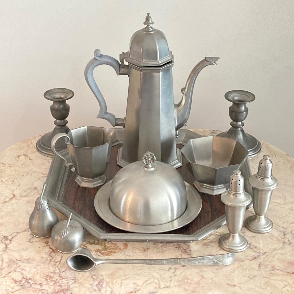 LOT 60: Large Collection of Pewter Serving Pieces, Candlestick Holders and More