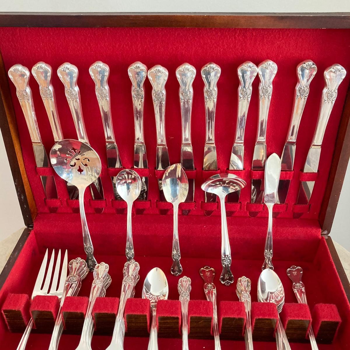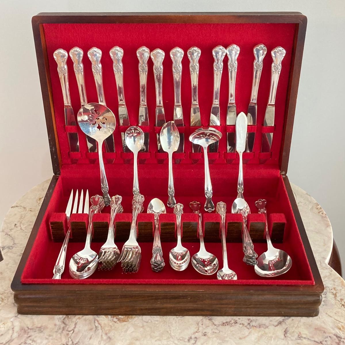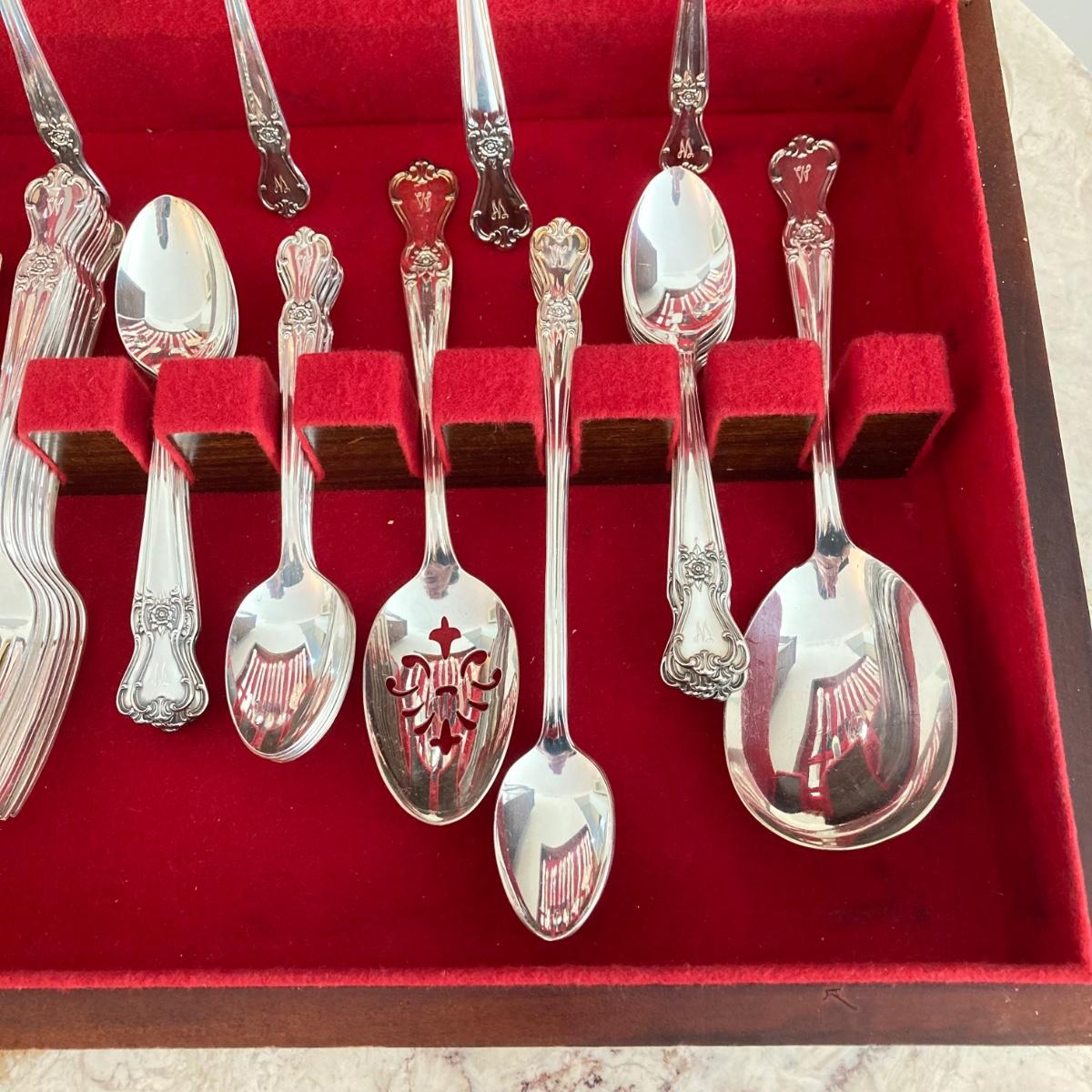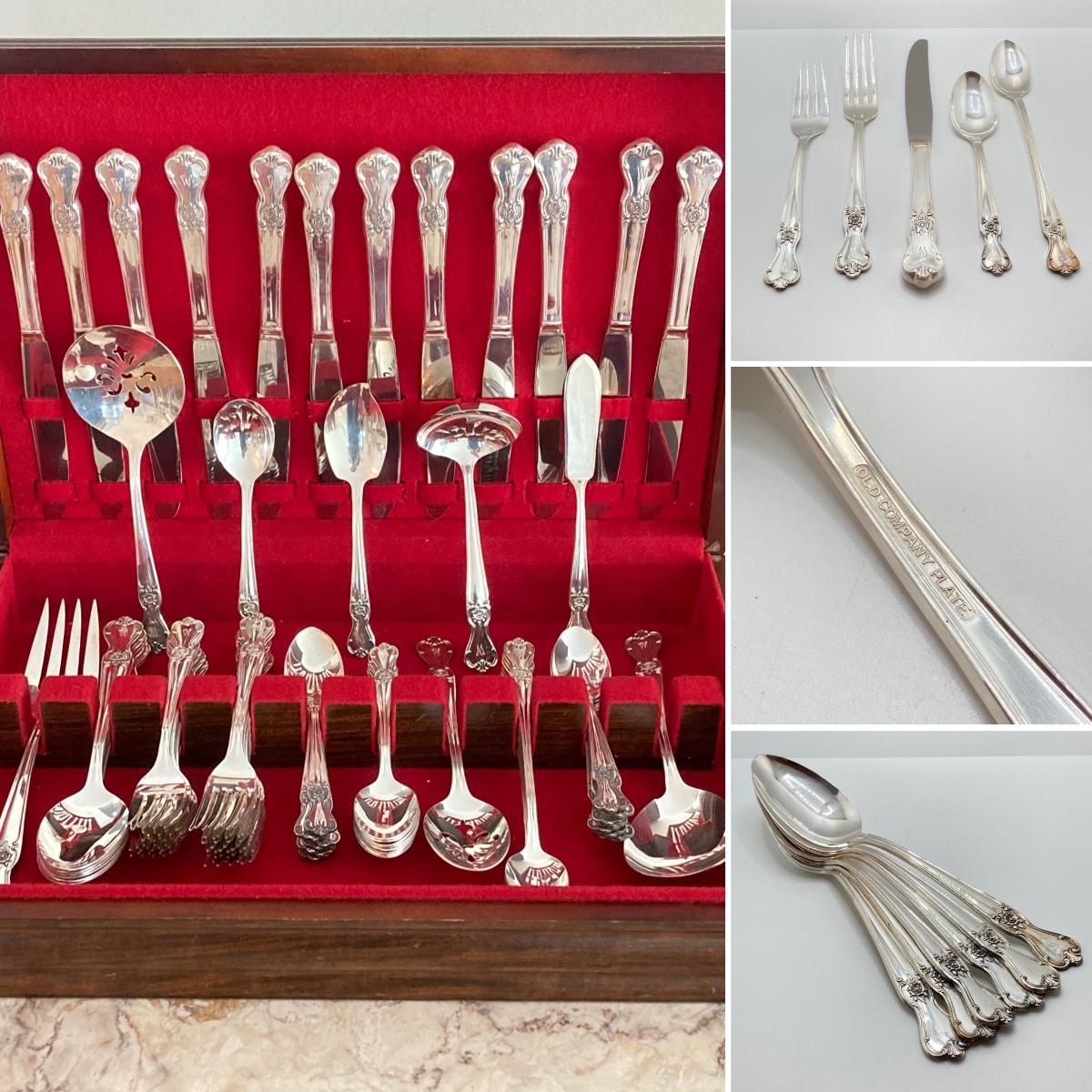 LOT 61: Monogrammed Old Company Silver Plated Flatware in Wooden Storage Box