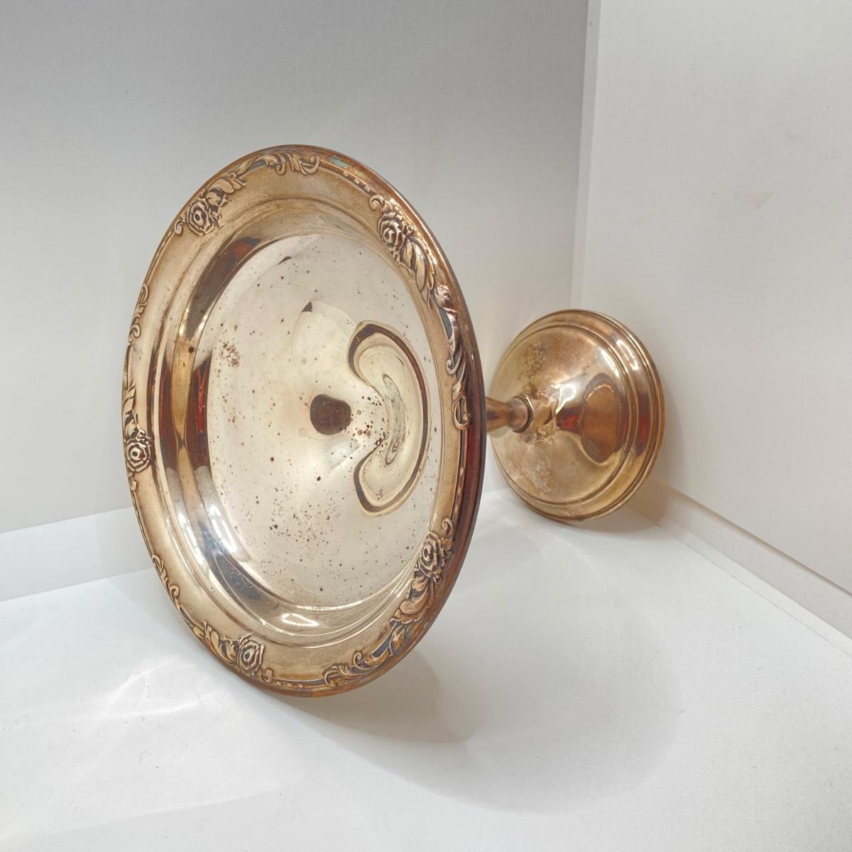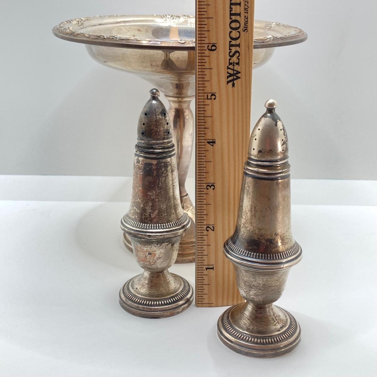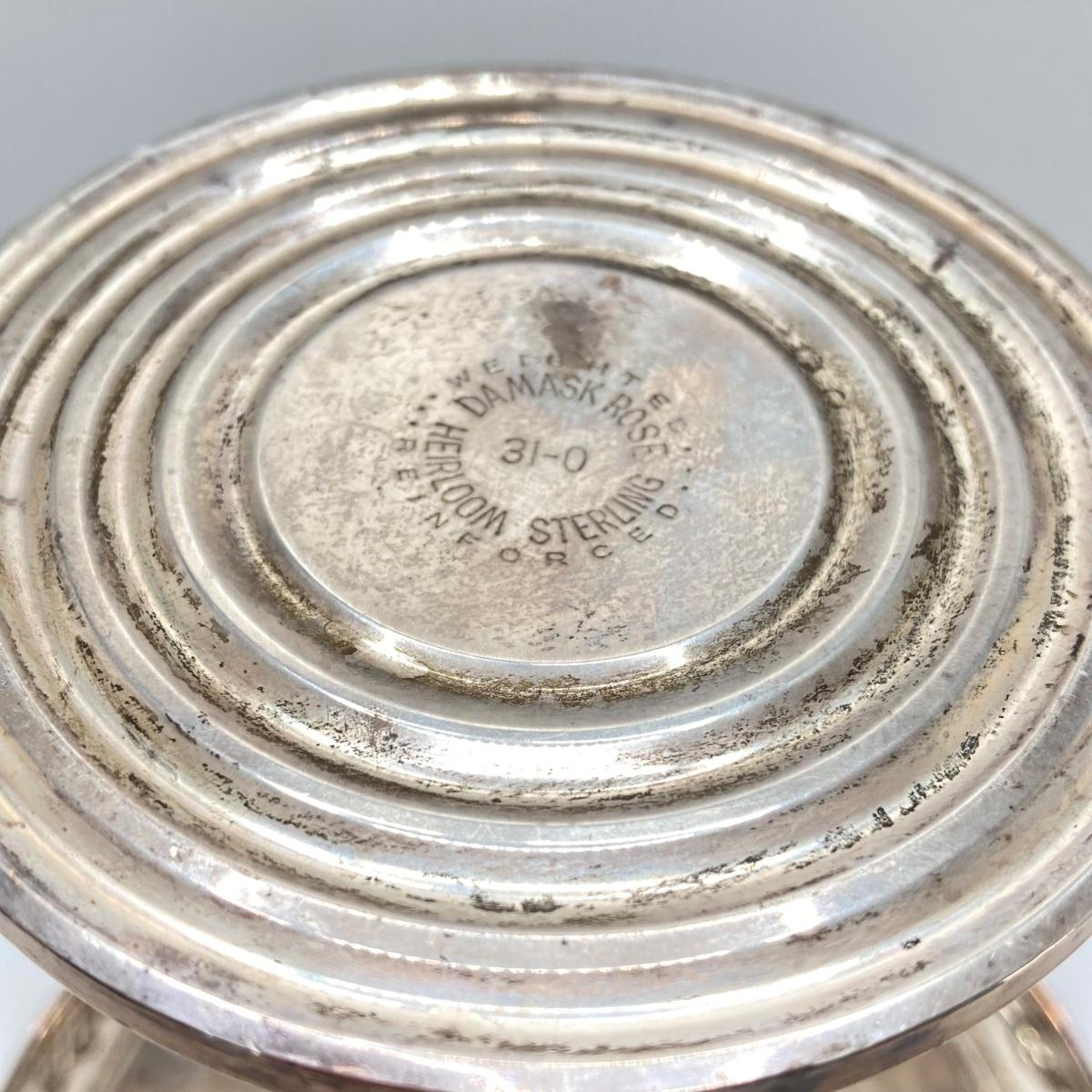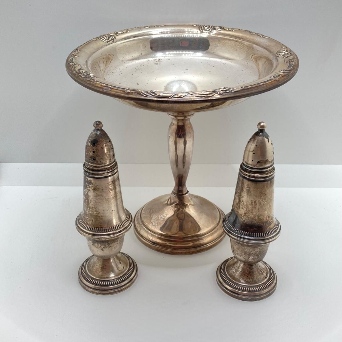 LOT 65: Damask Rose Heirloom Weighted Reinforced Sterling Pedestal Bowl and Crown Weighted Sterling Salt and Pepper Shakers