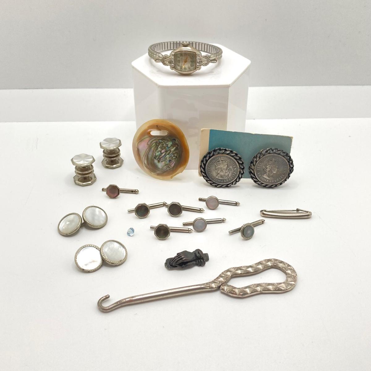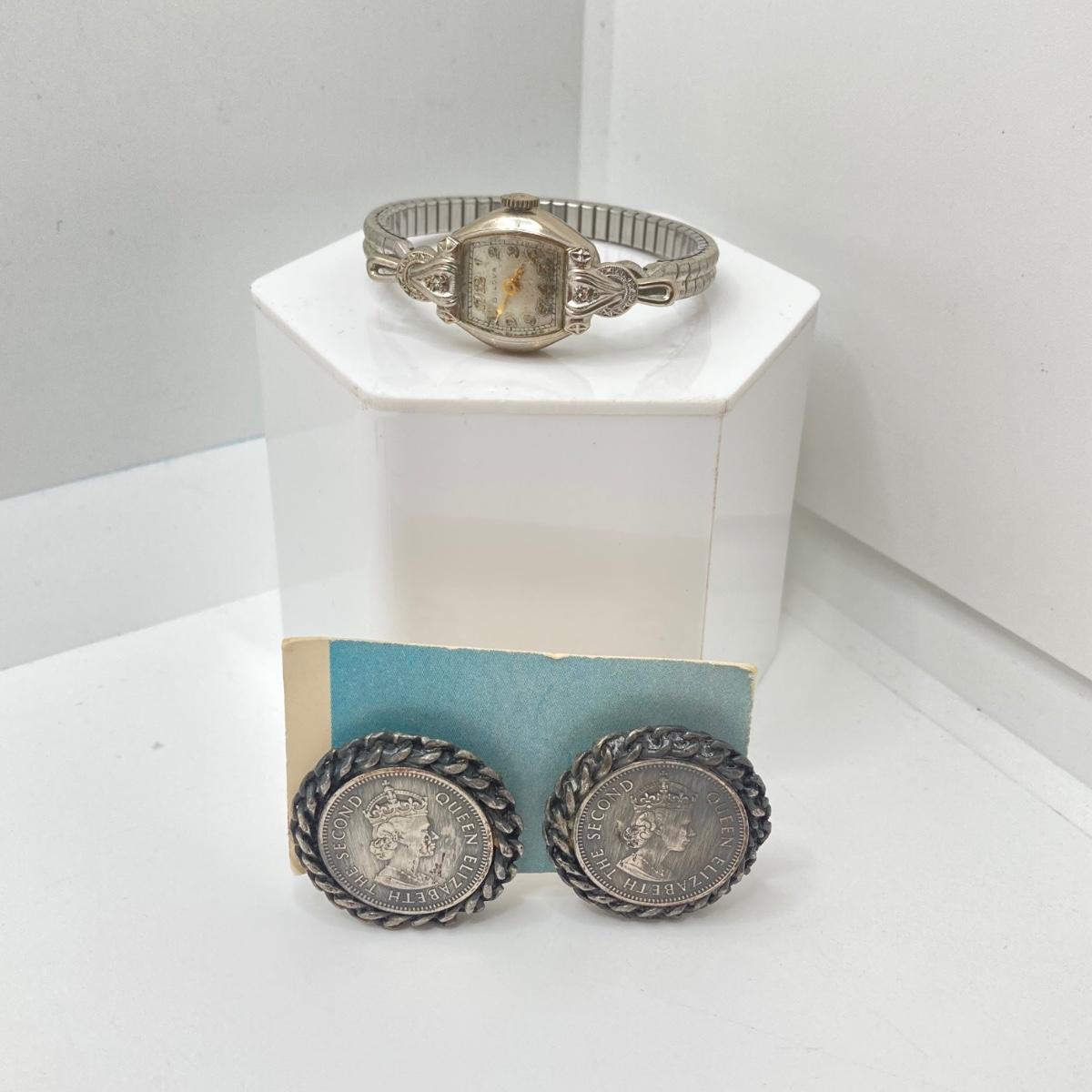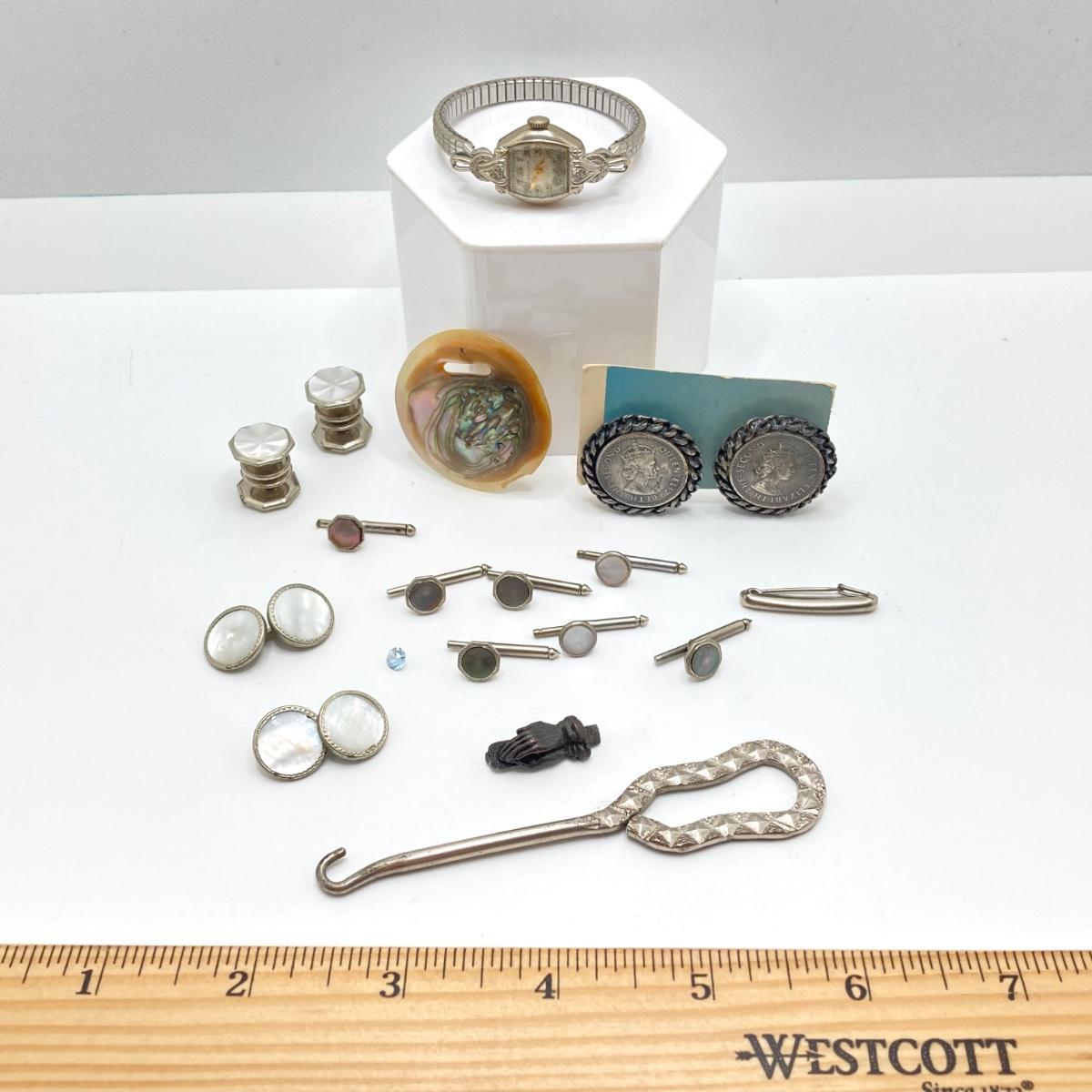 LOT 69: Vintage Jewelry and Accessories - Swiss Bulova Ladies Watch 10K Gold Filled, Queen Elizabeth The Second Clip-on Earrings, Abalone Pendant, Mother of Pearl Buttons and More