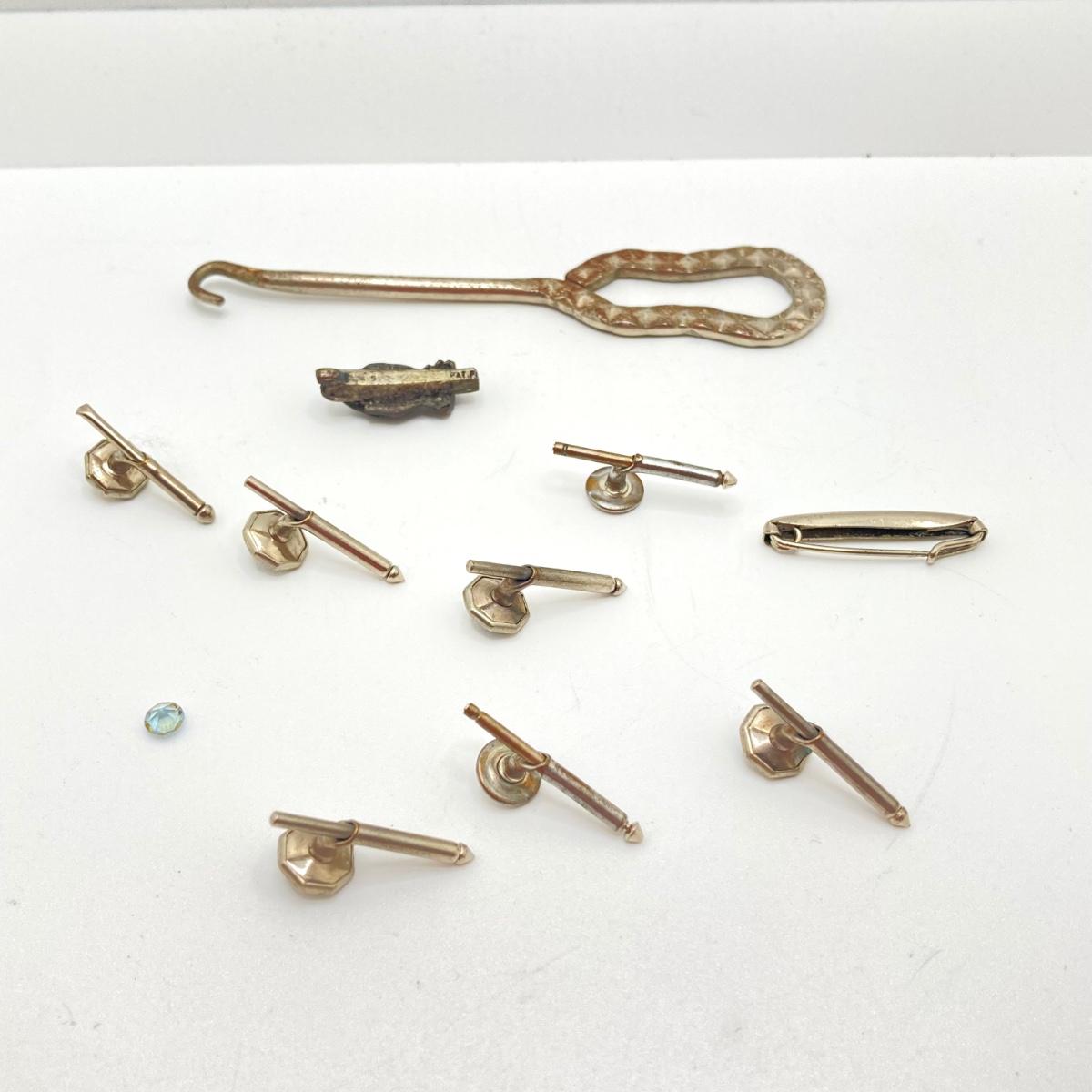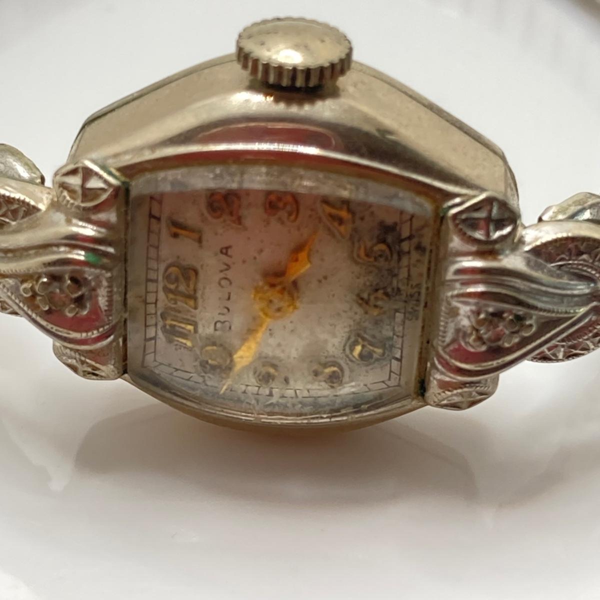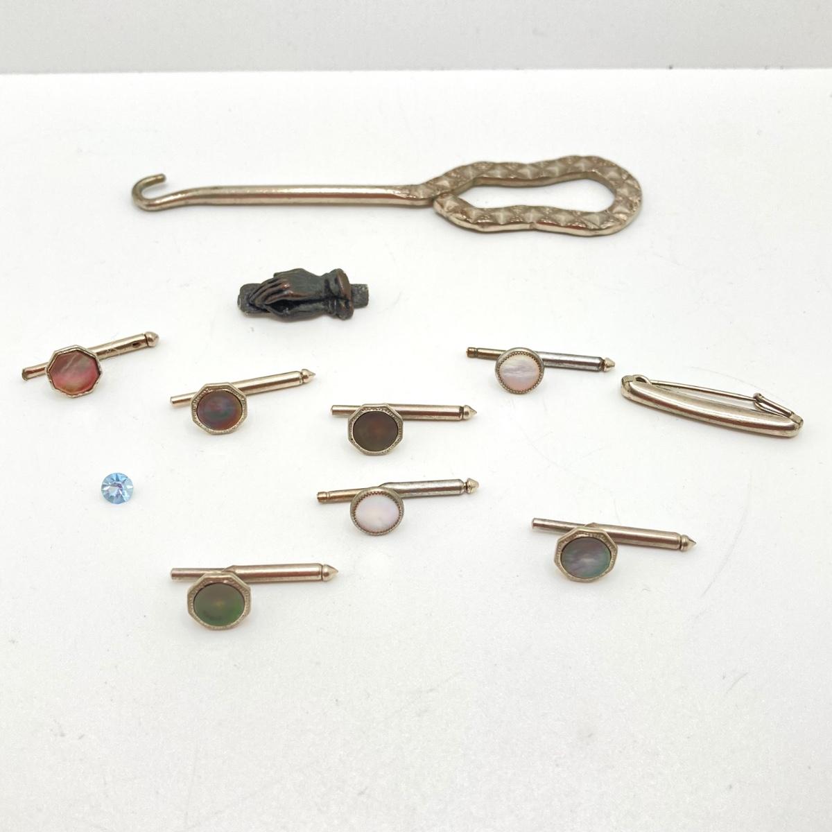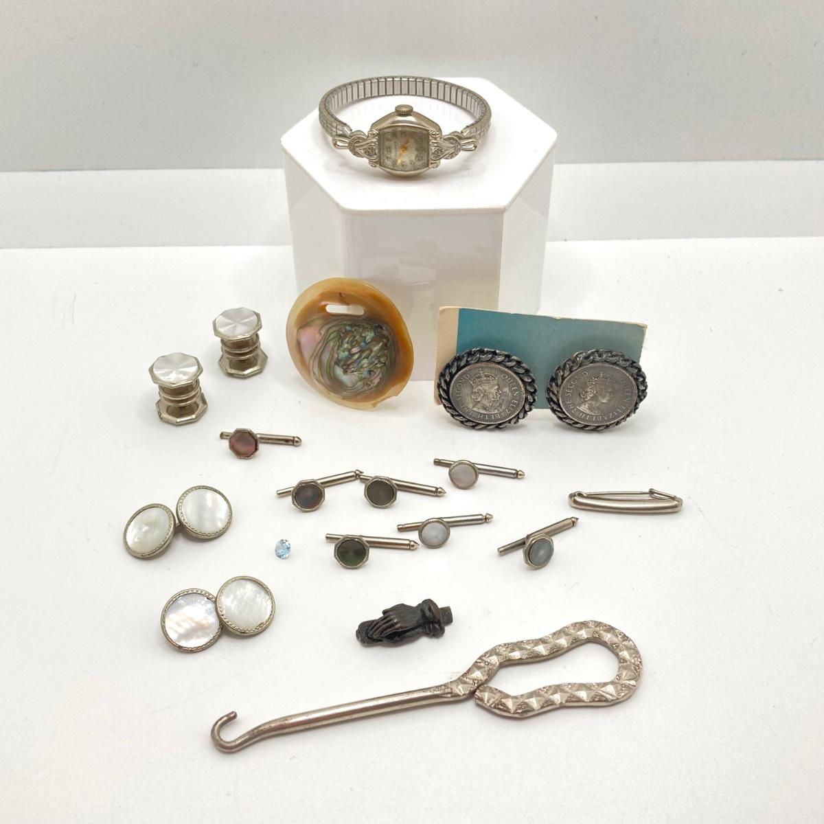 LOT 69: Vintage Jewelry and Accessories - Swiss Bulova Ladies Watch 10K Gold Filled, Queen Elizabeth The Second Clip-on Earrings, Abalone Pendant, Mother of Pearl Buttons and More