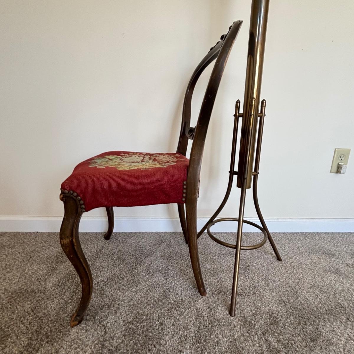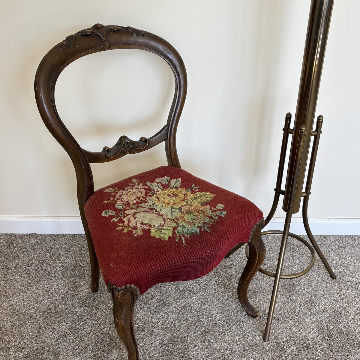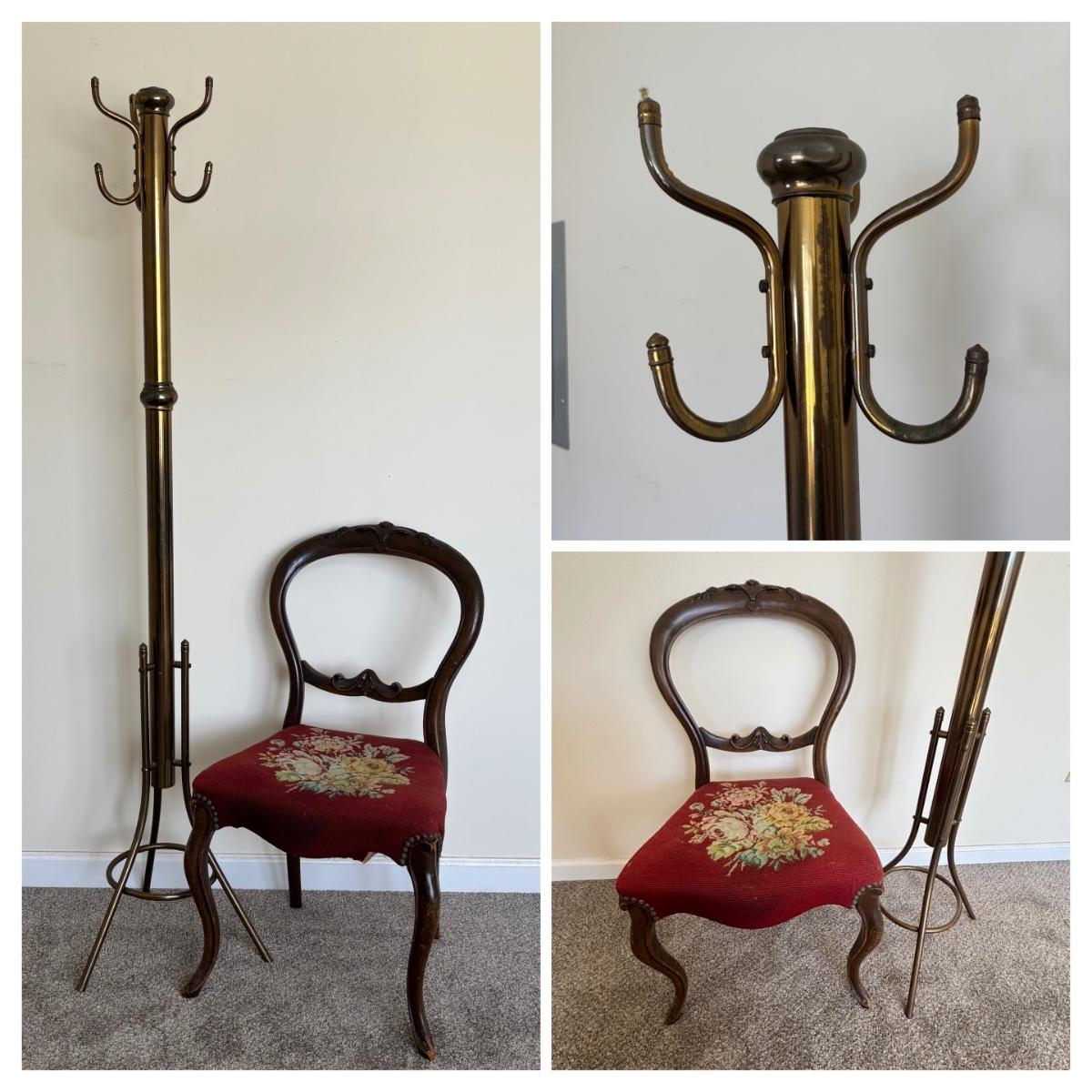LOT 85: Vintage Victorian Chair w/Needlepoint Seat along with a Brass Coat Rack