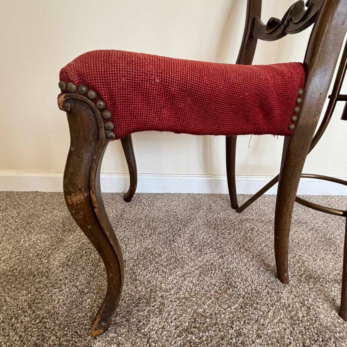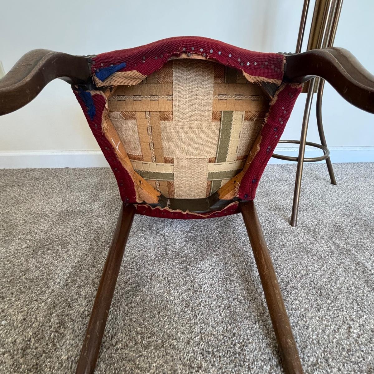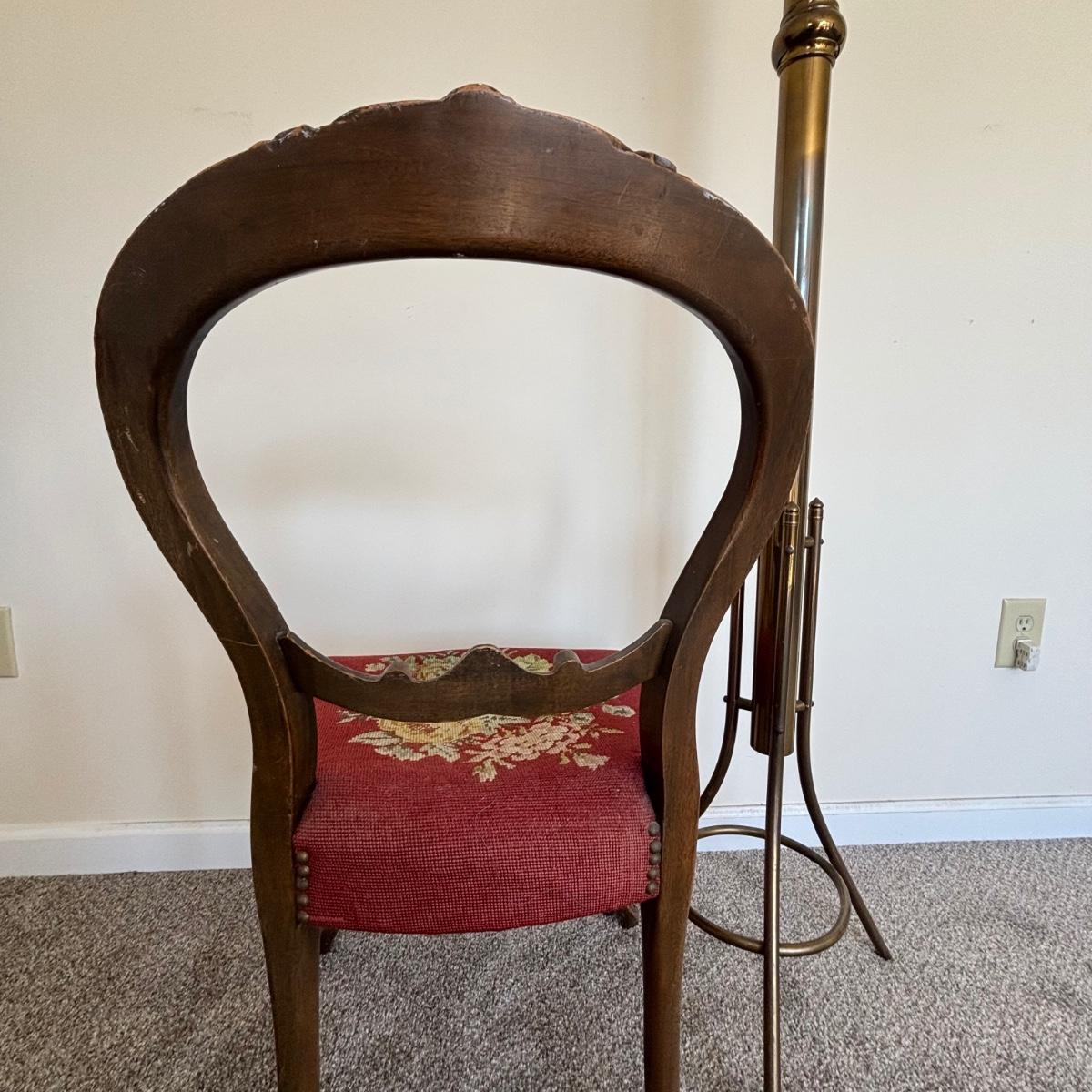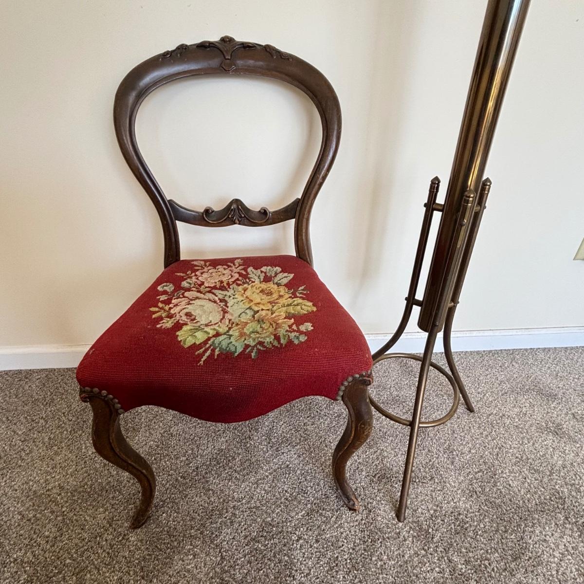 LOT 85: Vintage Victorian Chair w/Needlepoint Seat along with a Brass Coat Rack