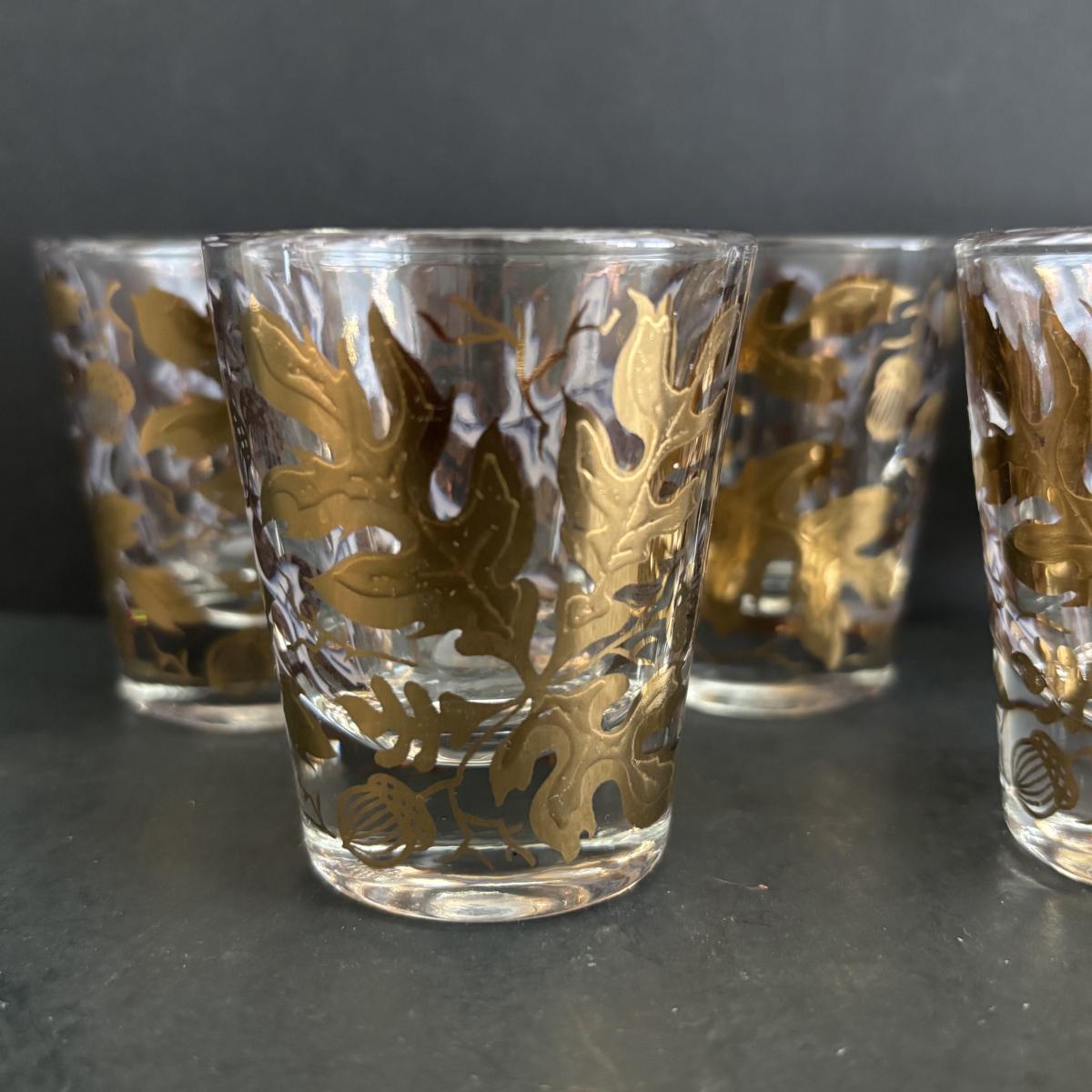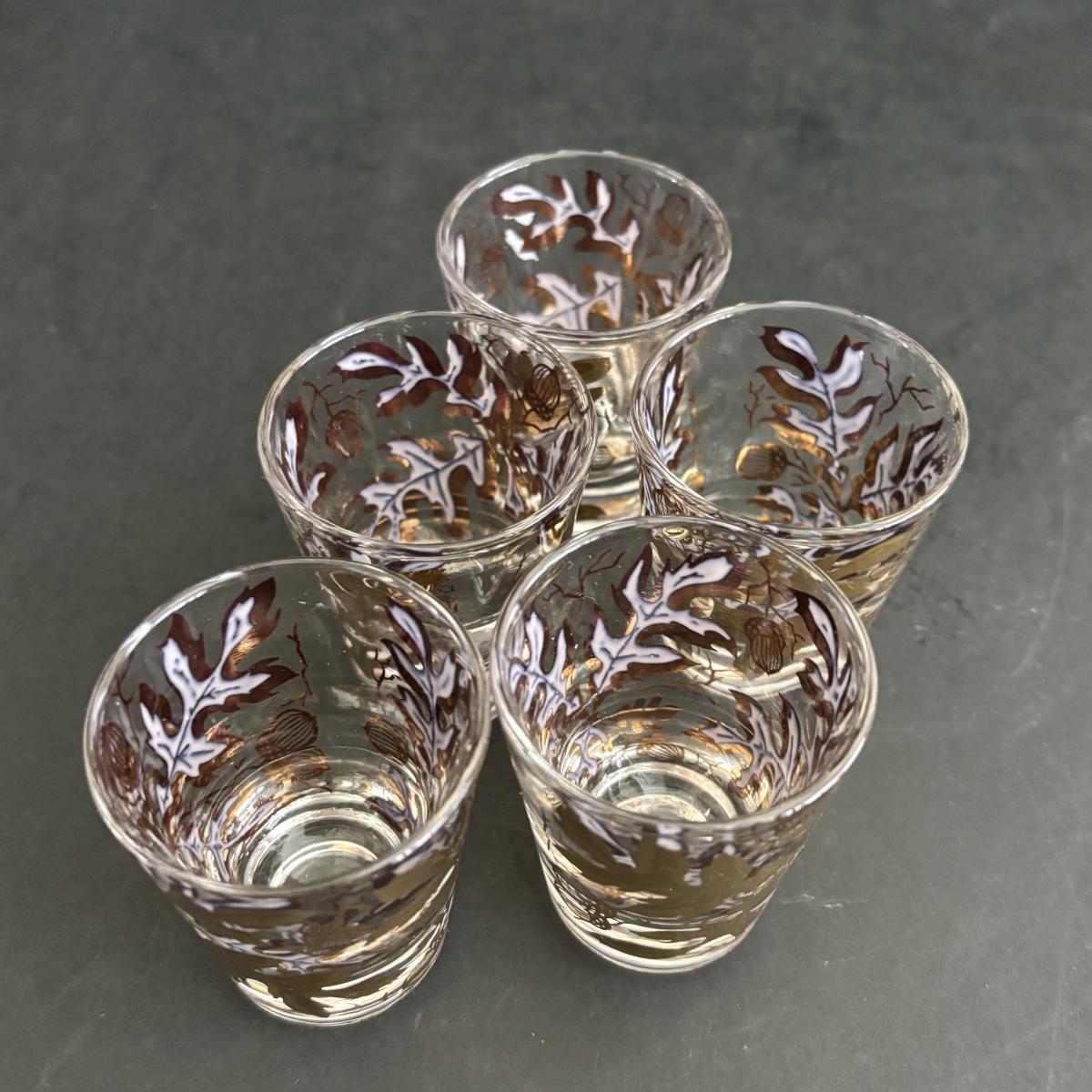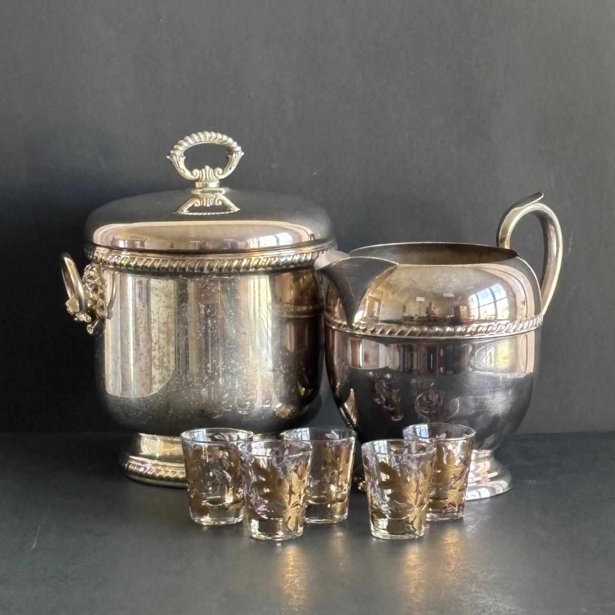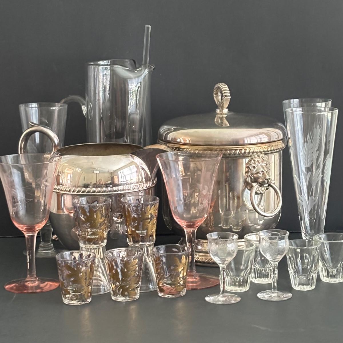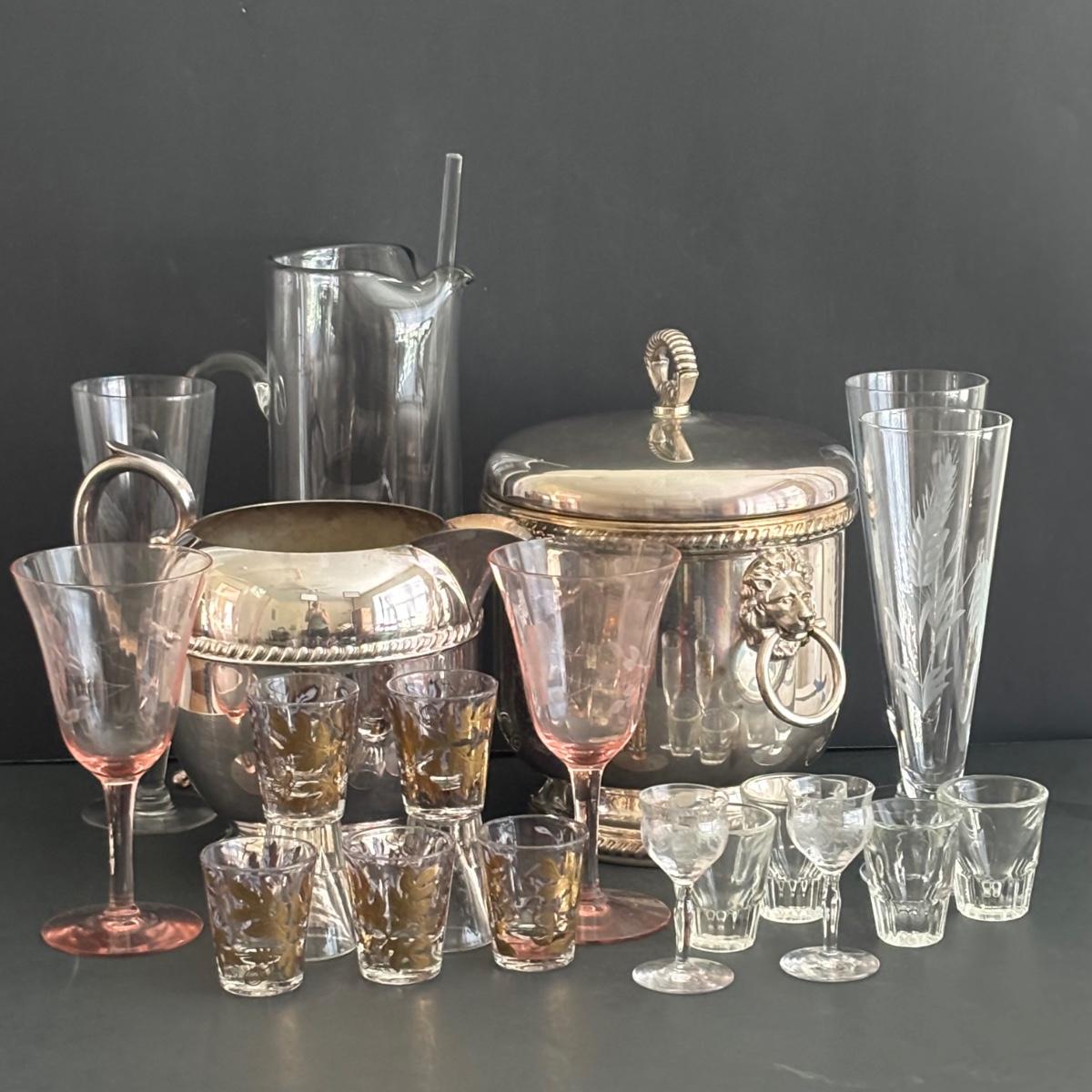 LOT 92: Sheffield Silve Plated Ice Bucket w/Lion Handles, Etched Pink Depressio Glasses (2), Etched Pilsner Glasses (3), MCM Gold Oak Leaf & Acorn Shot Glasses