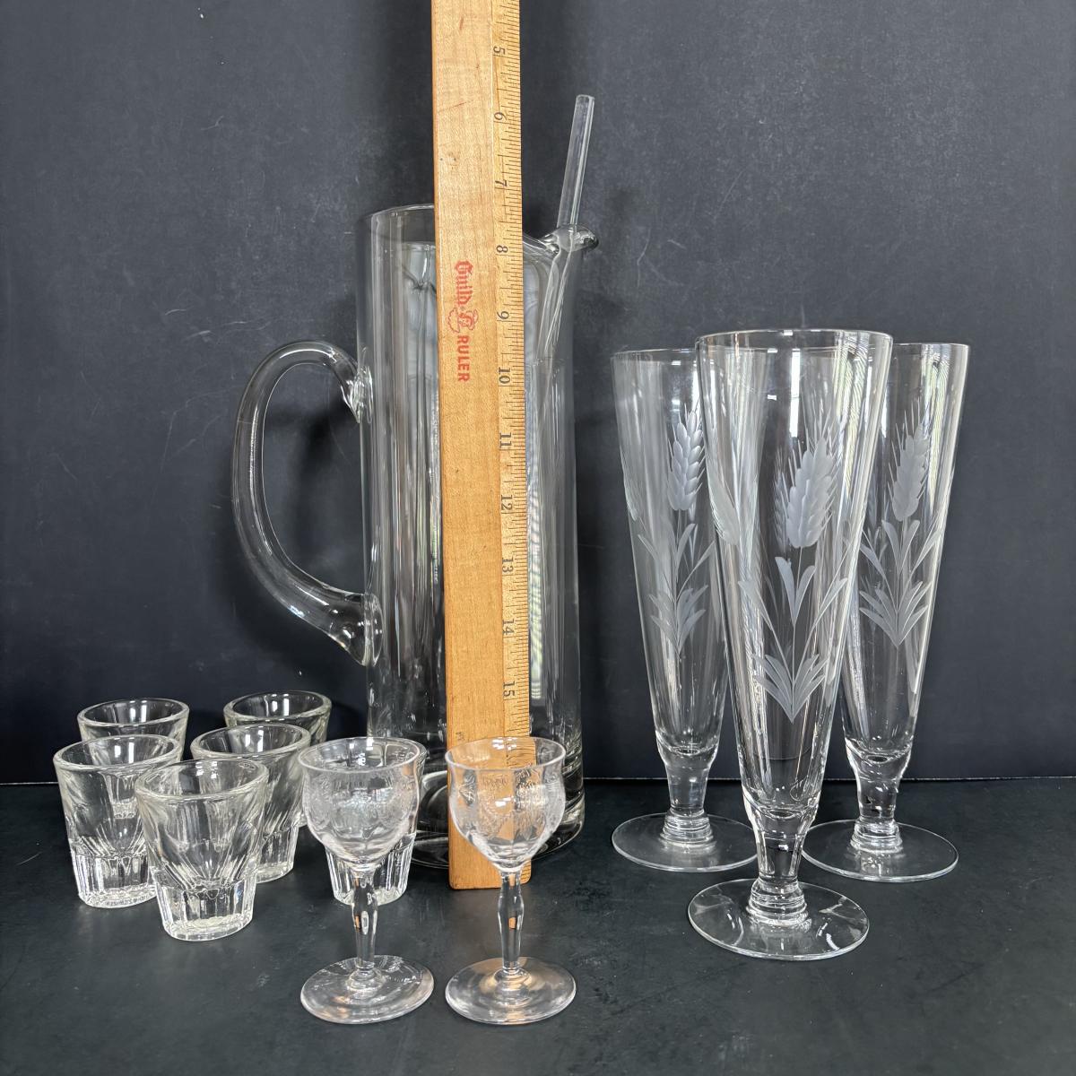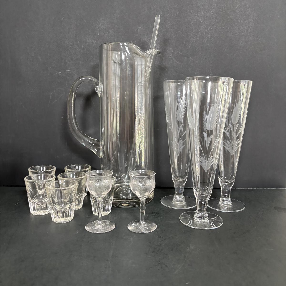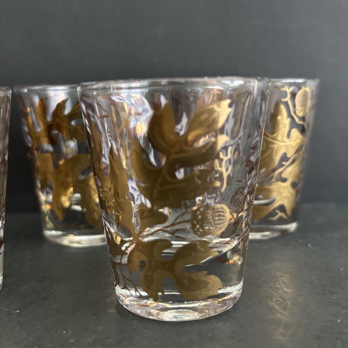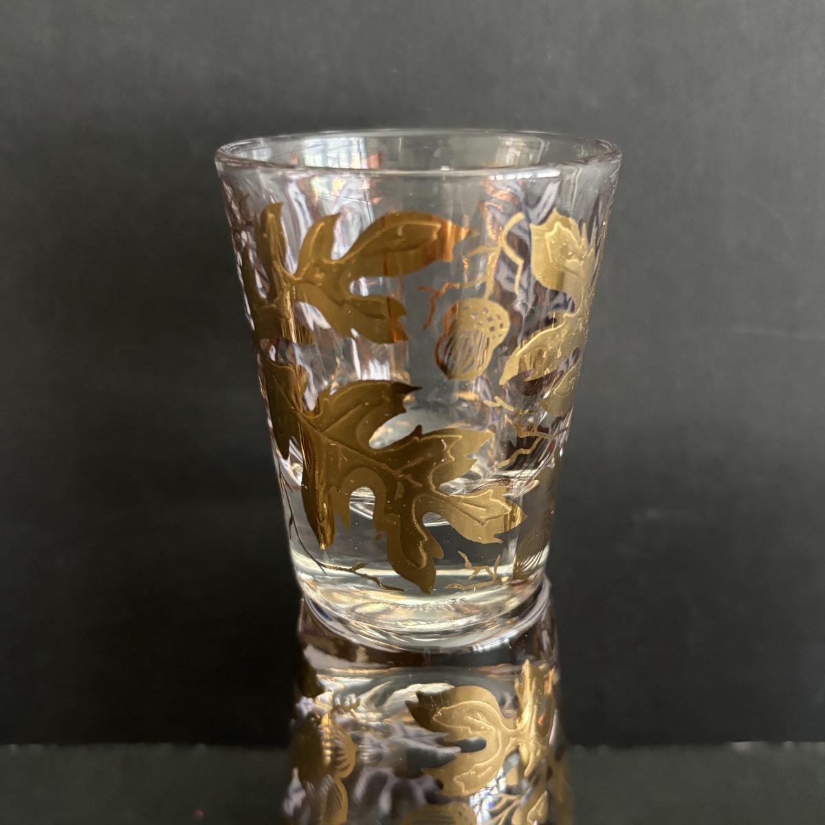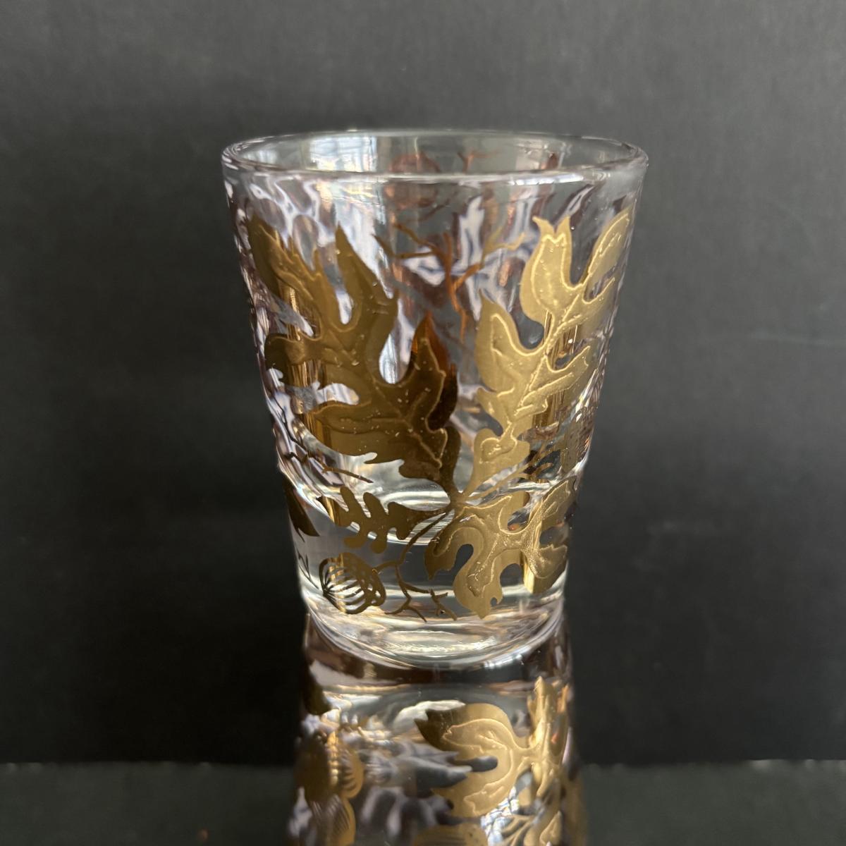 LOT 92: Sheffield Silve Plated Ice Bucket w/Lion Handles, Etched Pink Depressio Glasses (2), Etched Pilsner Glasses (3), MCM Gold Oak Leaf & Acorn Shot Glasses