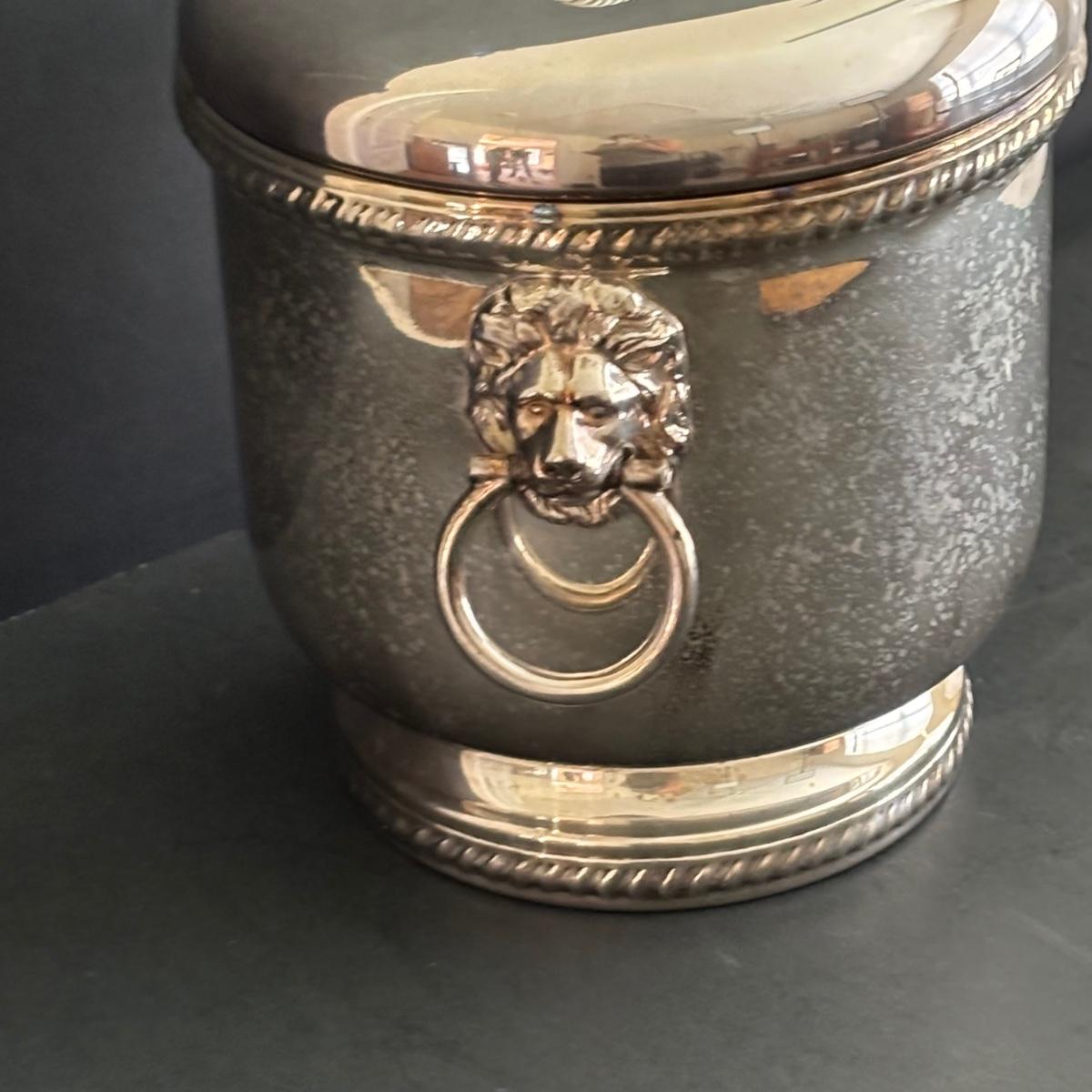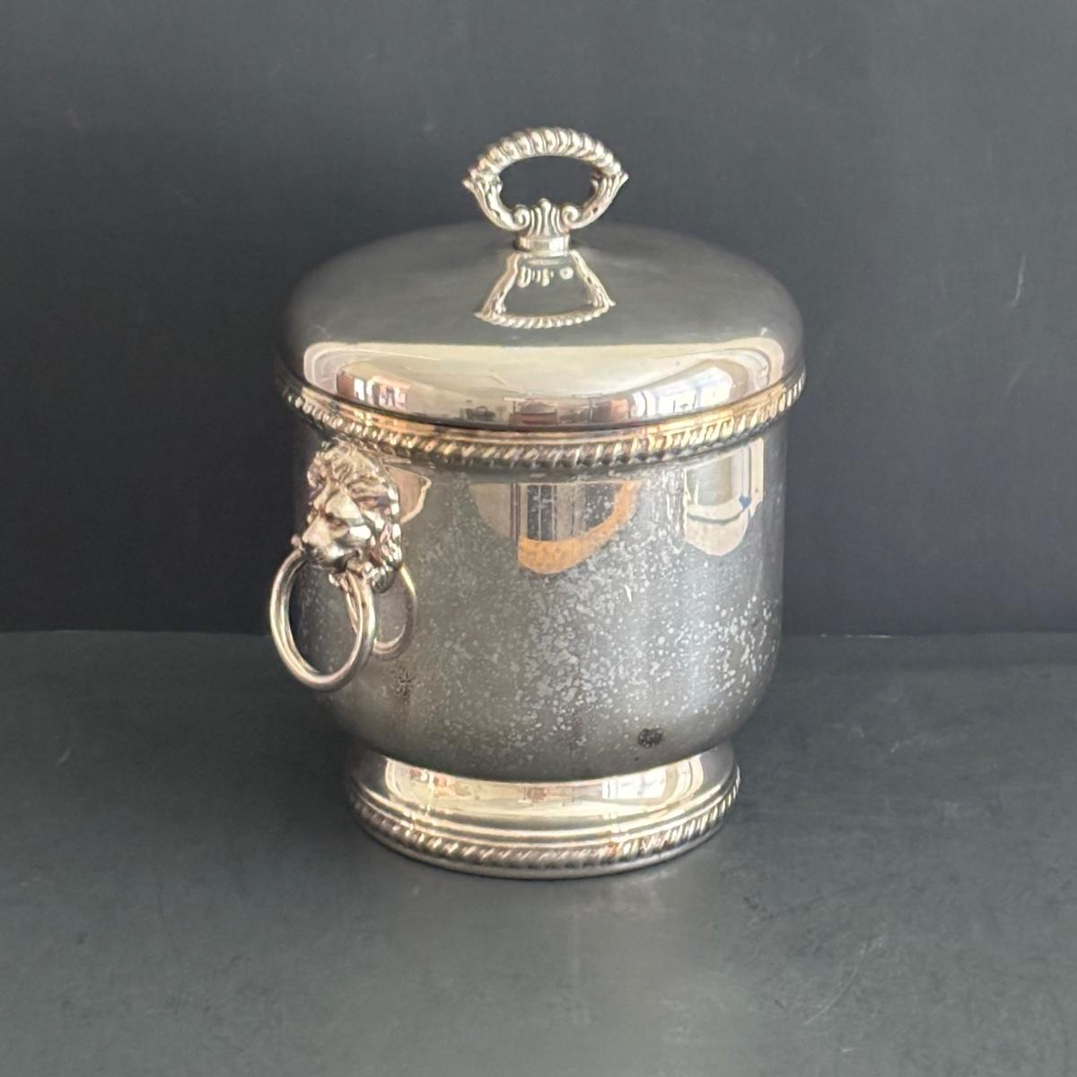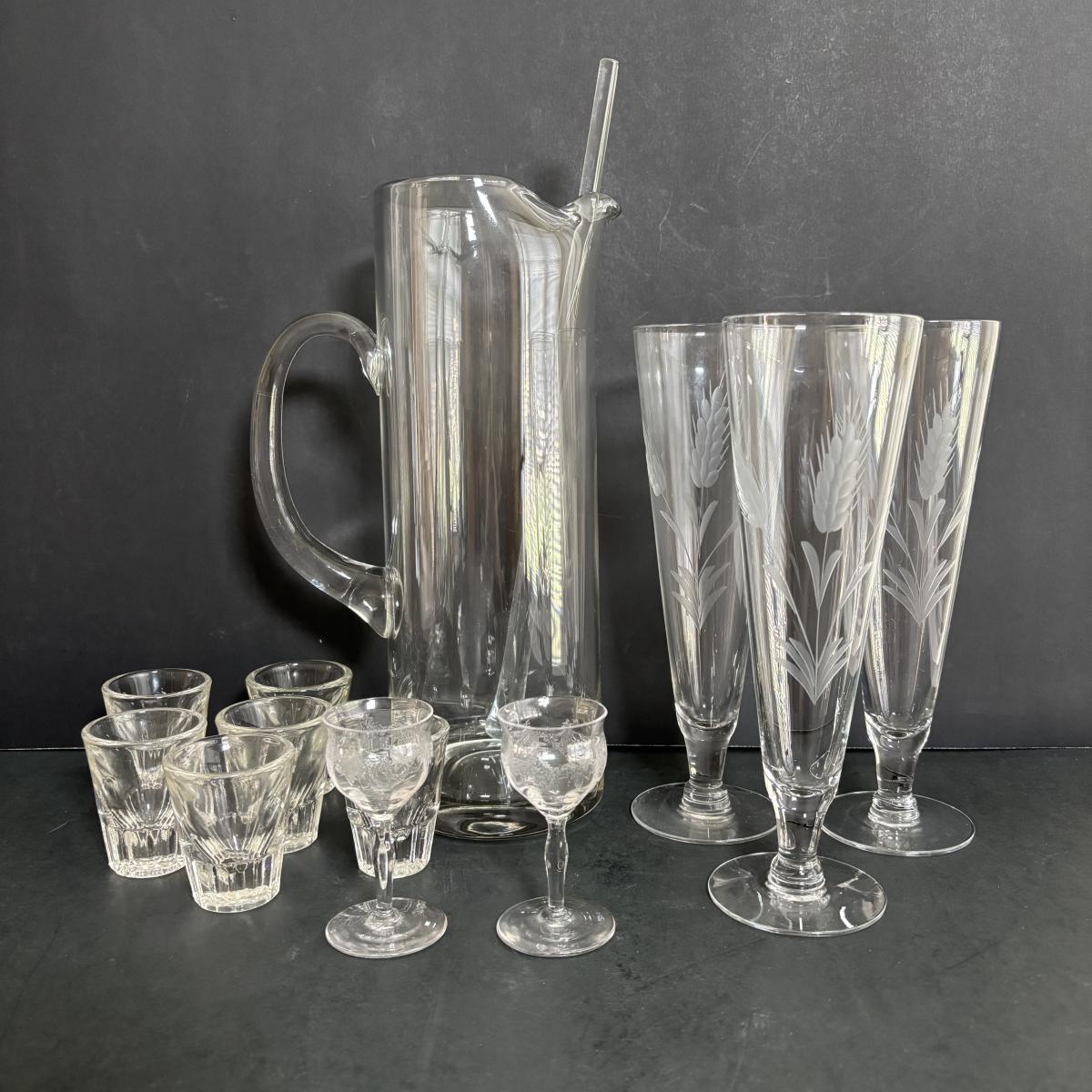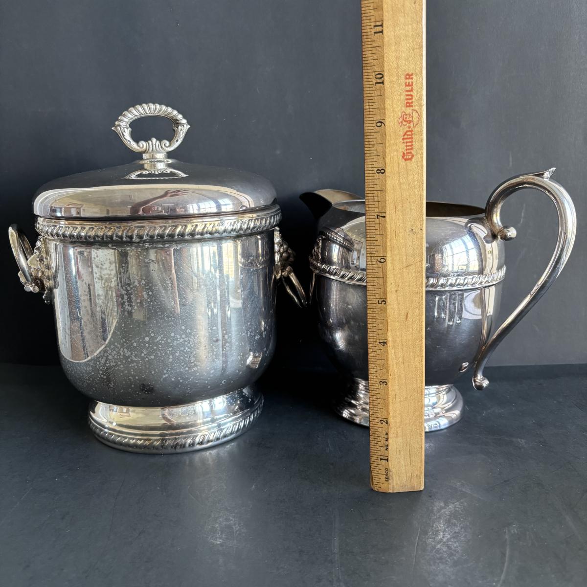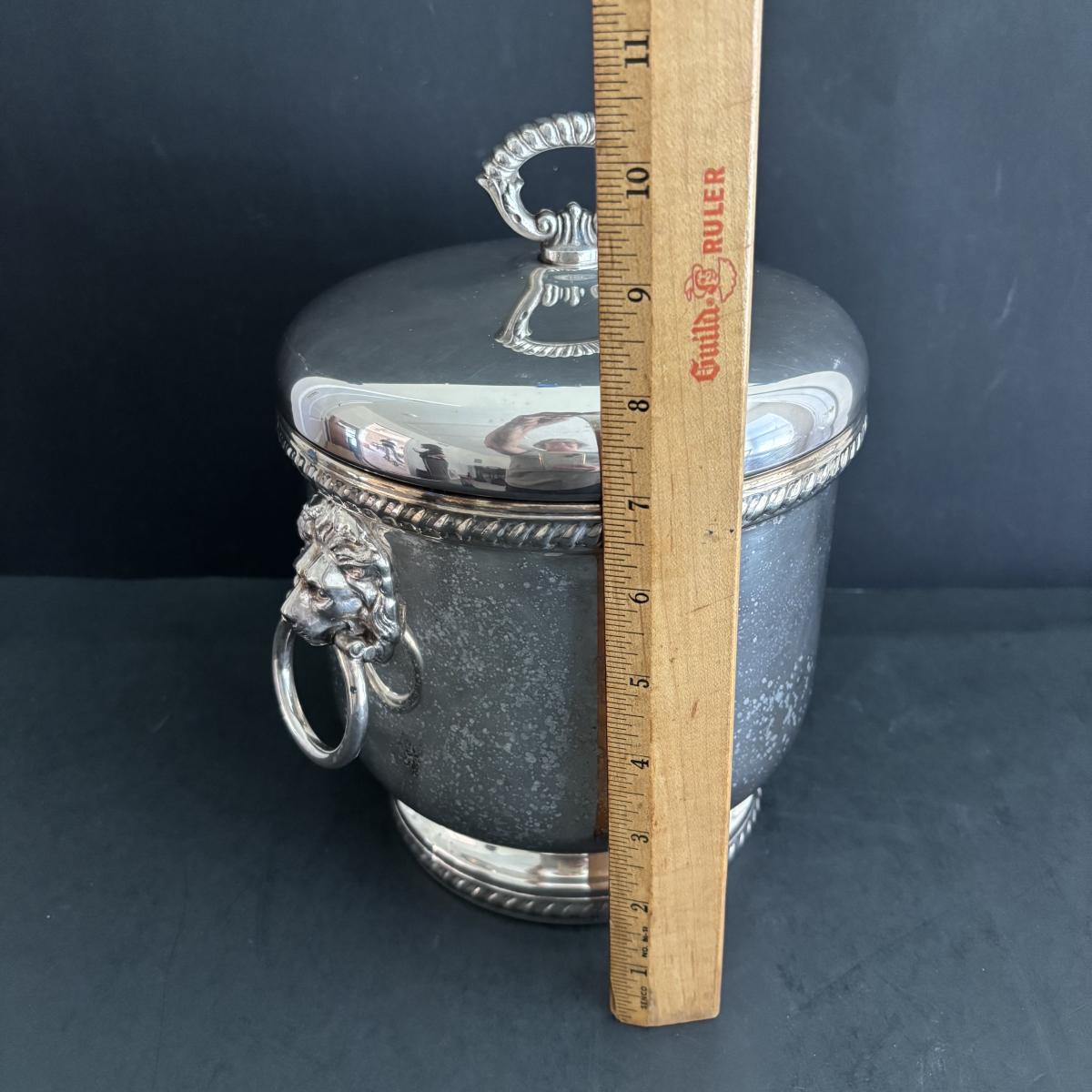 LOT 92: Sheffield Silve Plated Ice Bucket w/Lion Handles, Etched Pink Depressio Glasses (2), Etched Pilsner Glasses (3), MCM Gold Oak Leaf & Acorn Shot Glasses