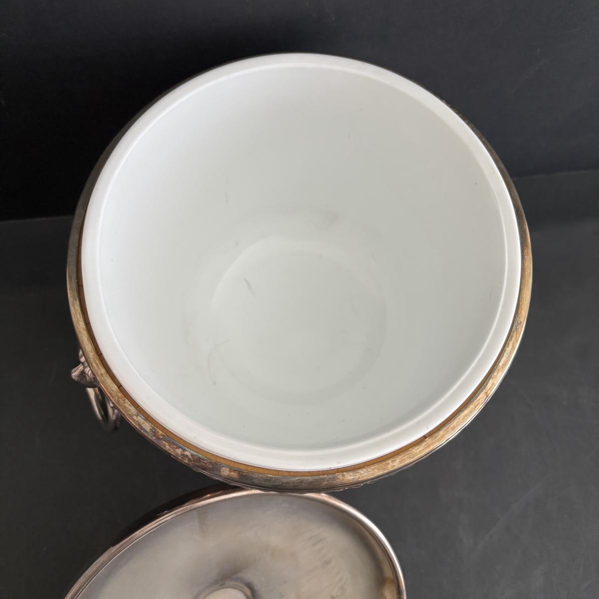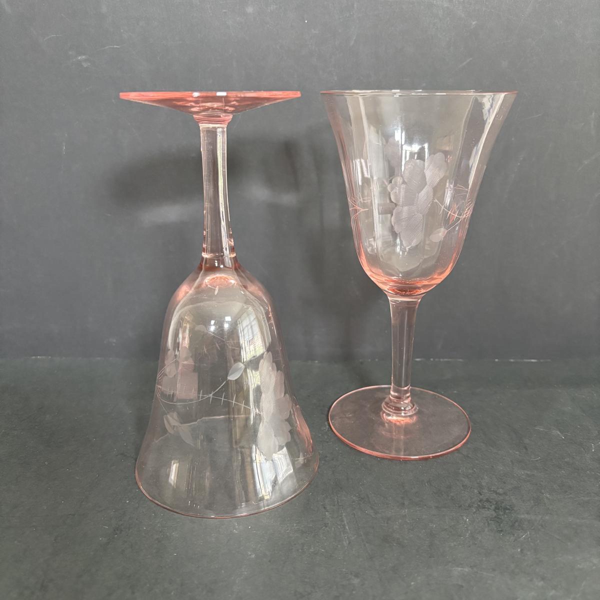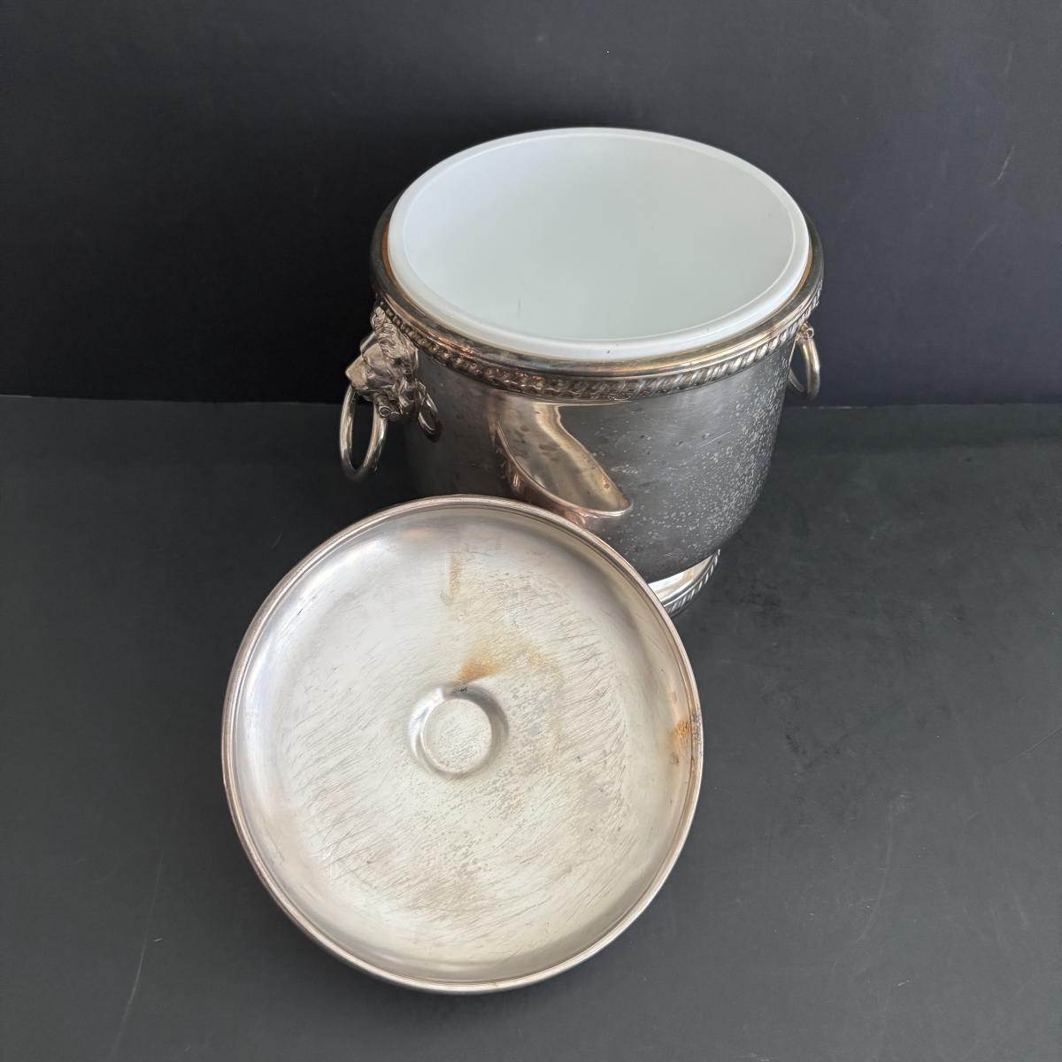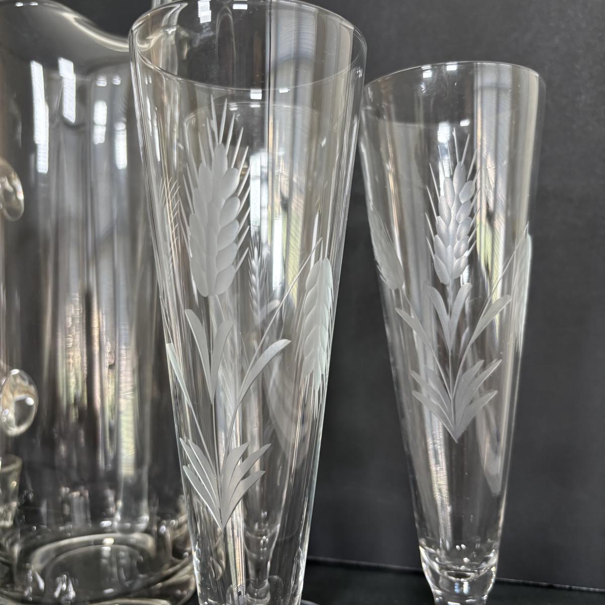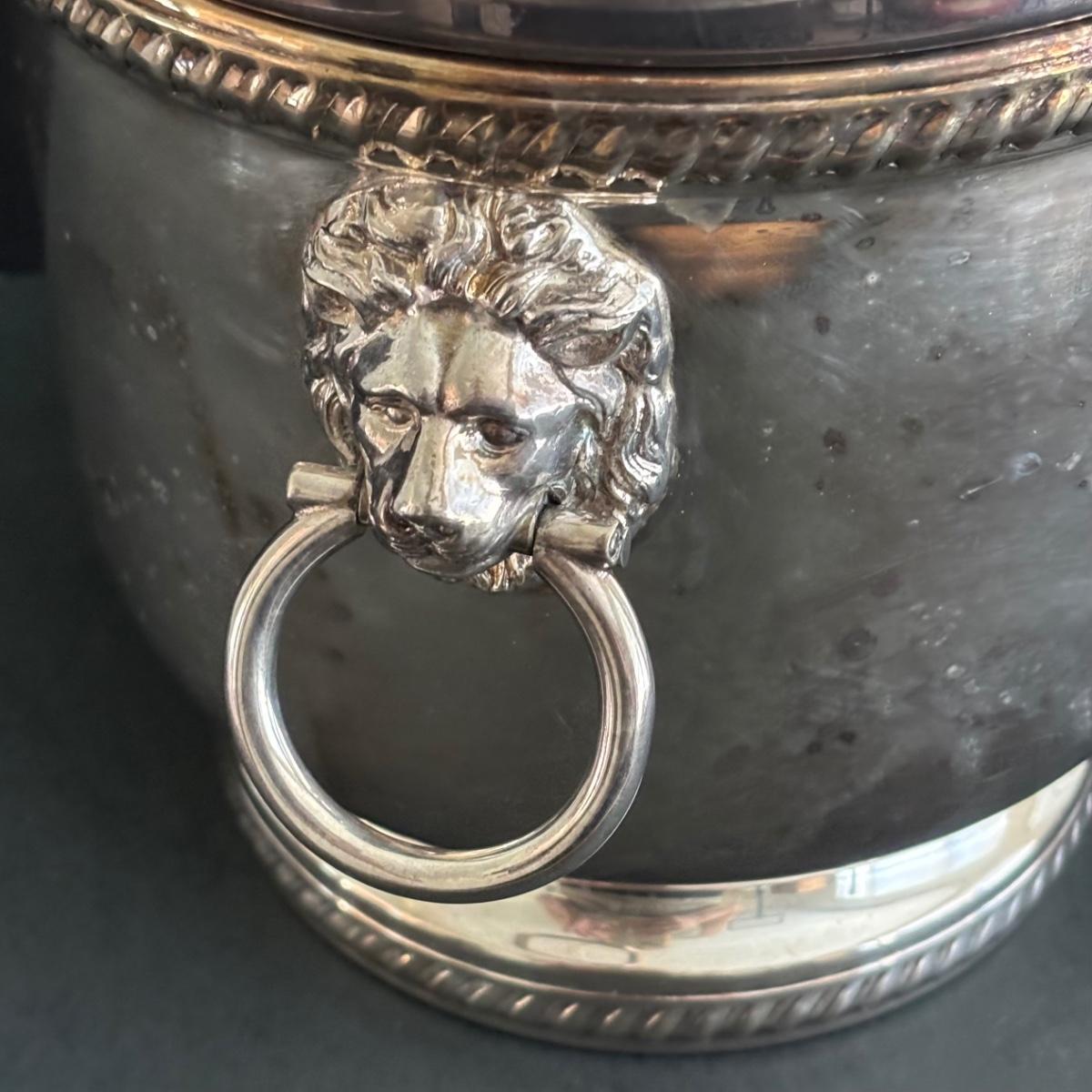 LOT 92: Sheffield Silve Plated Ice Bucket w/Lion Handles, Etched Pink Depressio Glasses (2), Etched Pilsner Glasses (3), MCM Gold Oak Leaf & Acorn Shot Glasses