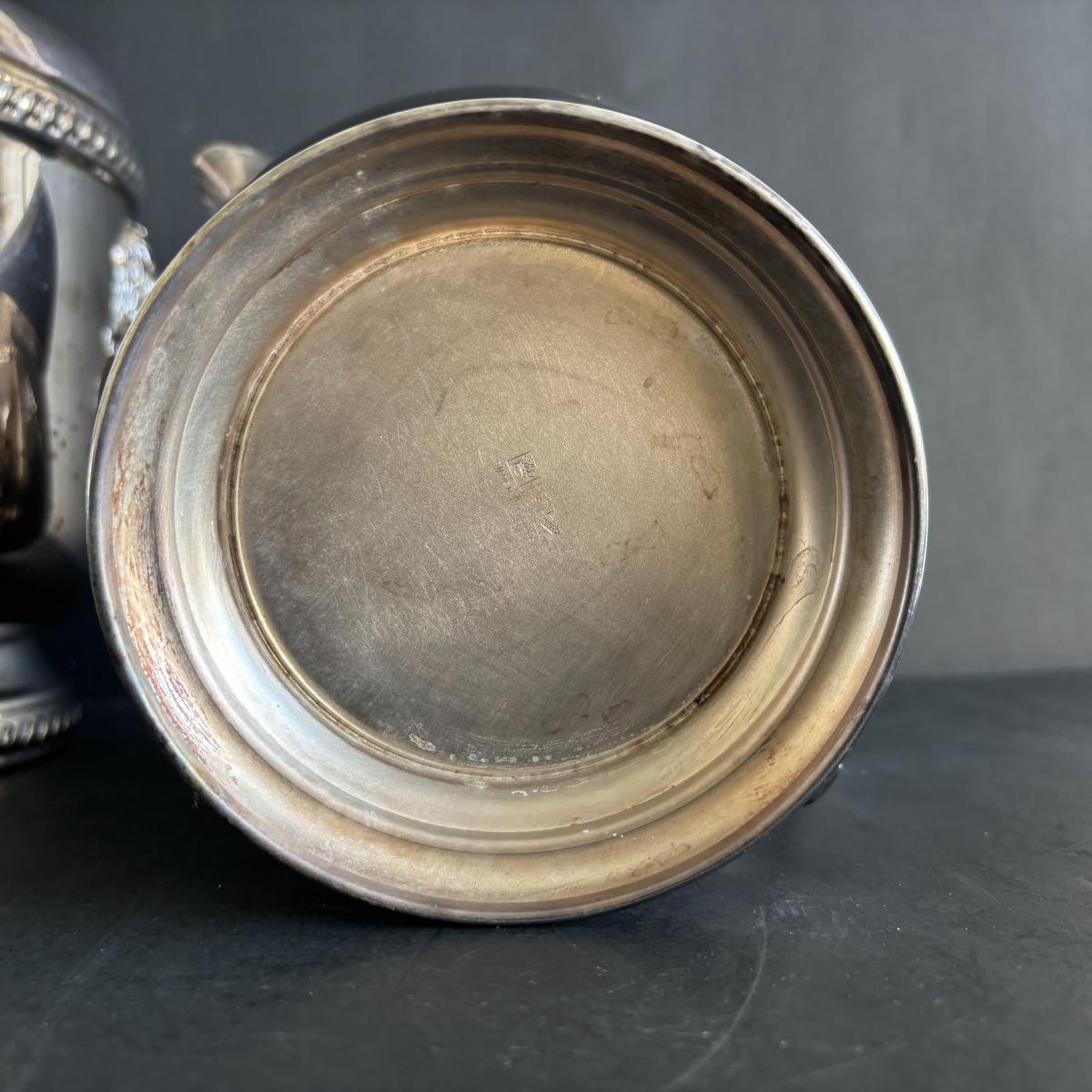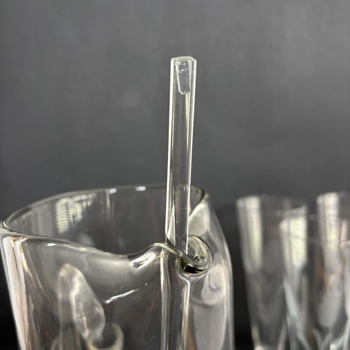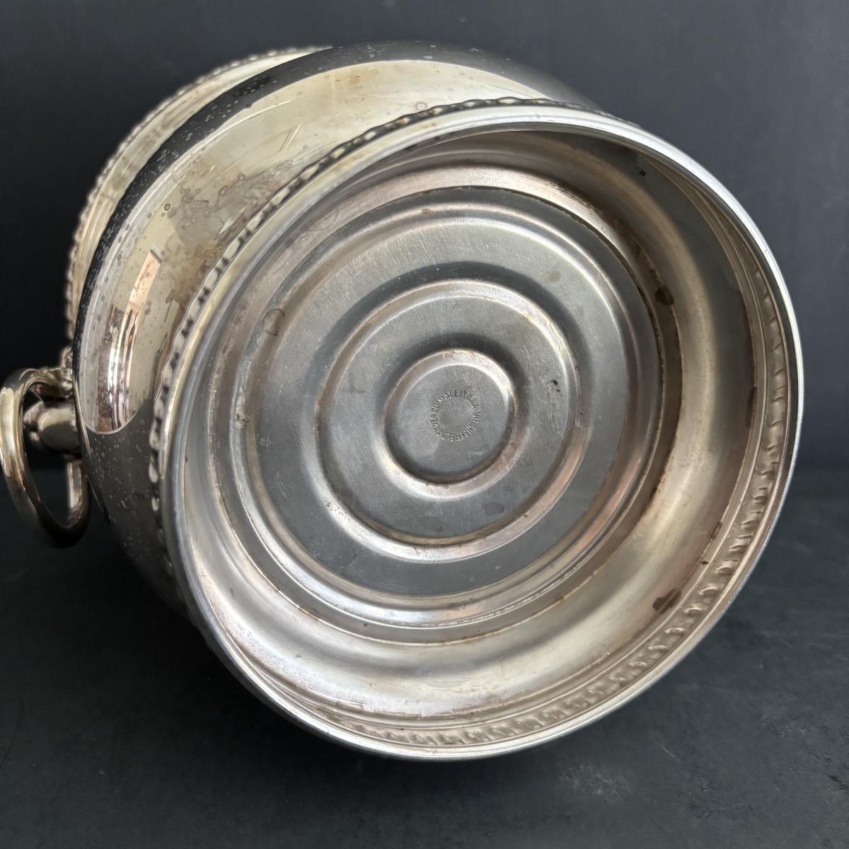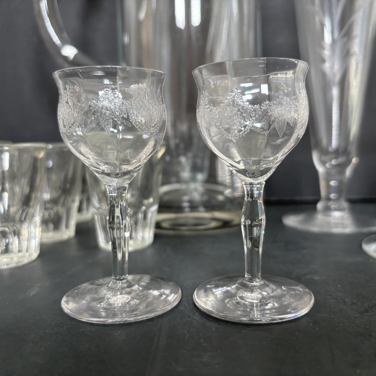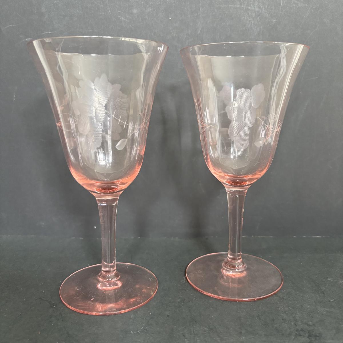 LOT 92: Sheffield Silve Plated Ice Bucket w/Lion Handles, Etched Pink Depressio Glasses (2), Etched Pilsner Glasses (3), MCM Gold Oak Leaf & Acorn Shot Glasses