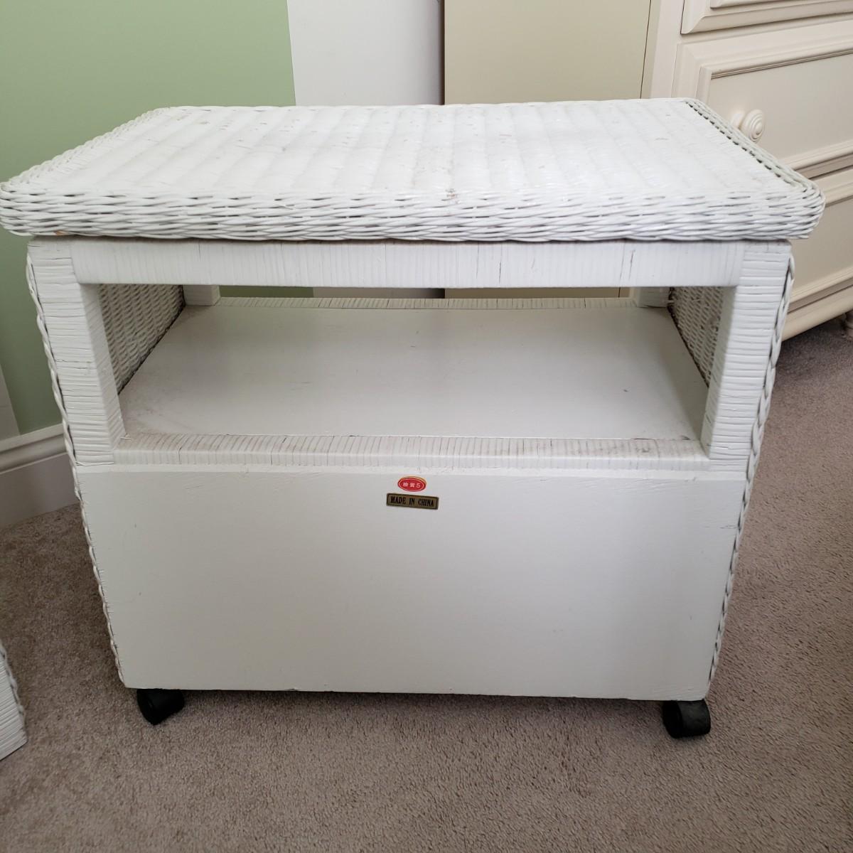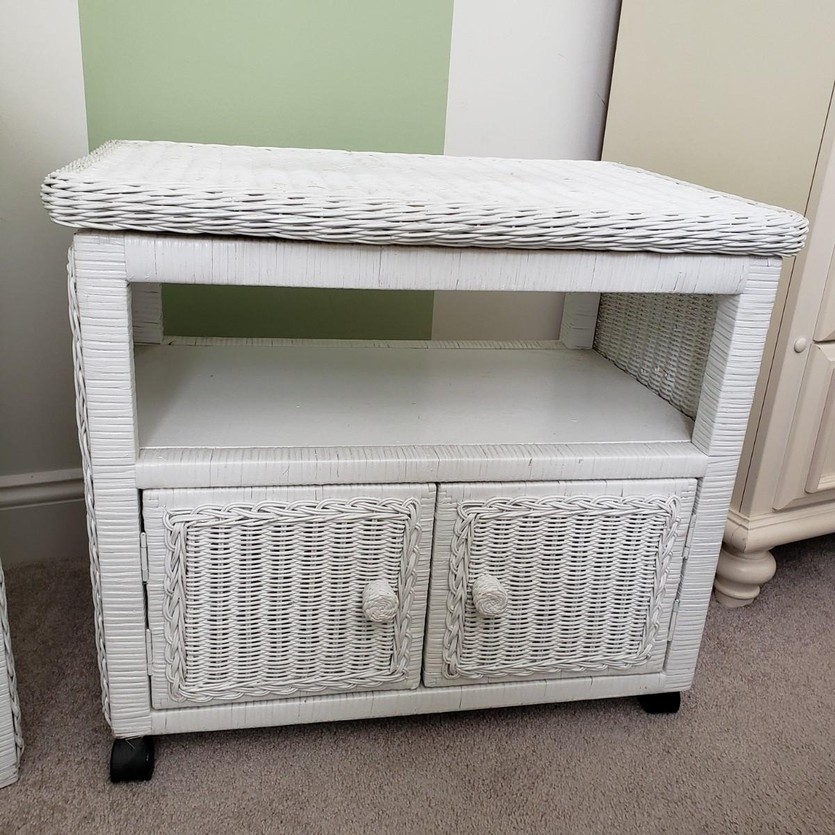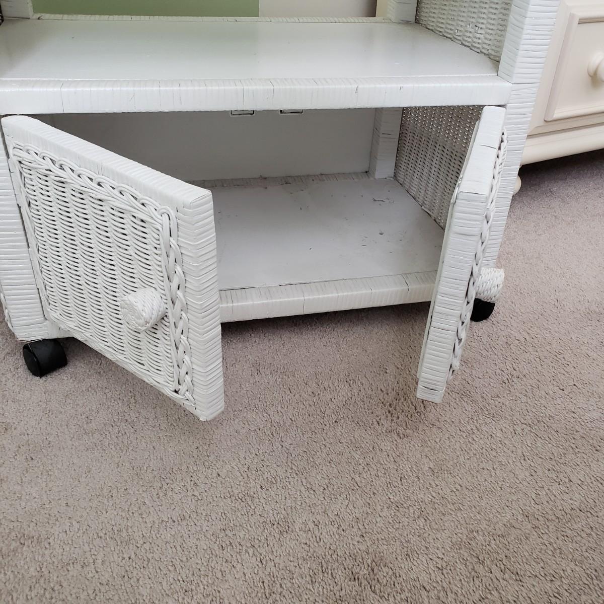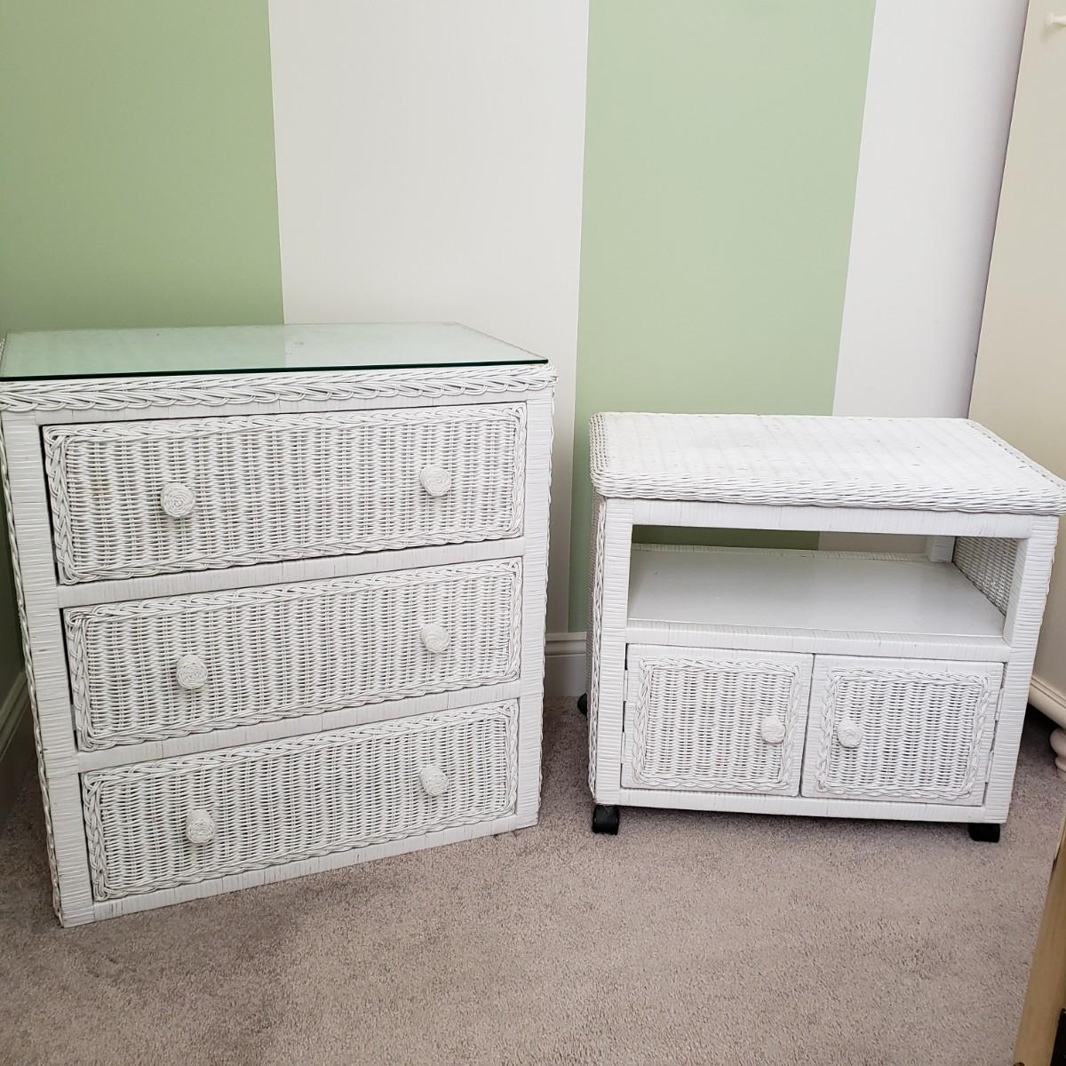 LOT 11Z: White Wicker Set; Swivel Top TV Stand on Wheels & Glass Top Set of Drawers