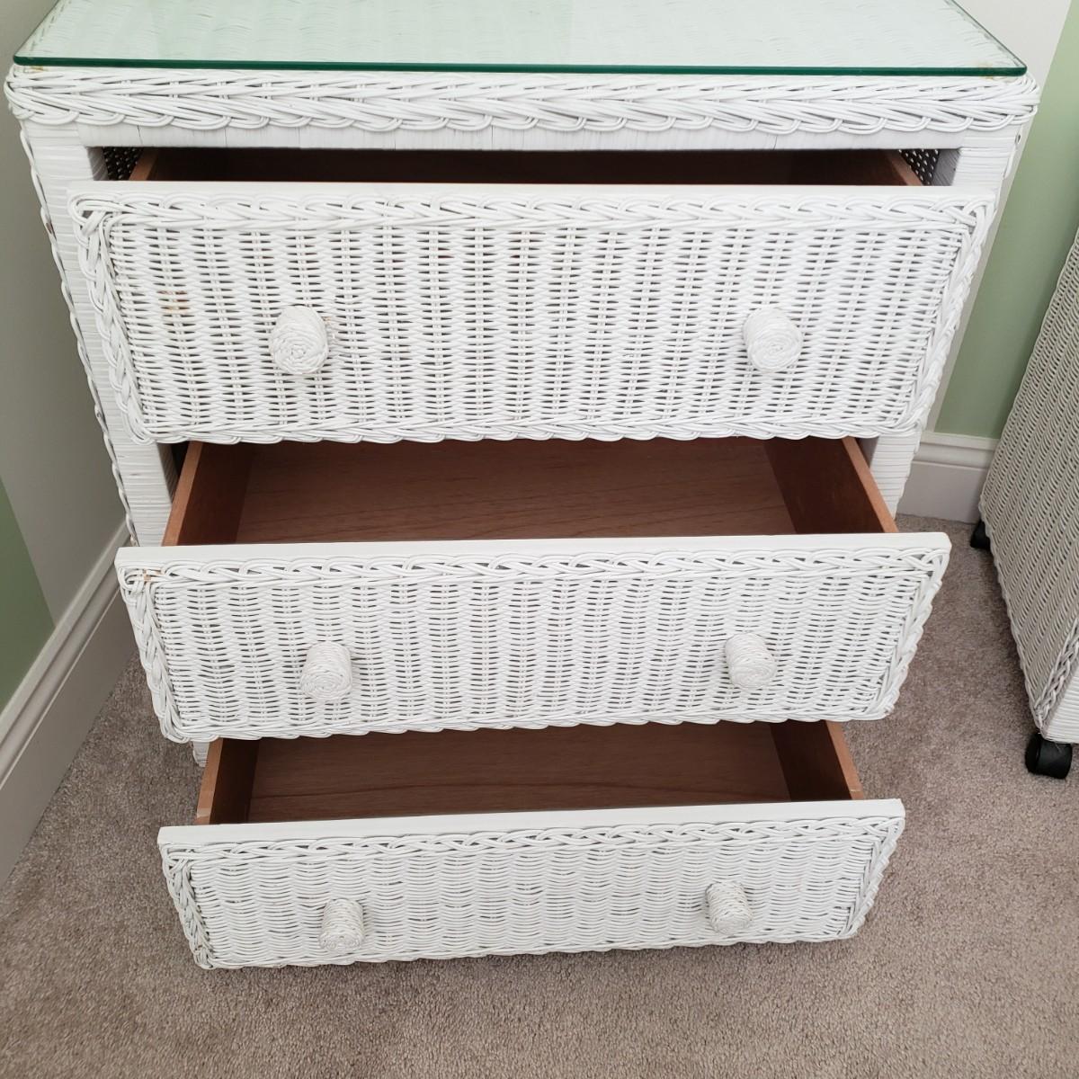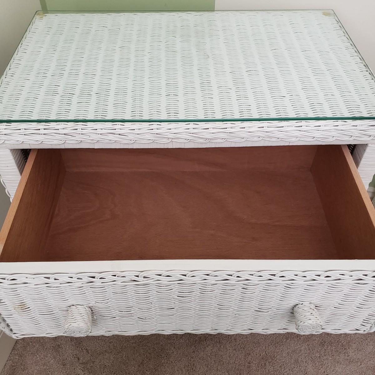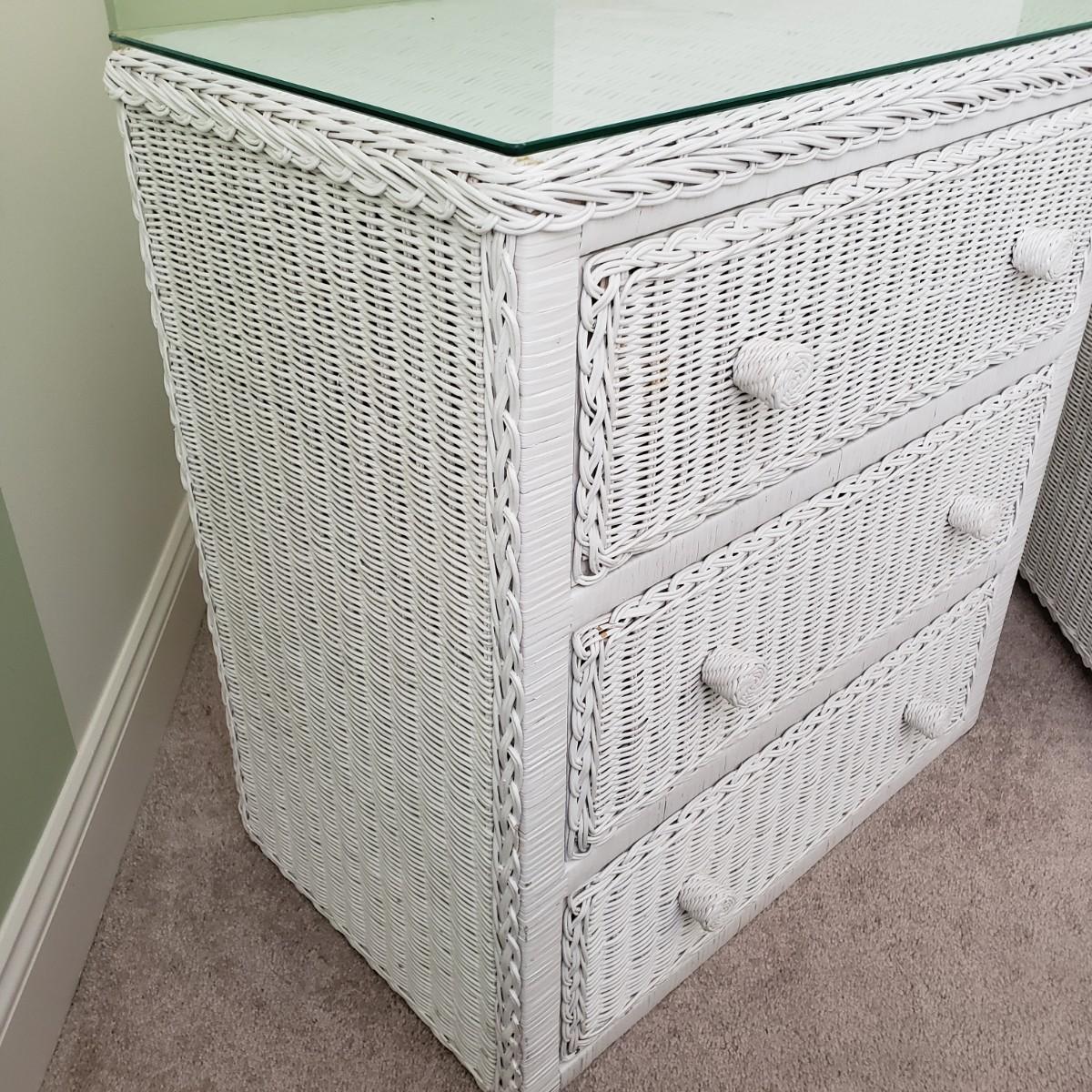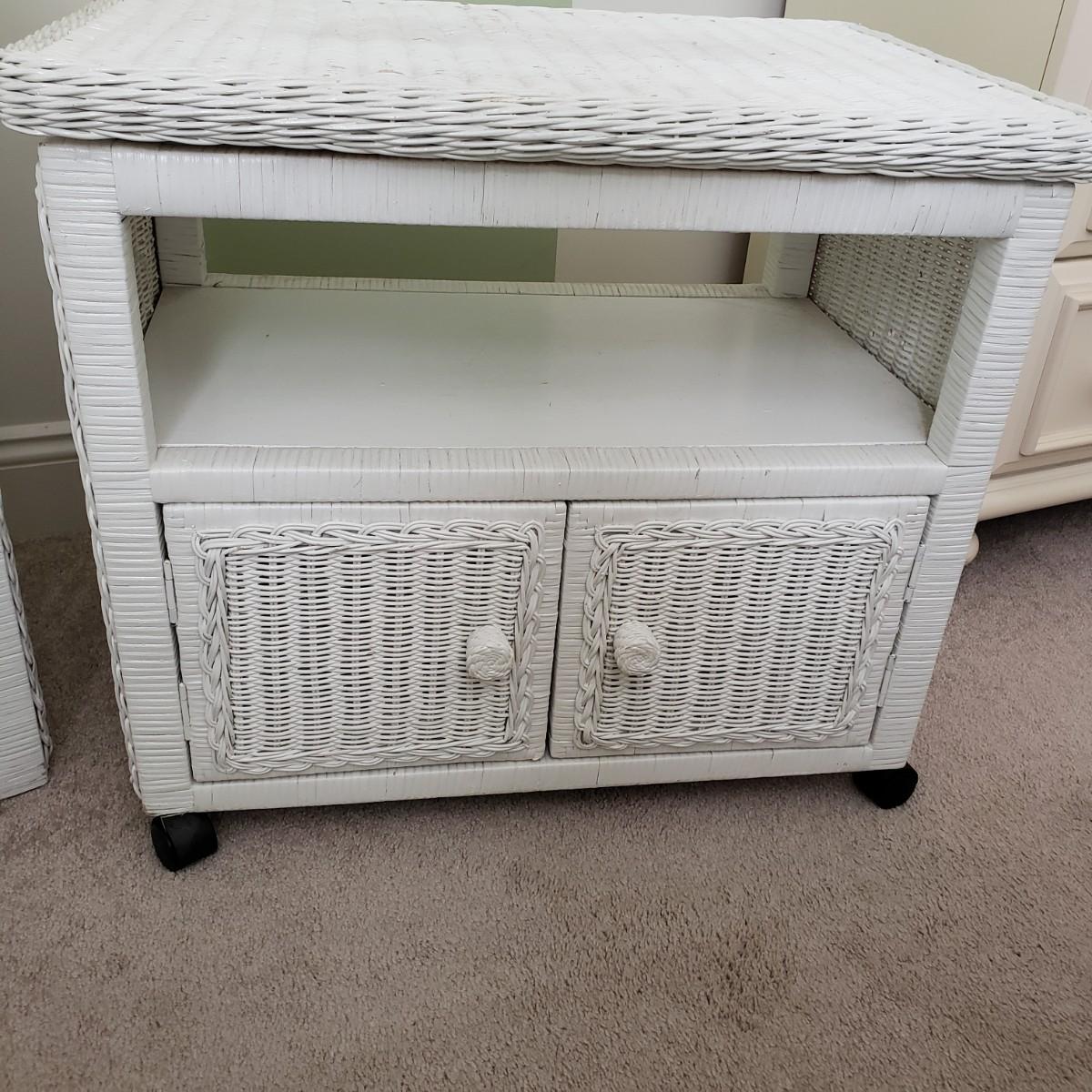 LOT 11Z: White Wicker Set; Swivel Top TV Stand on Wheels & Glass Top Set of Drawers