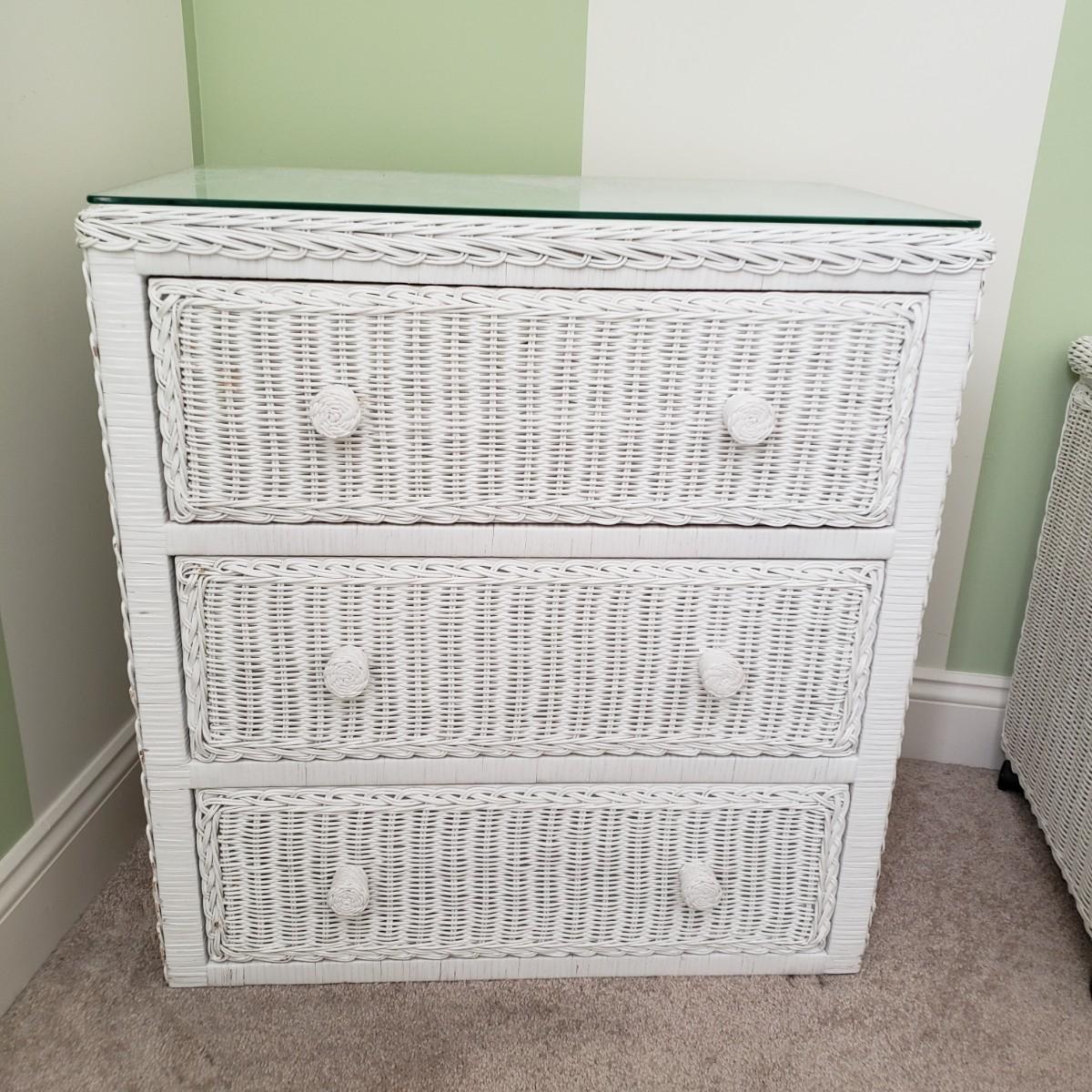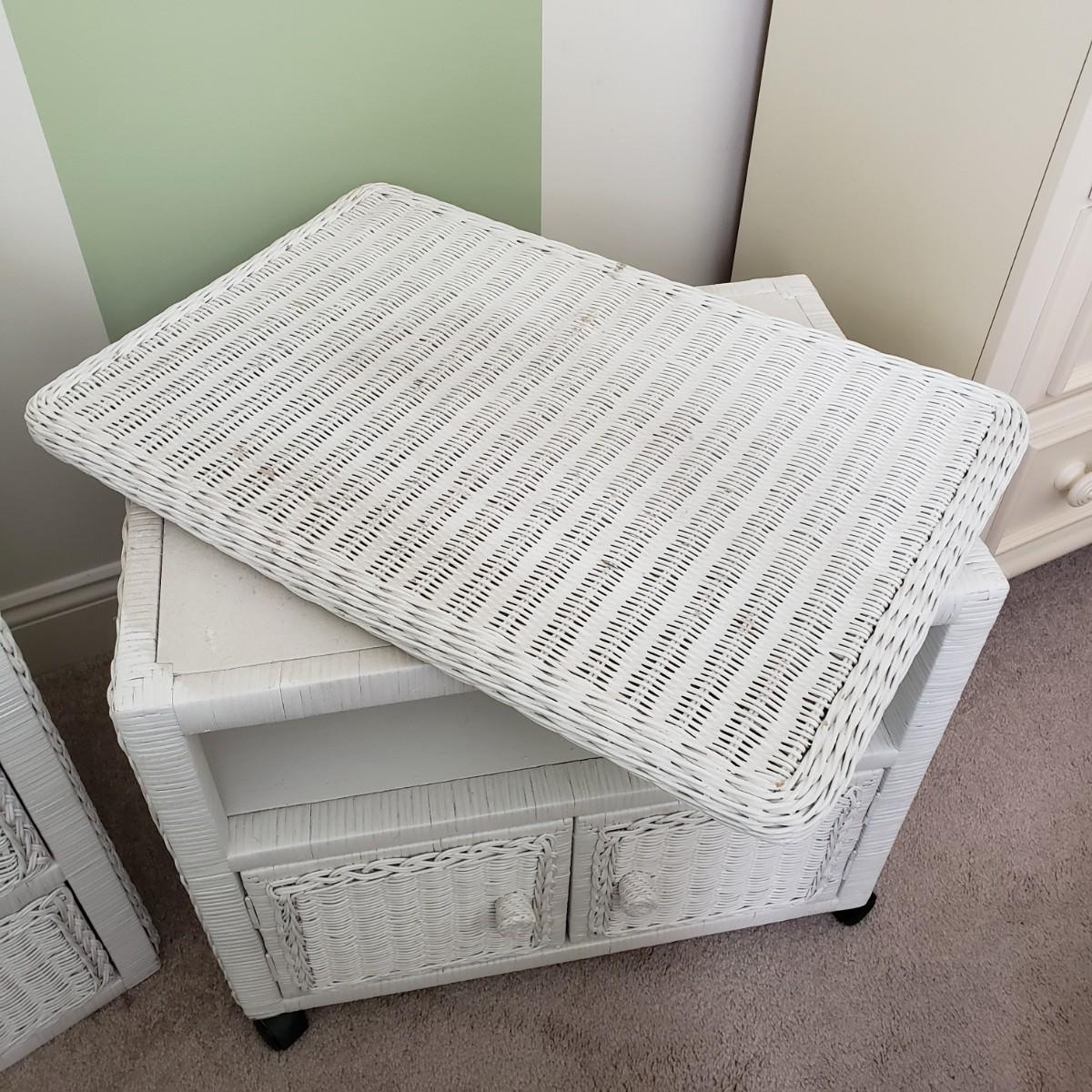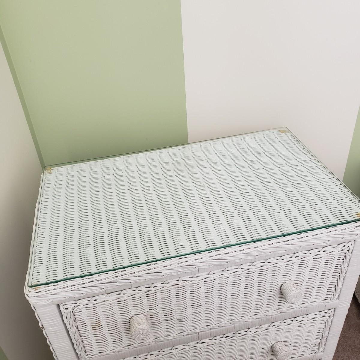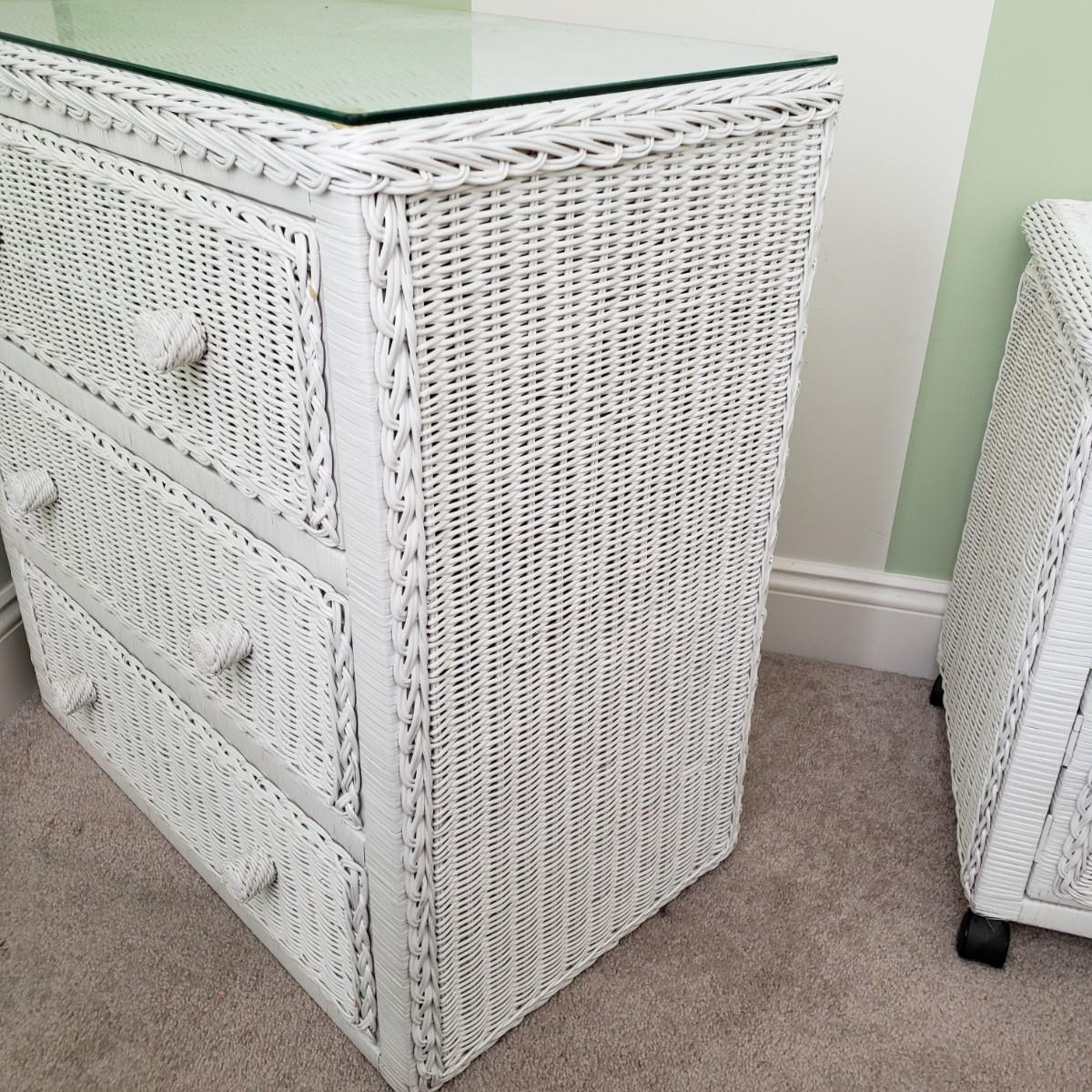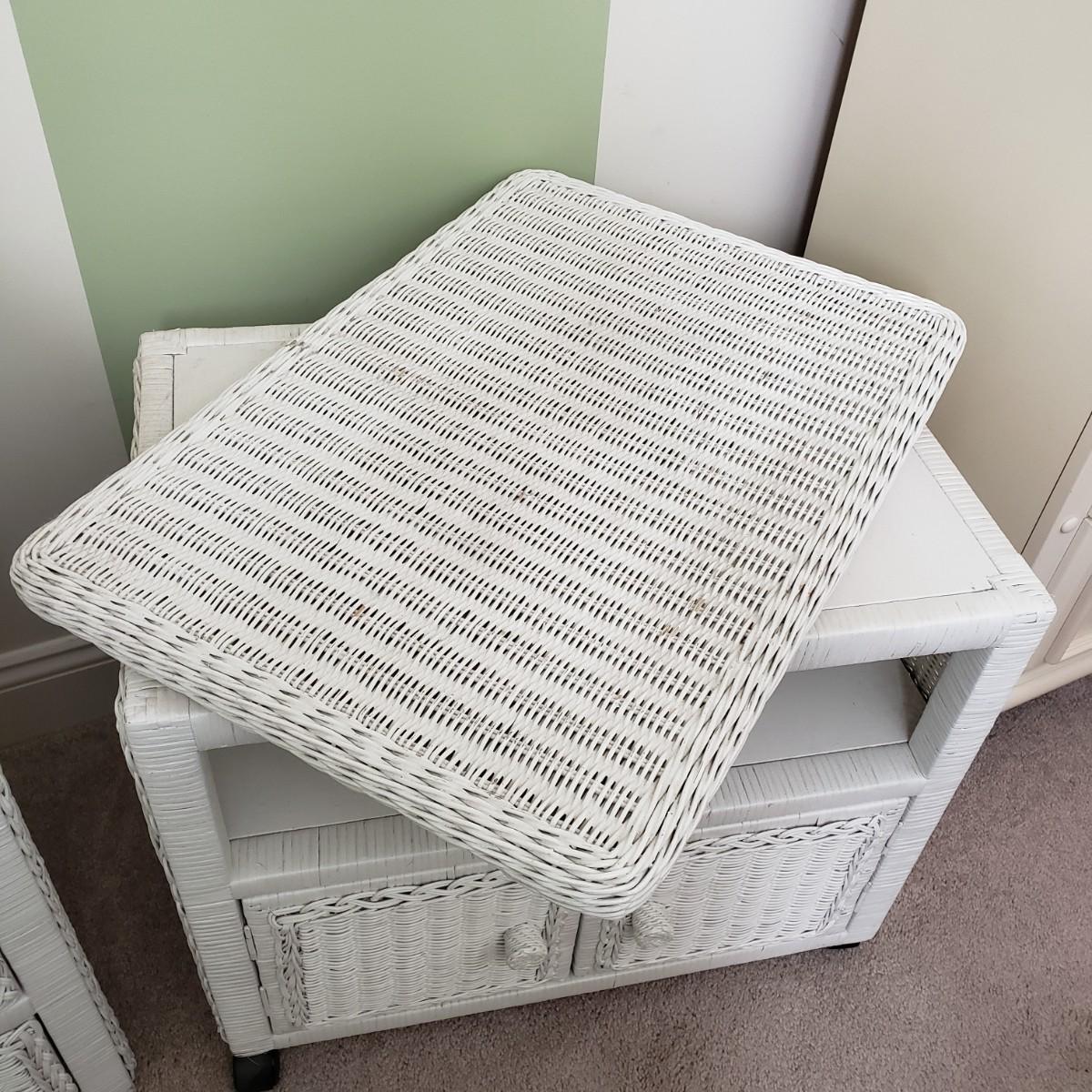 LOT 11Z: White Wicker Set; Swivel Top TV Stand on Wheels & Glass Top Set of Drawers