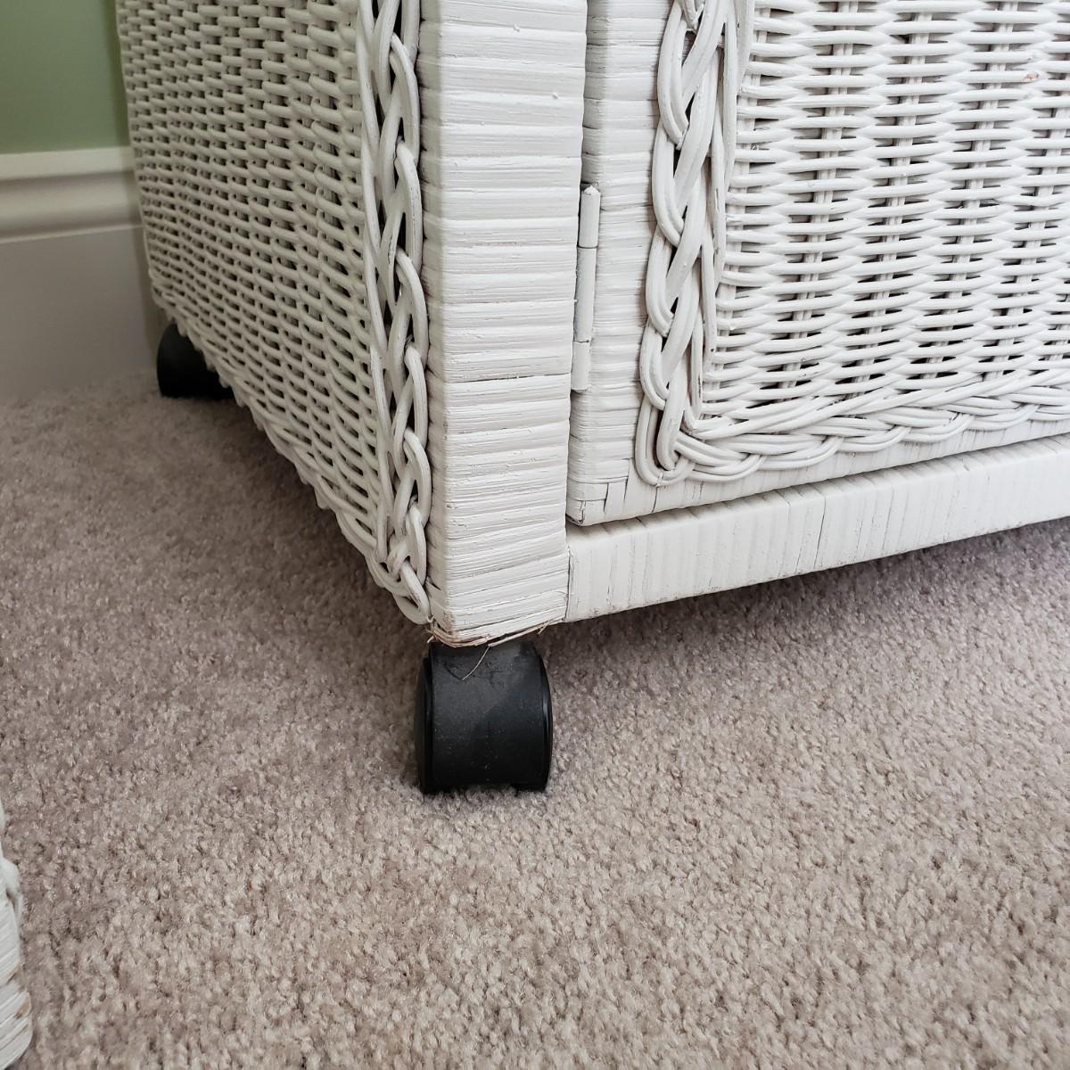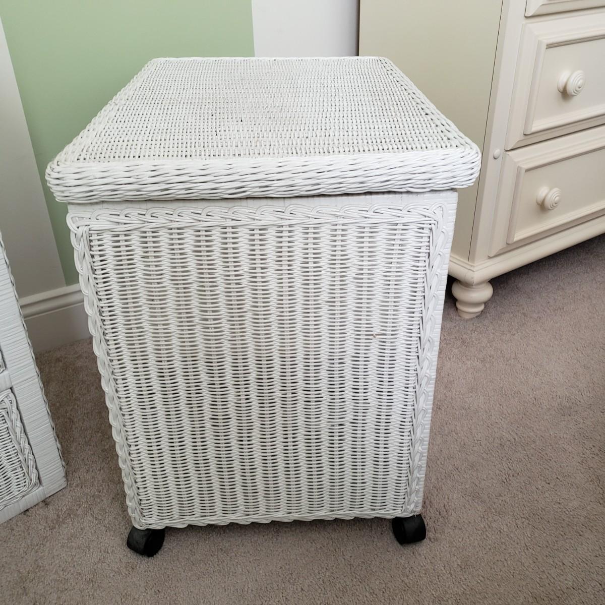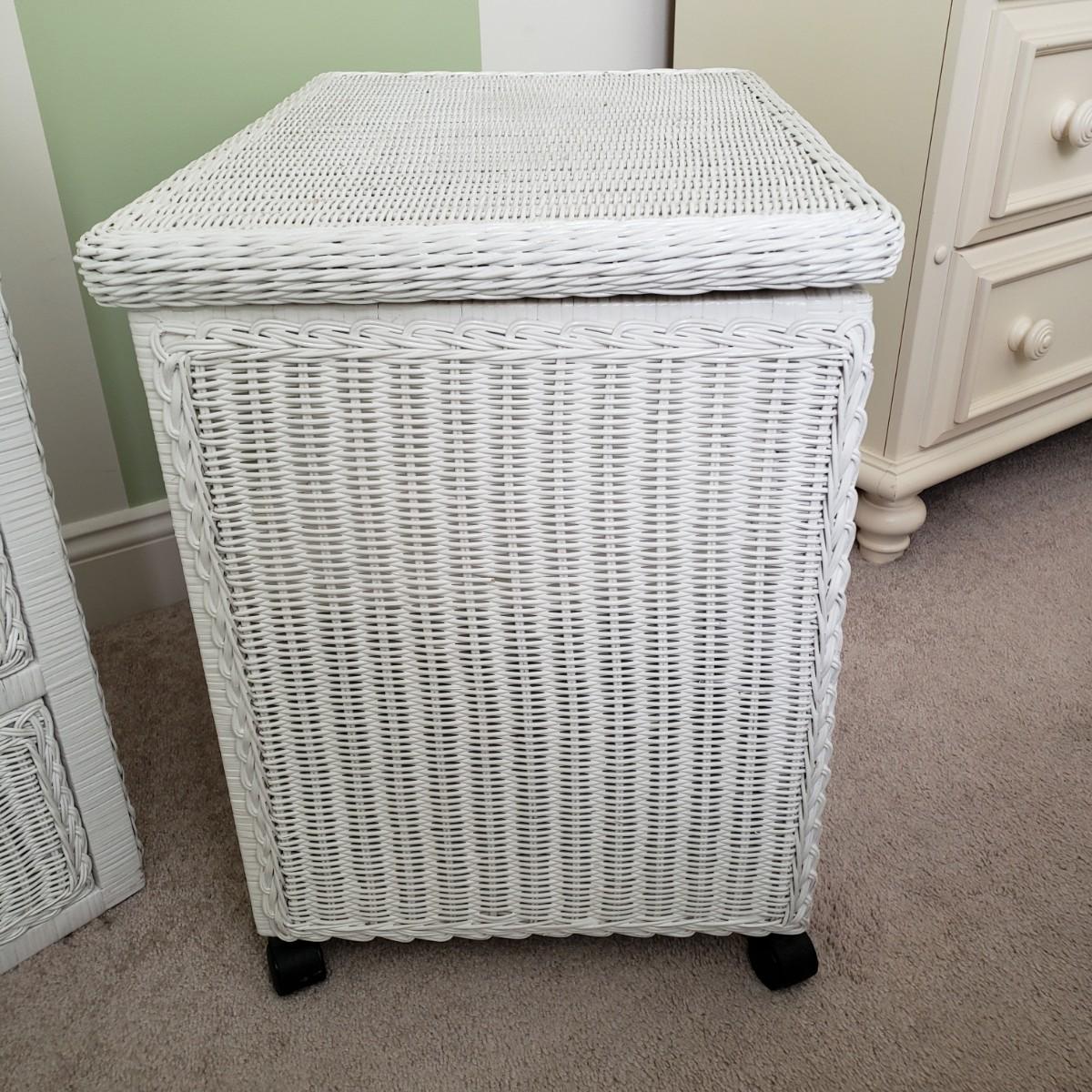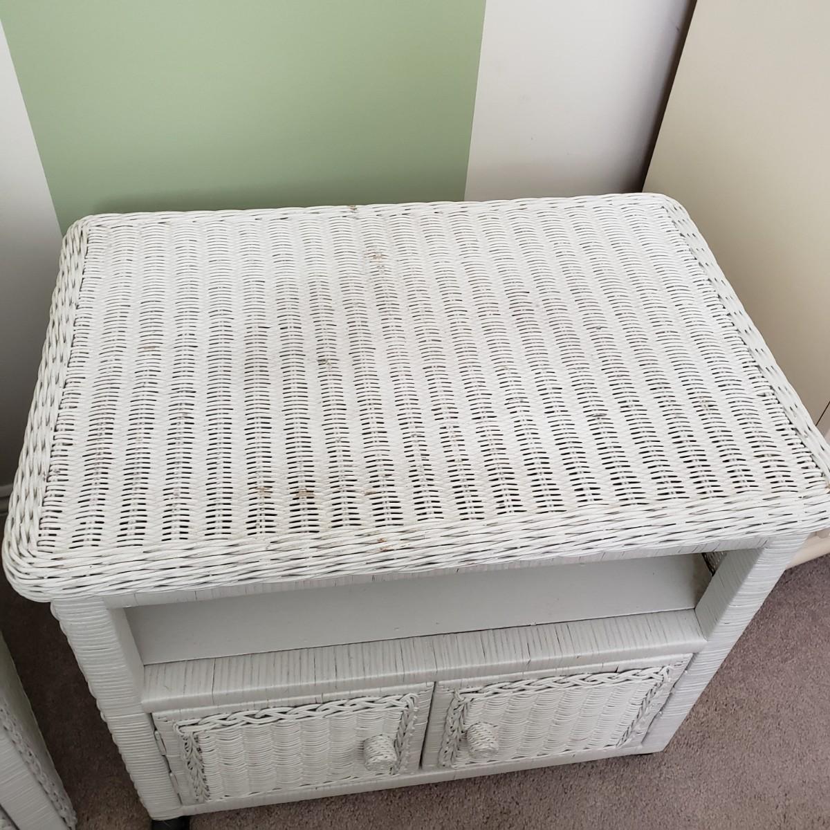 LOT 11Z: White Wicker Set; Swivel Top TV Stand on Wheels & Glass Top Set of Drawers