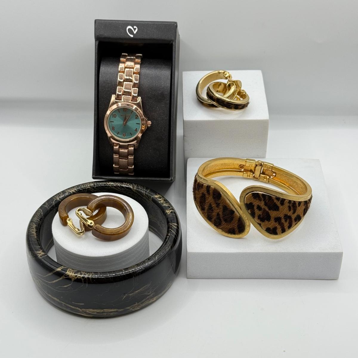 LOT 37J: Valetta Watch in Box, Leopard Print Faux Fur Cuff Bracelet w/ Matching Earrings & More