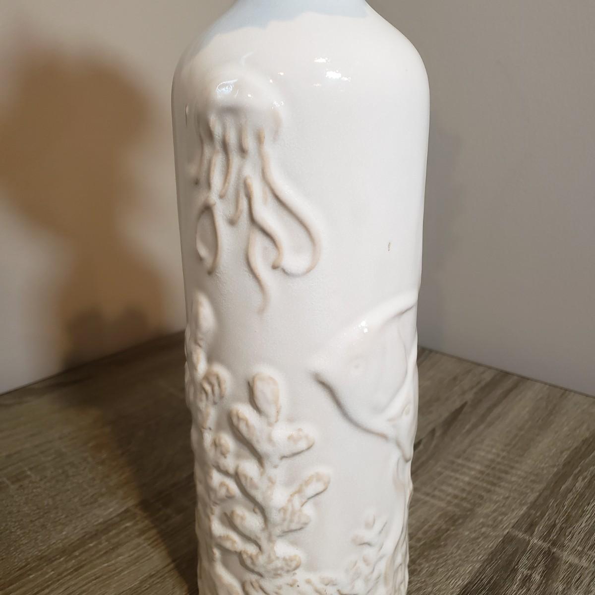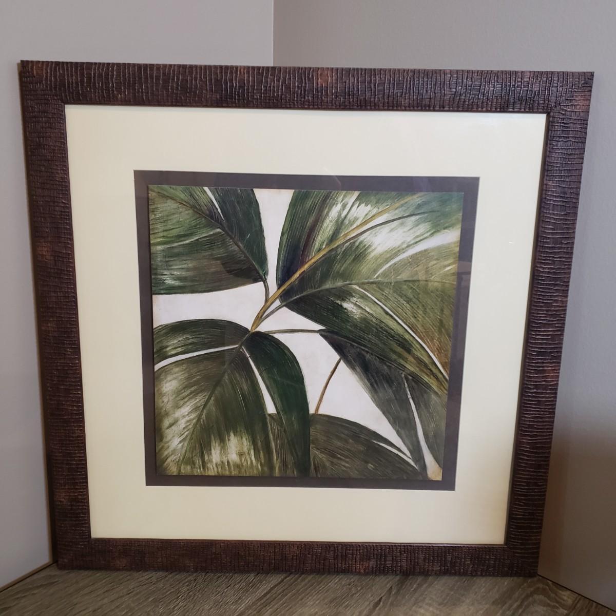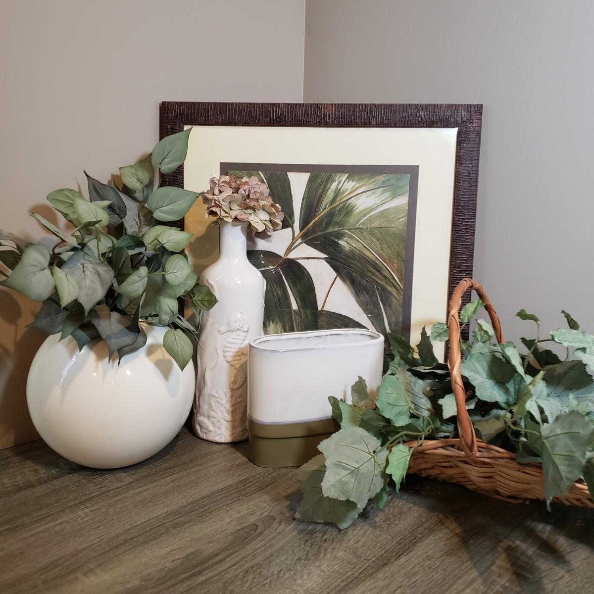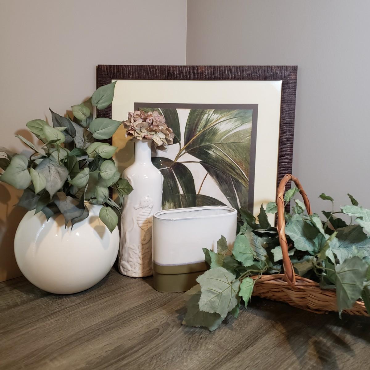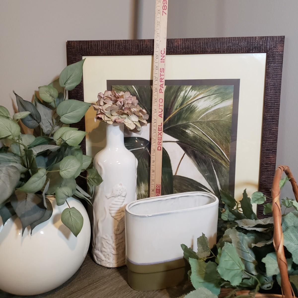 LOT 41F: Palm Leaf Print with Collection of White Vases & Basket