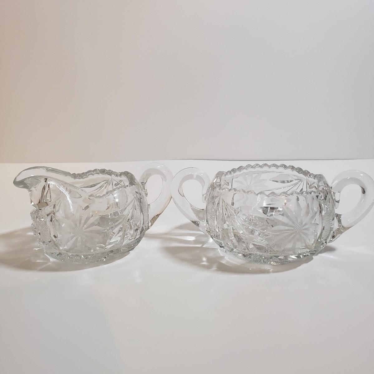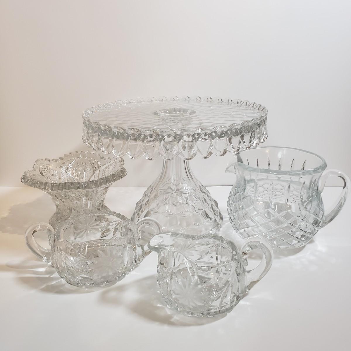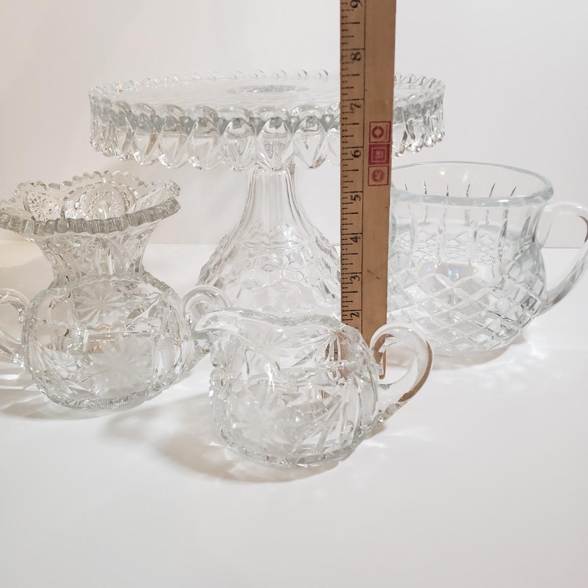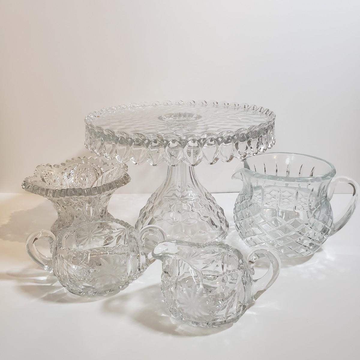 LOT 49K: Fostoria American Cake Stand with Crystal & EAPG Pieces