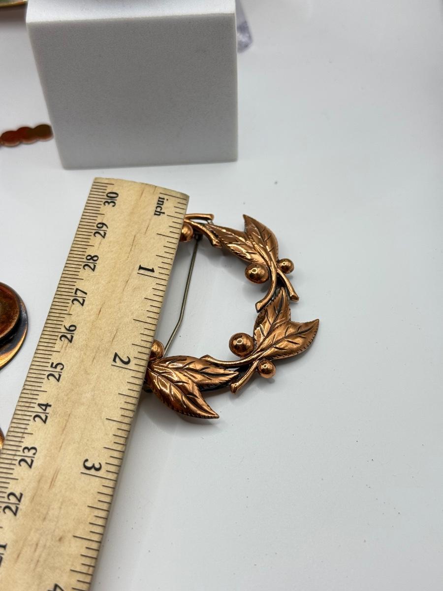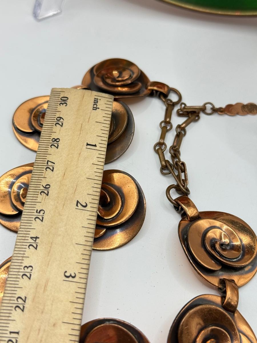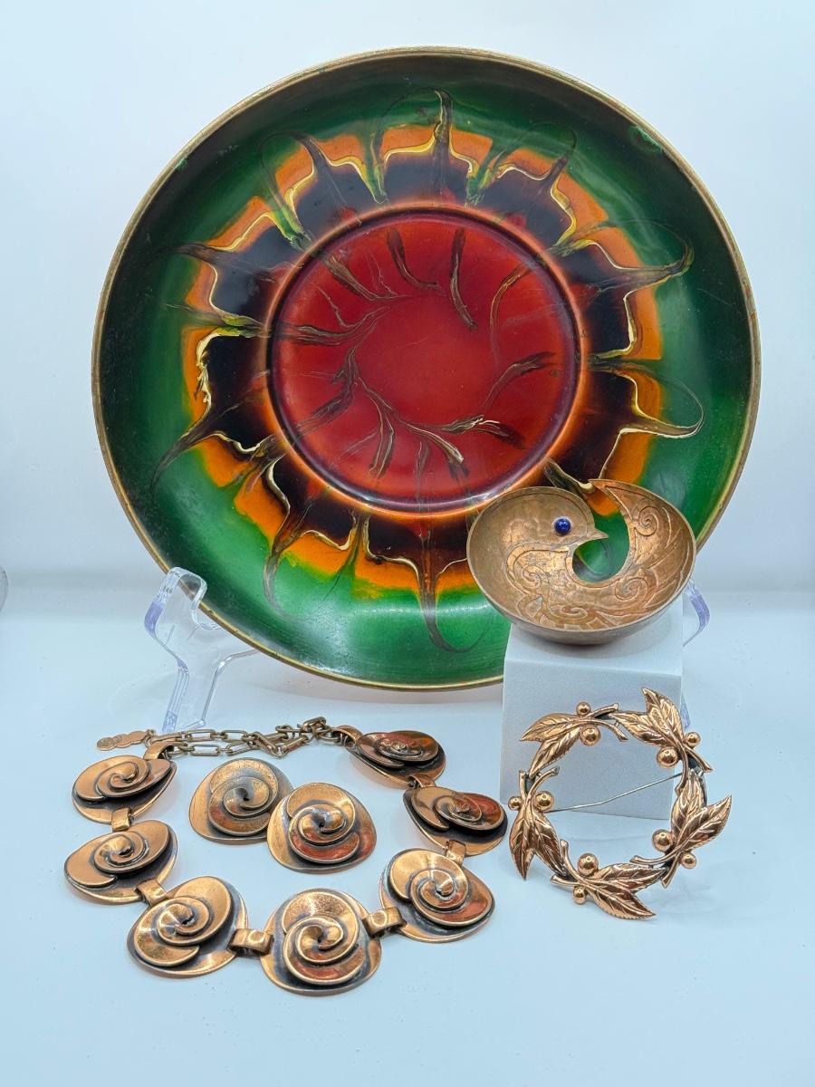 LOT 82Y: Copper Collection: Necklace w/ Earrings, Small Abstract Bird, Copper by Bell Pin & Bowl Hand Made in Greece