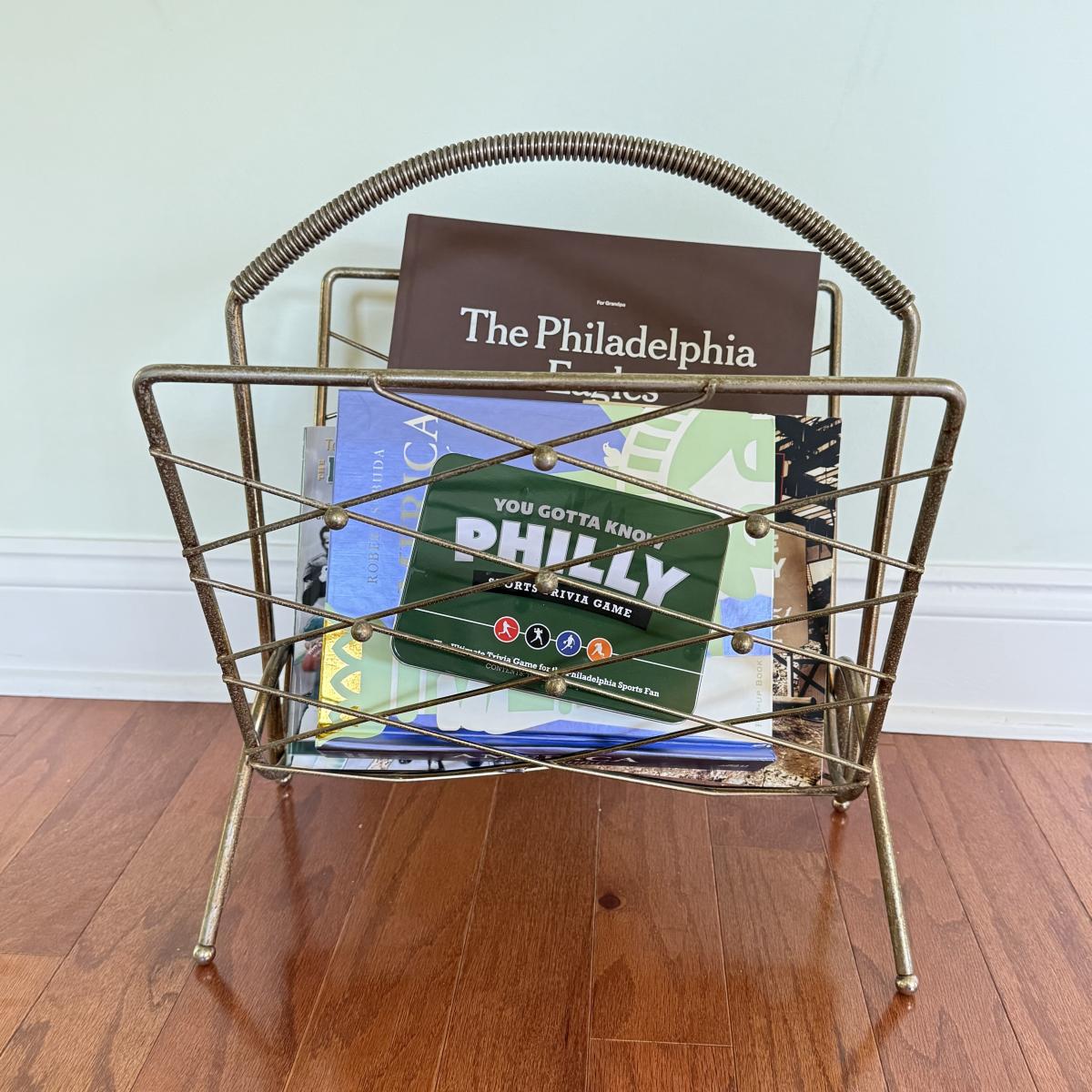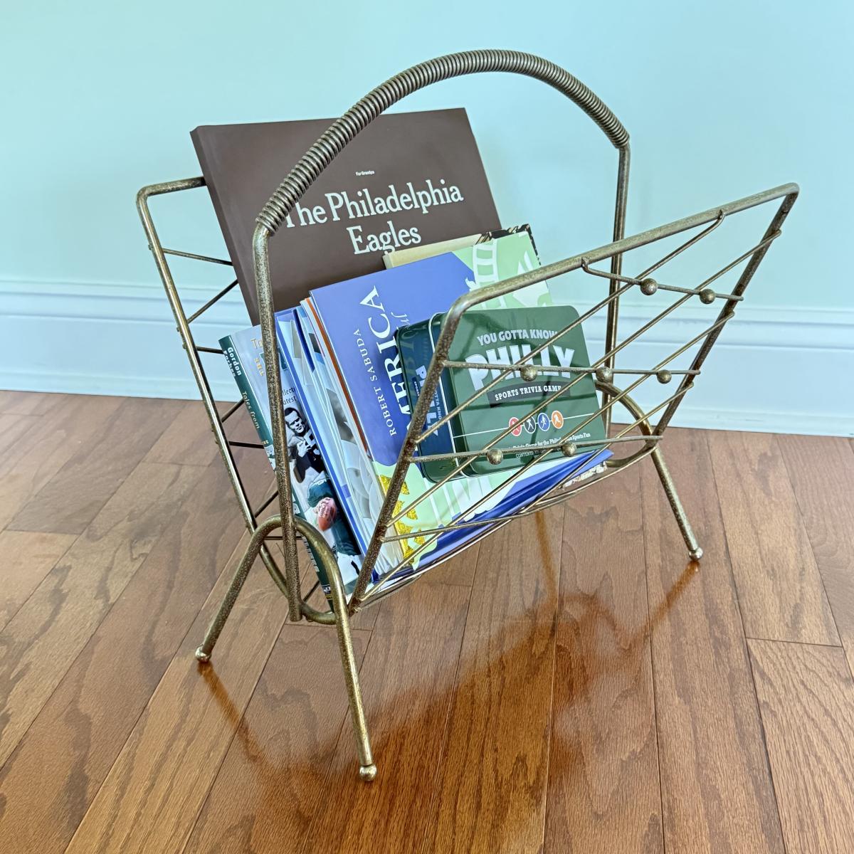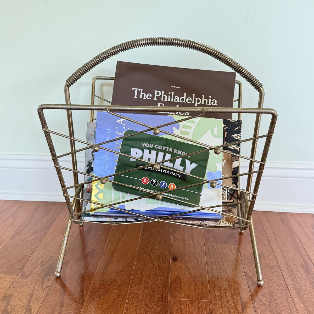 LOT 109D: MCM Brass Magazine Rack w/ America the Beautiful Pop Up Book, Sports Trivia Game & Eagles Book