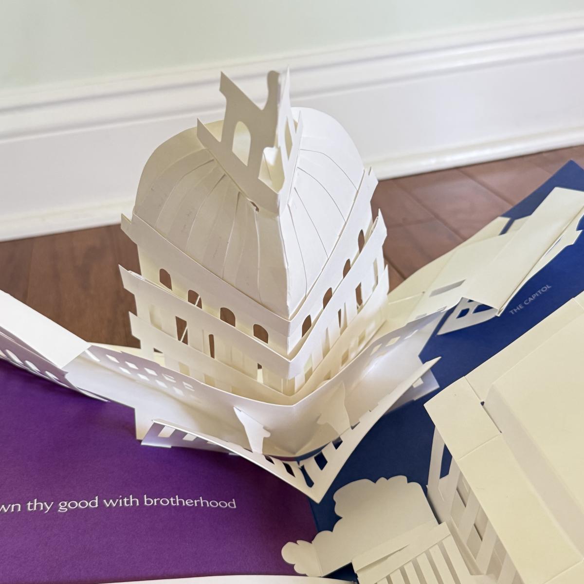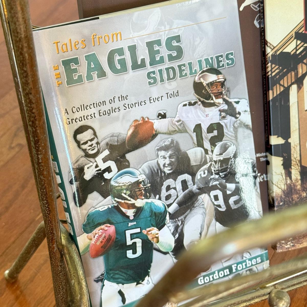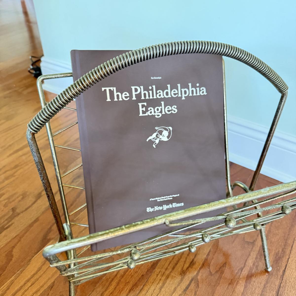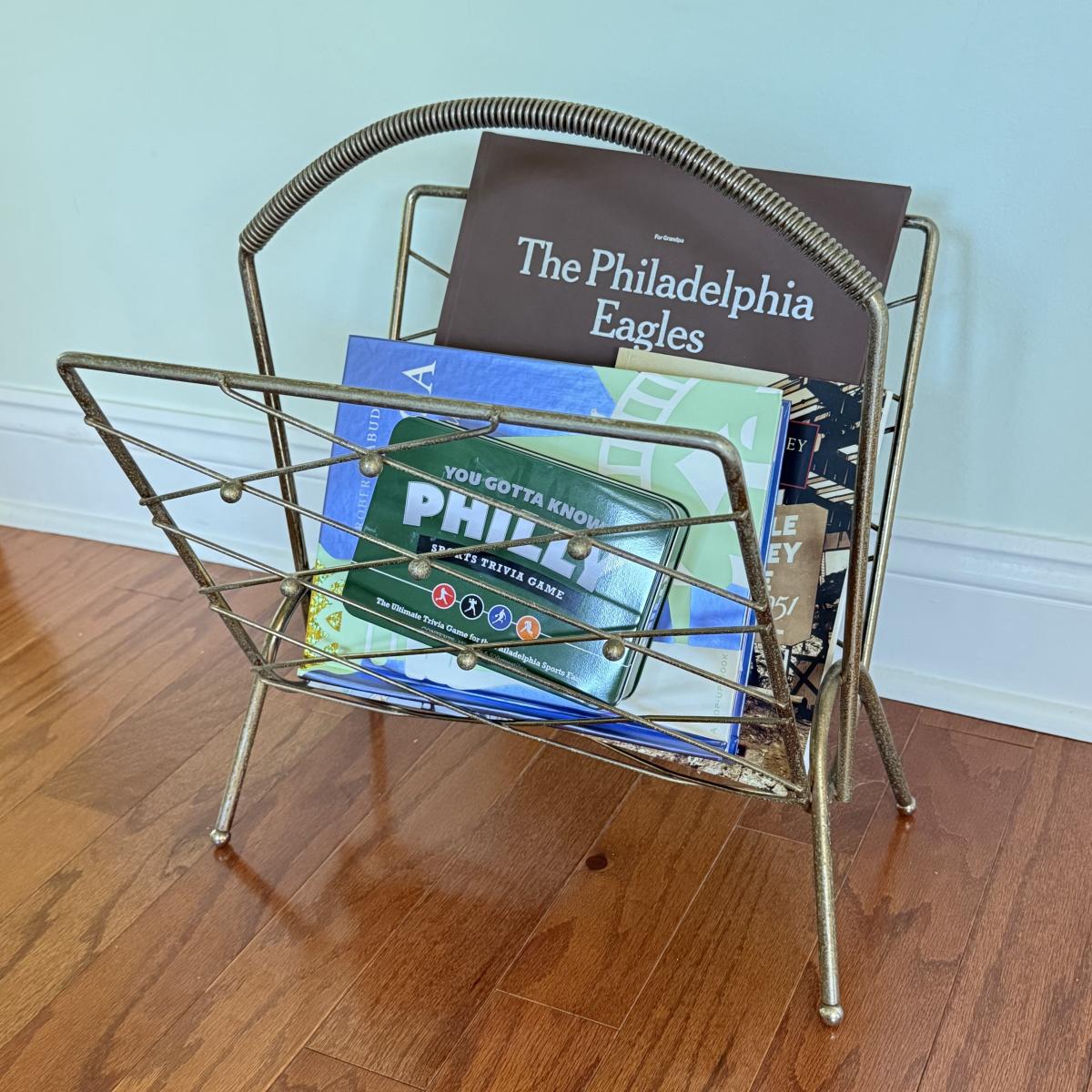 LOT 109D: MCM Brass Magazine Rack w/ America the Beautiful Pop Up Book, Sports Trivia Game & Eagles Book