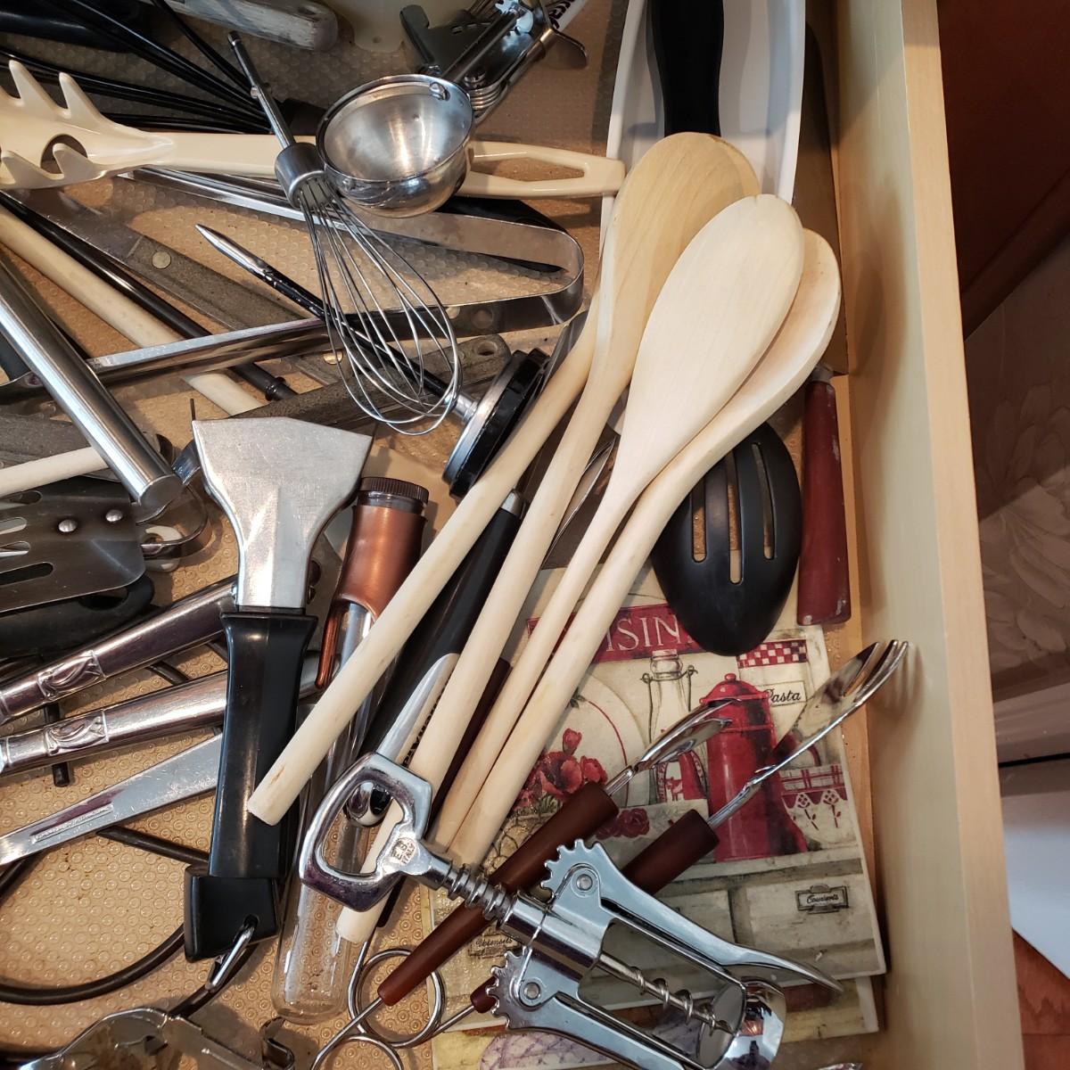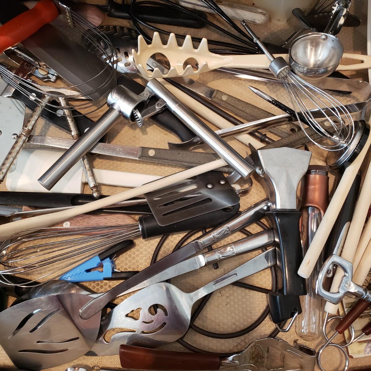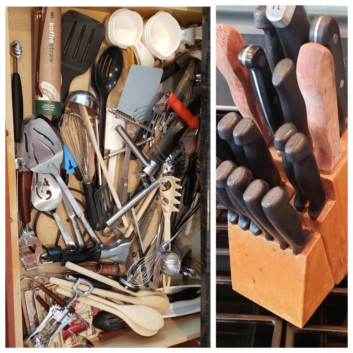 LOT 132K: Kitchen Drawer Contents with Knife Block Filled with Knives