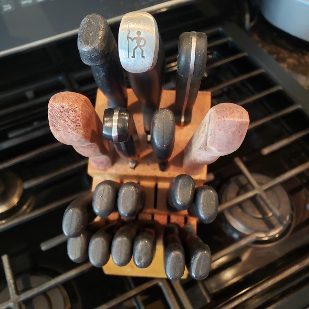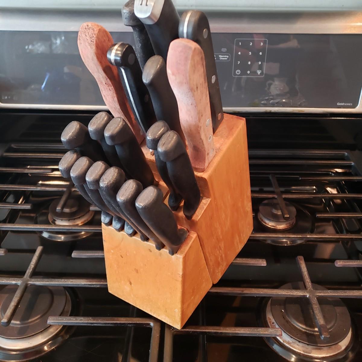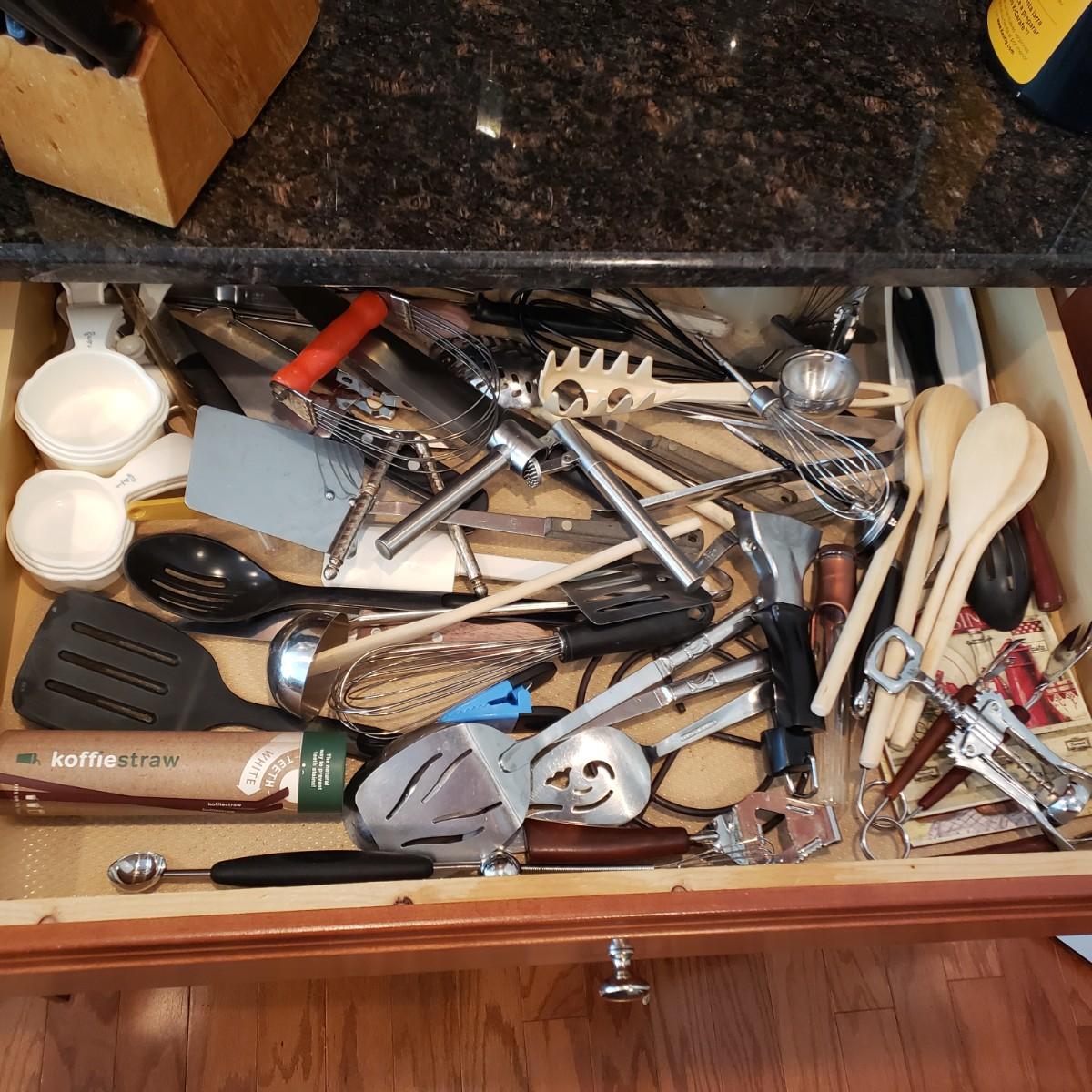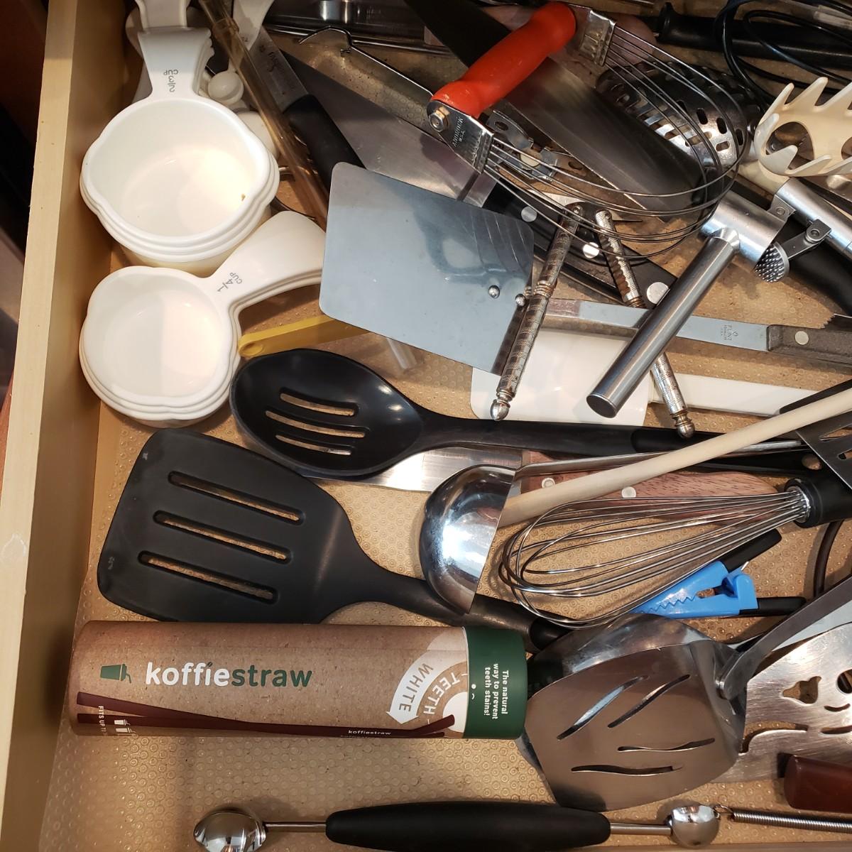 LOT 132K: Kitchen Drawer Contents with Knife Block Filled with Knives