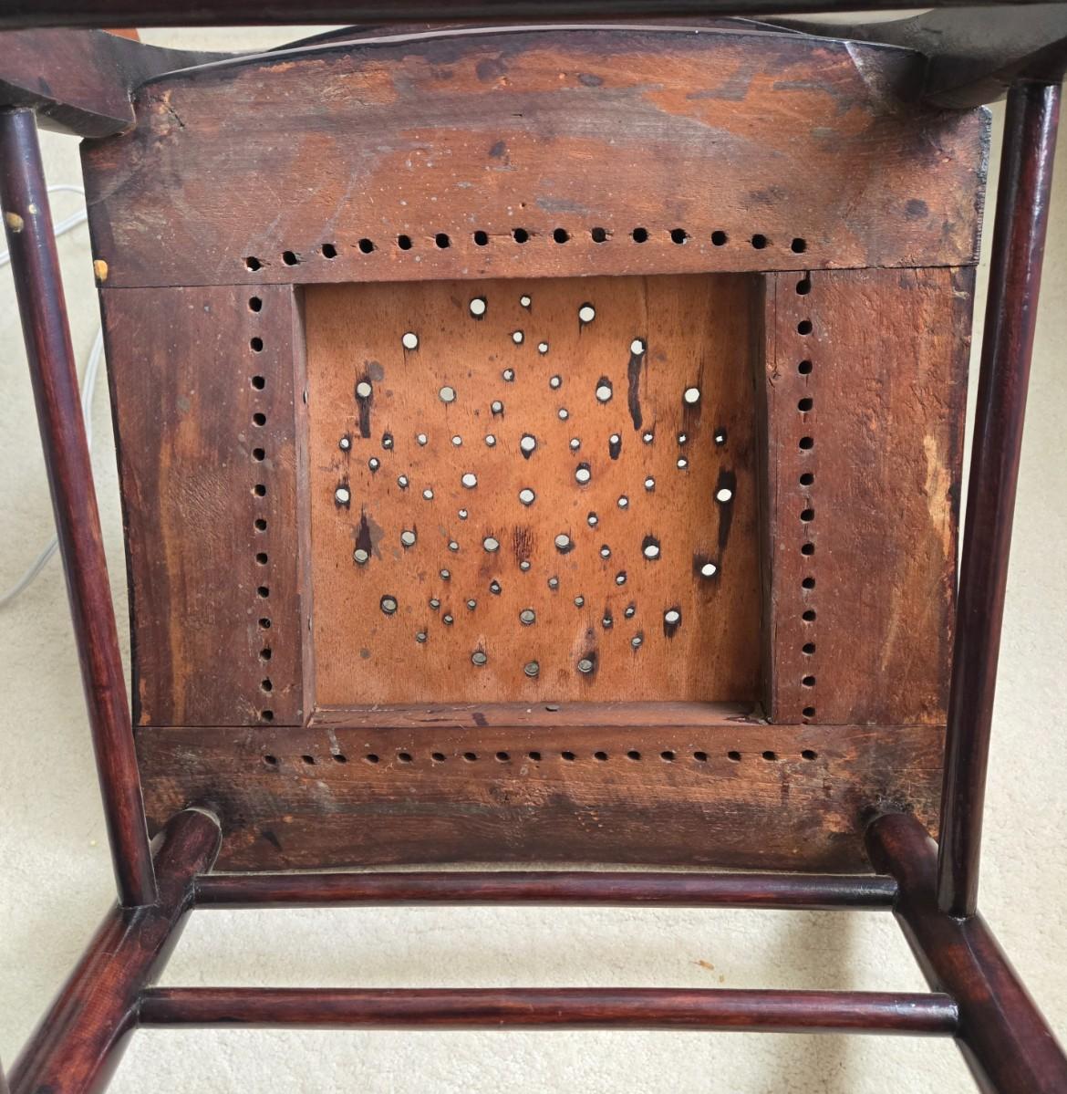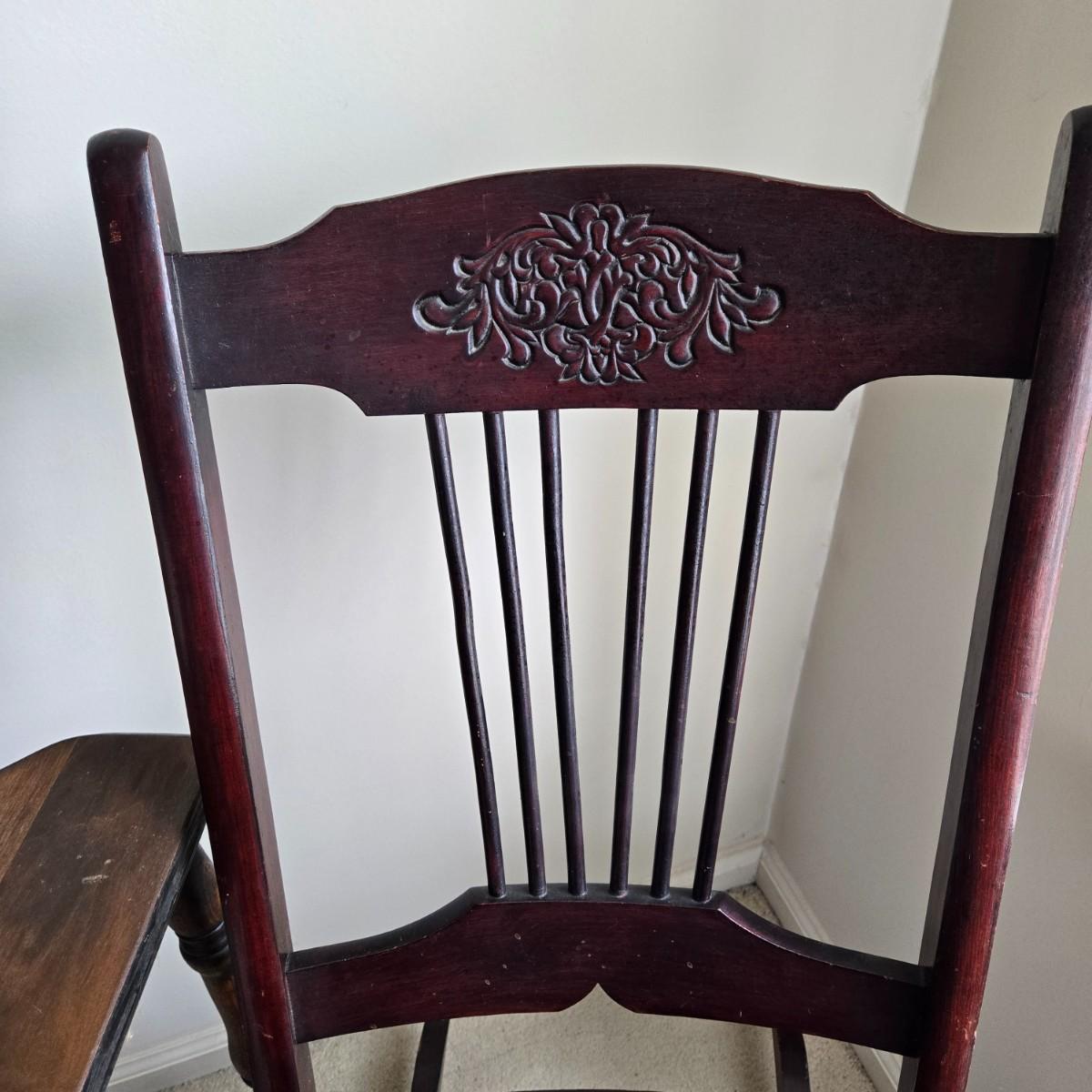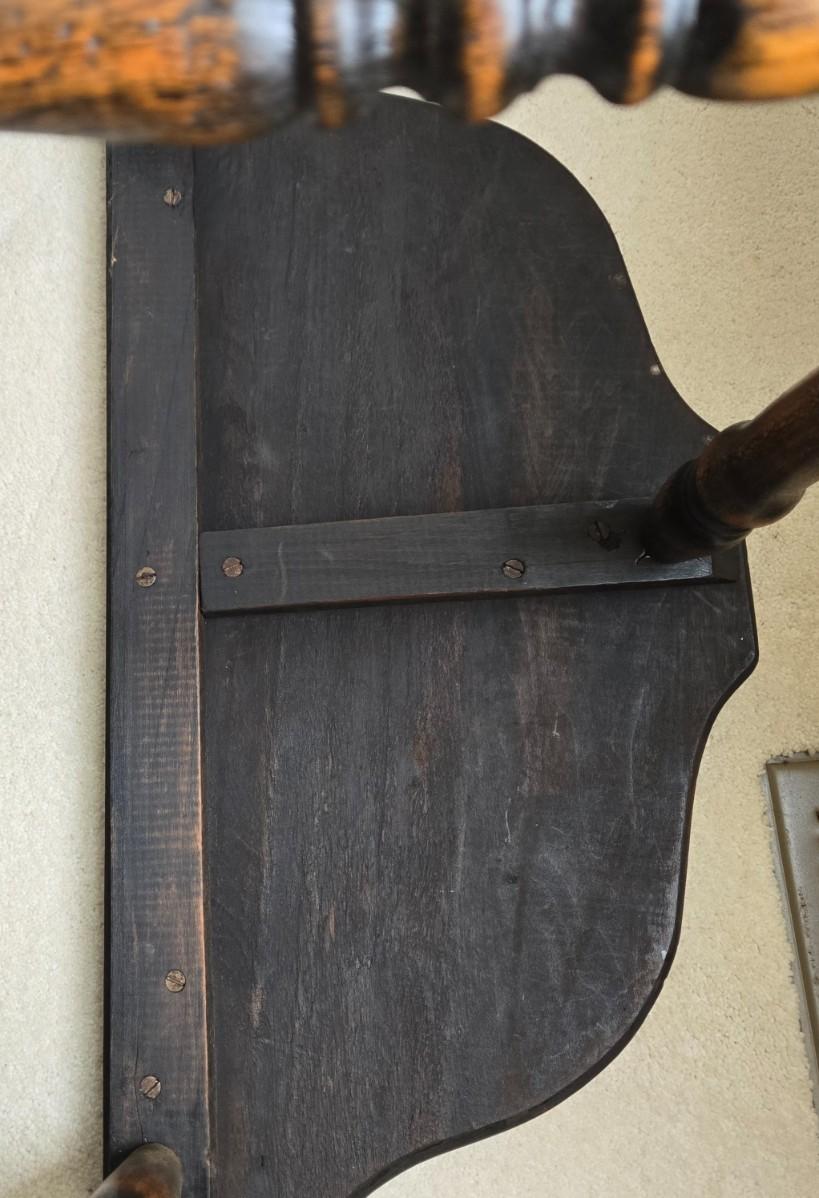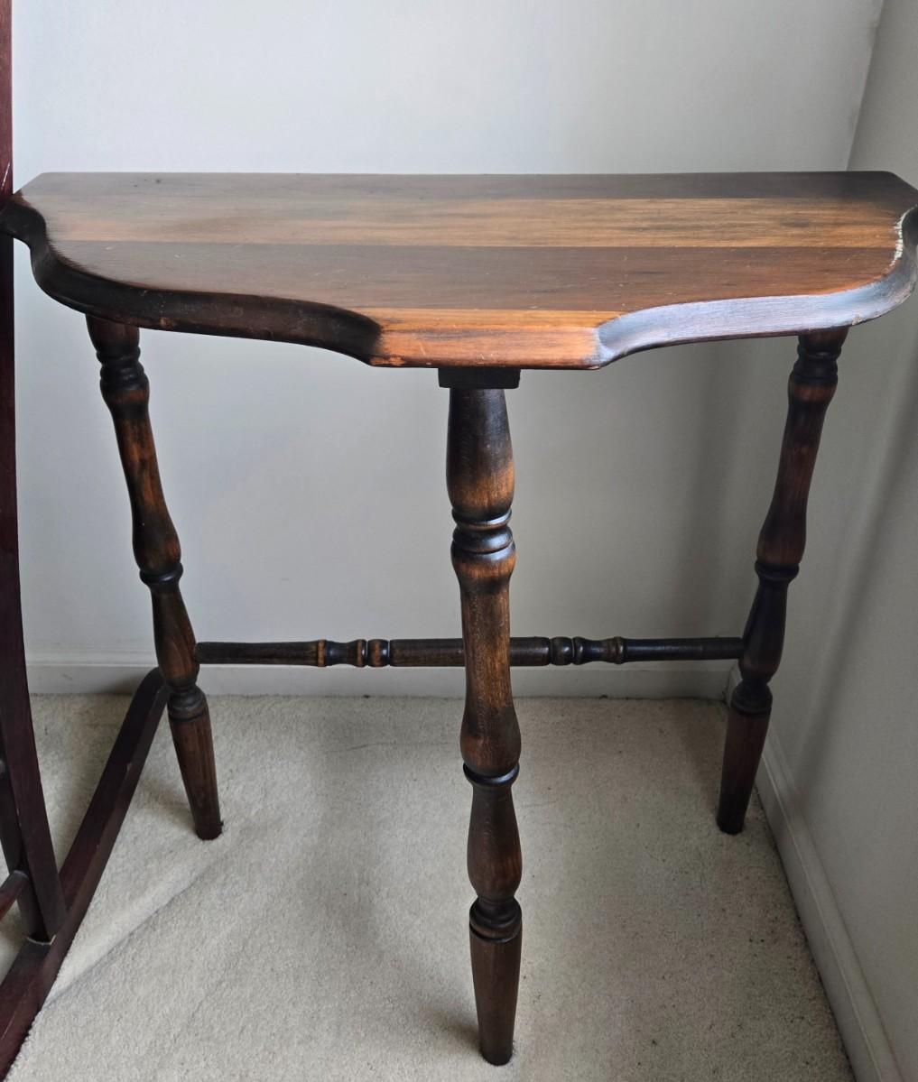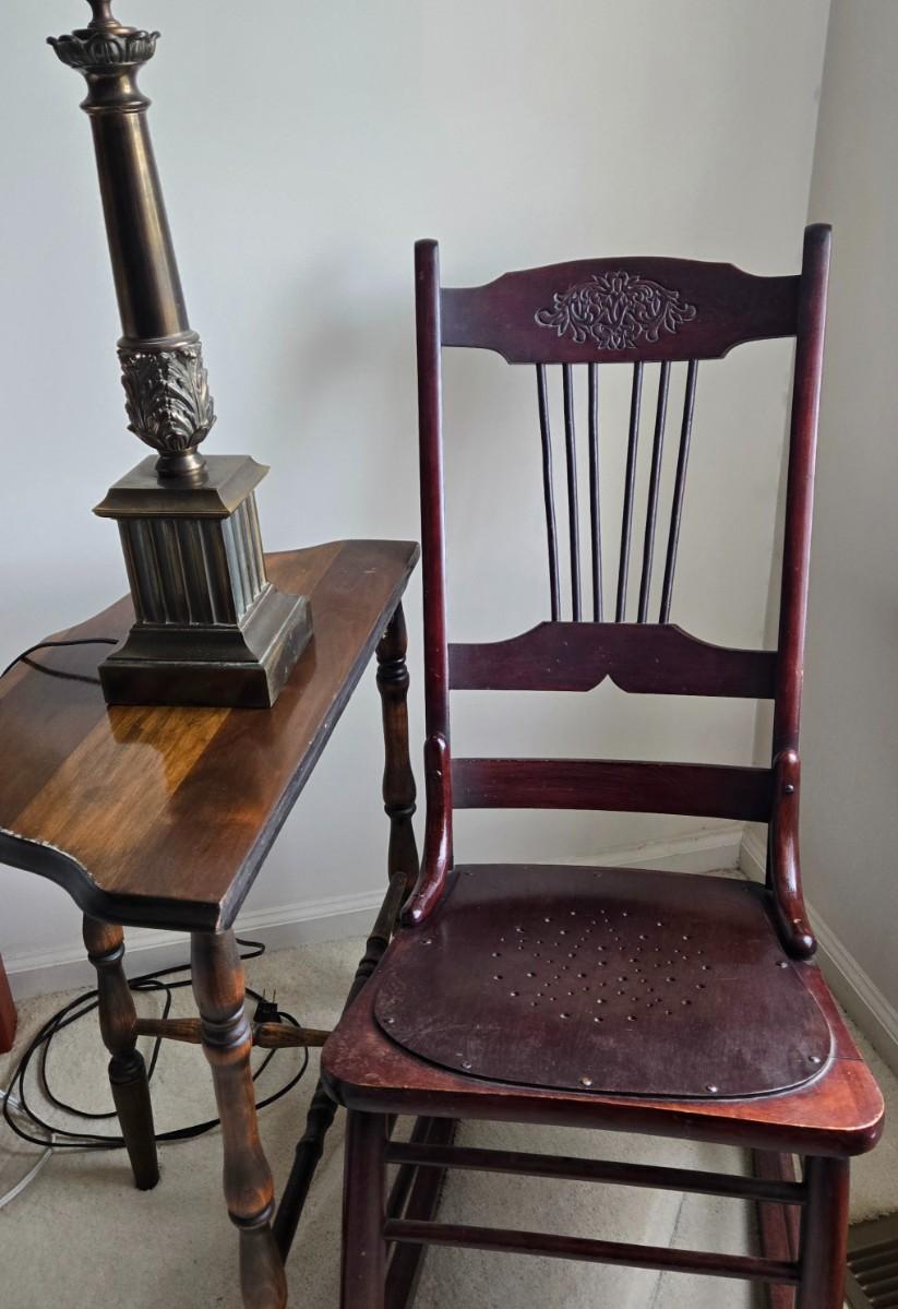 LOT 9B: Rustic Hand Carved Wooden Rocker, Half Moon Side Table, and Vintage Metal Lamp