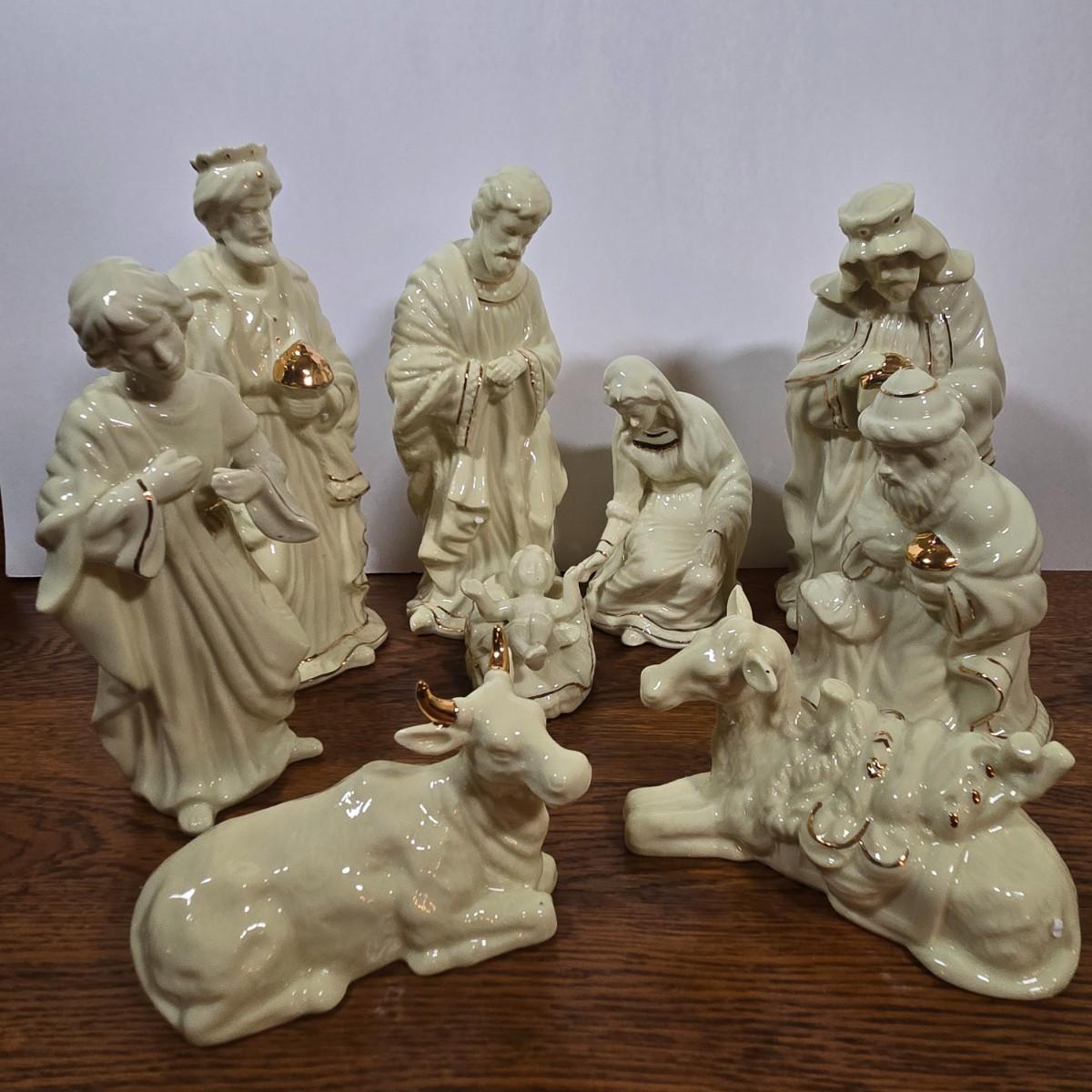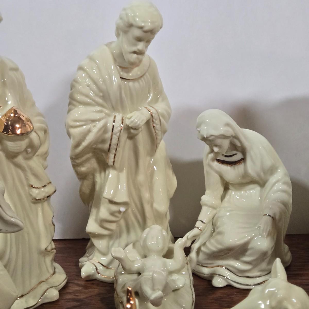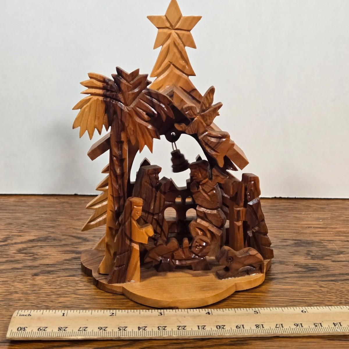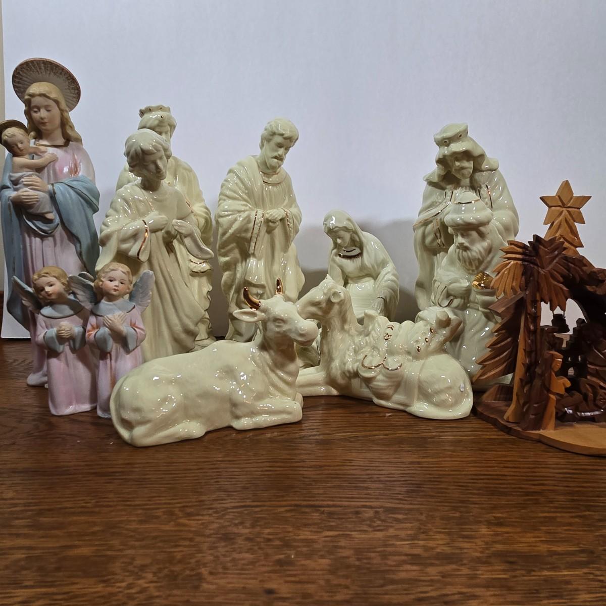 LOT 14L: Gold-Tone Trimmed Nativity Set, Hand Carved in Bethlehem Olive Wood Nativity, and Ardco Porcelain Madonna Holding Baby Jesus and Two Angels
