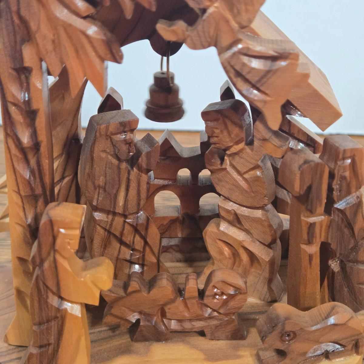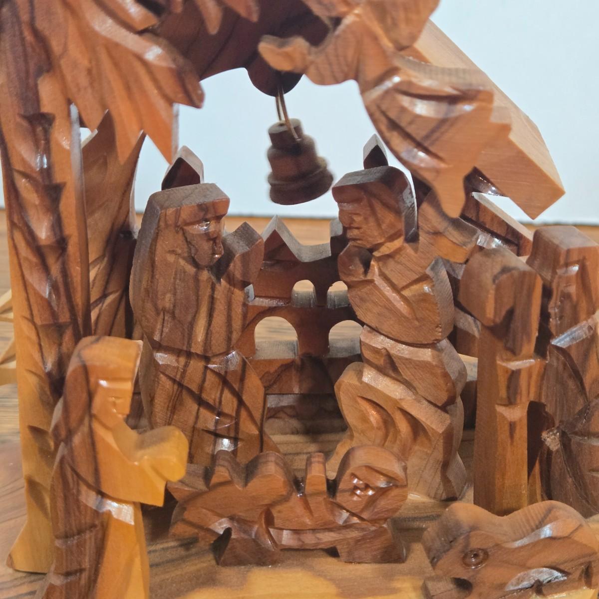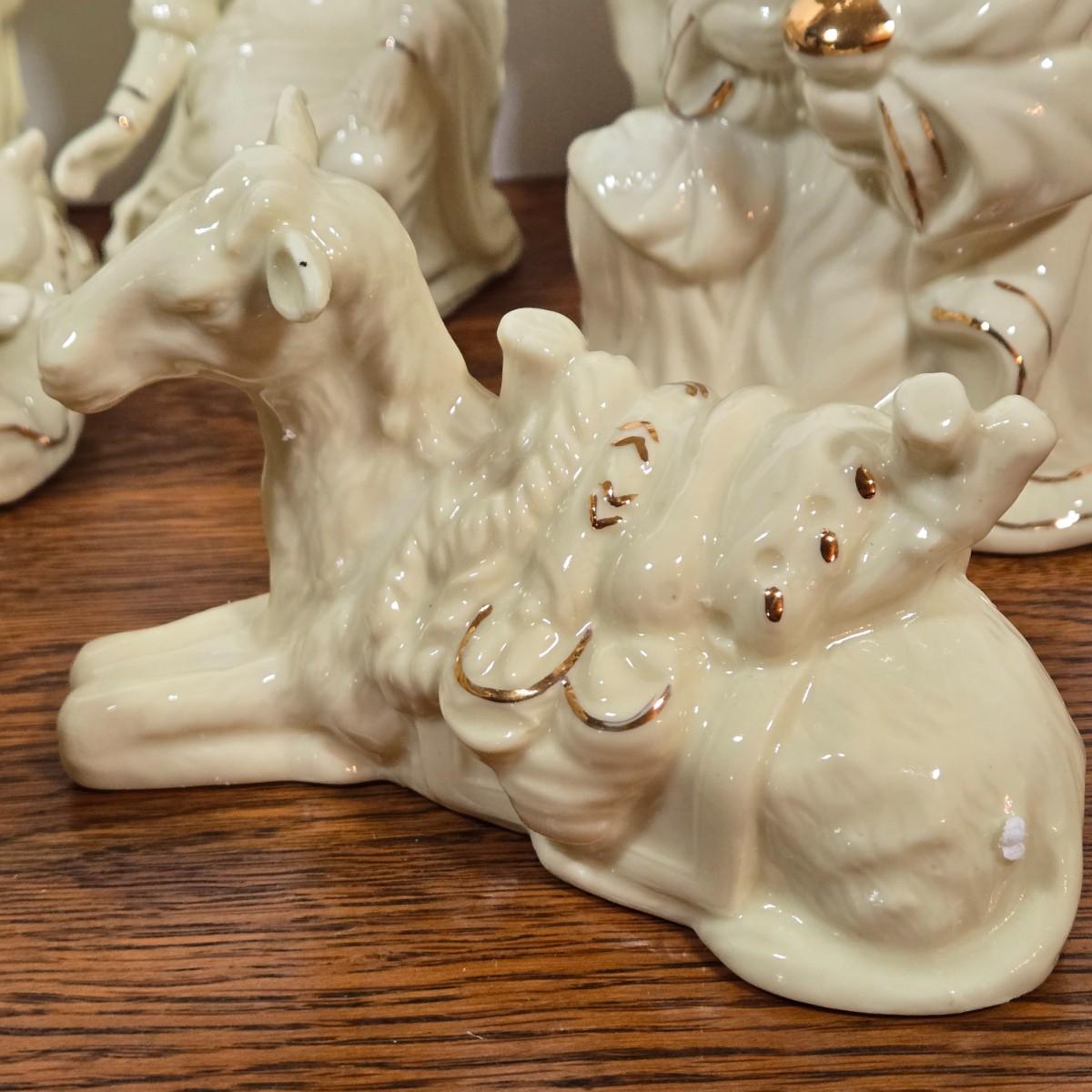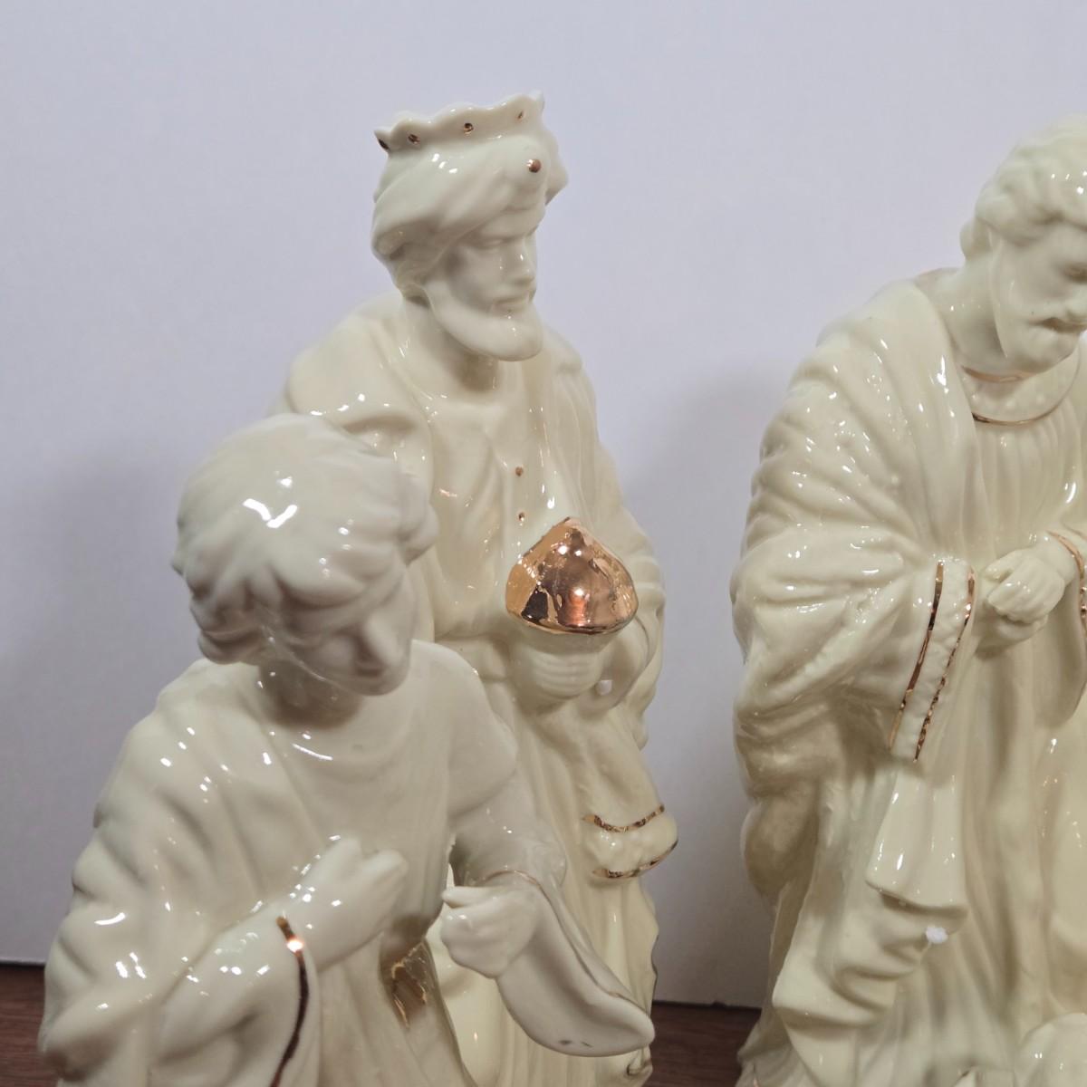 LOT 14L: Gold-Tone Trimmed Nativity Set, Hand Carved in Bethlehem Olive Wood Nativity, and Ardco Porcelain Madonna Holding Baby Jesus and Two Angels