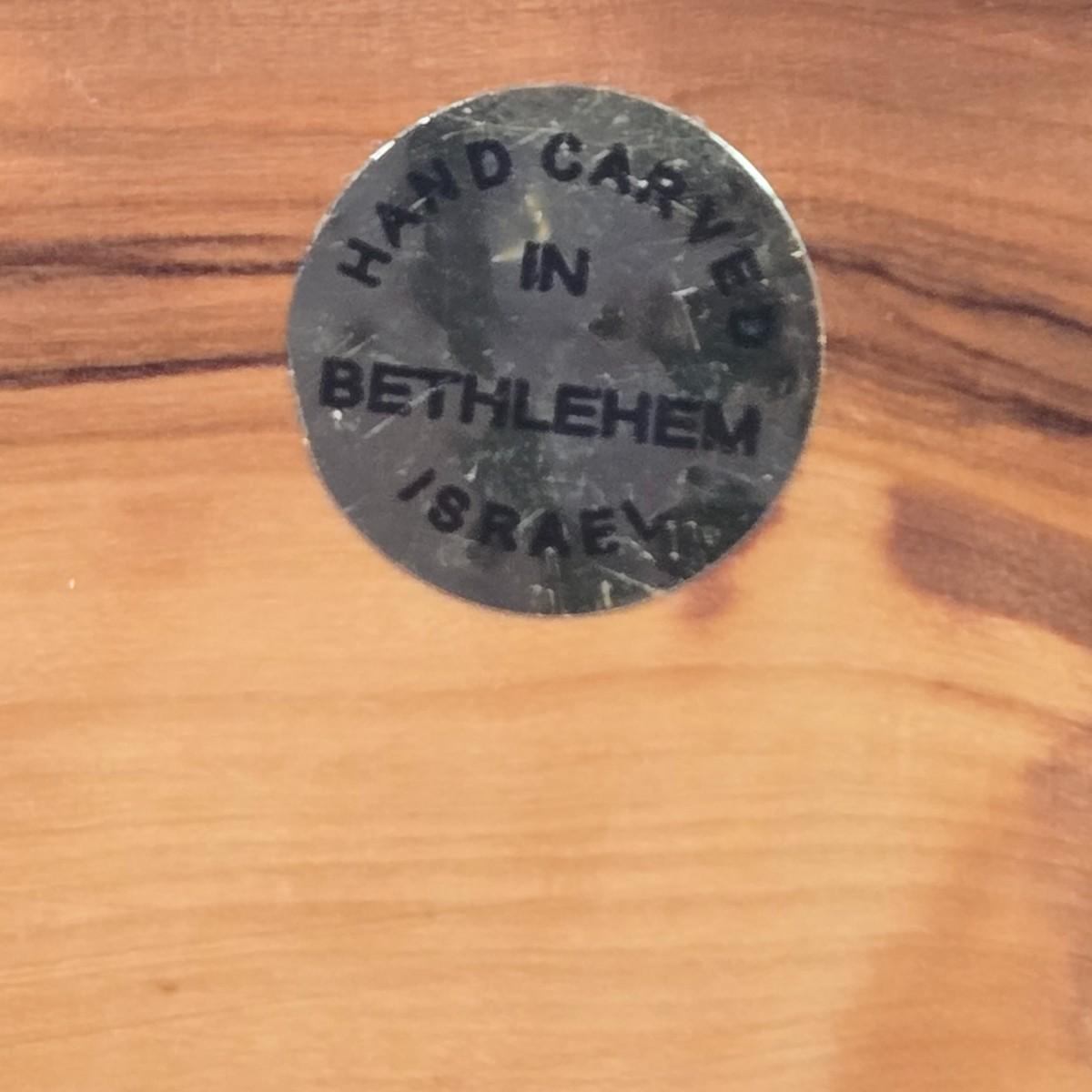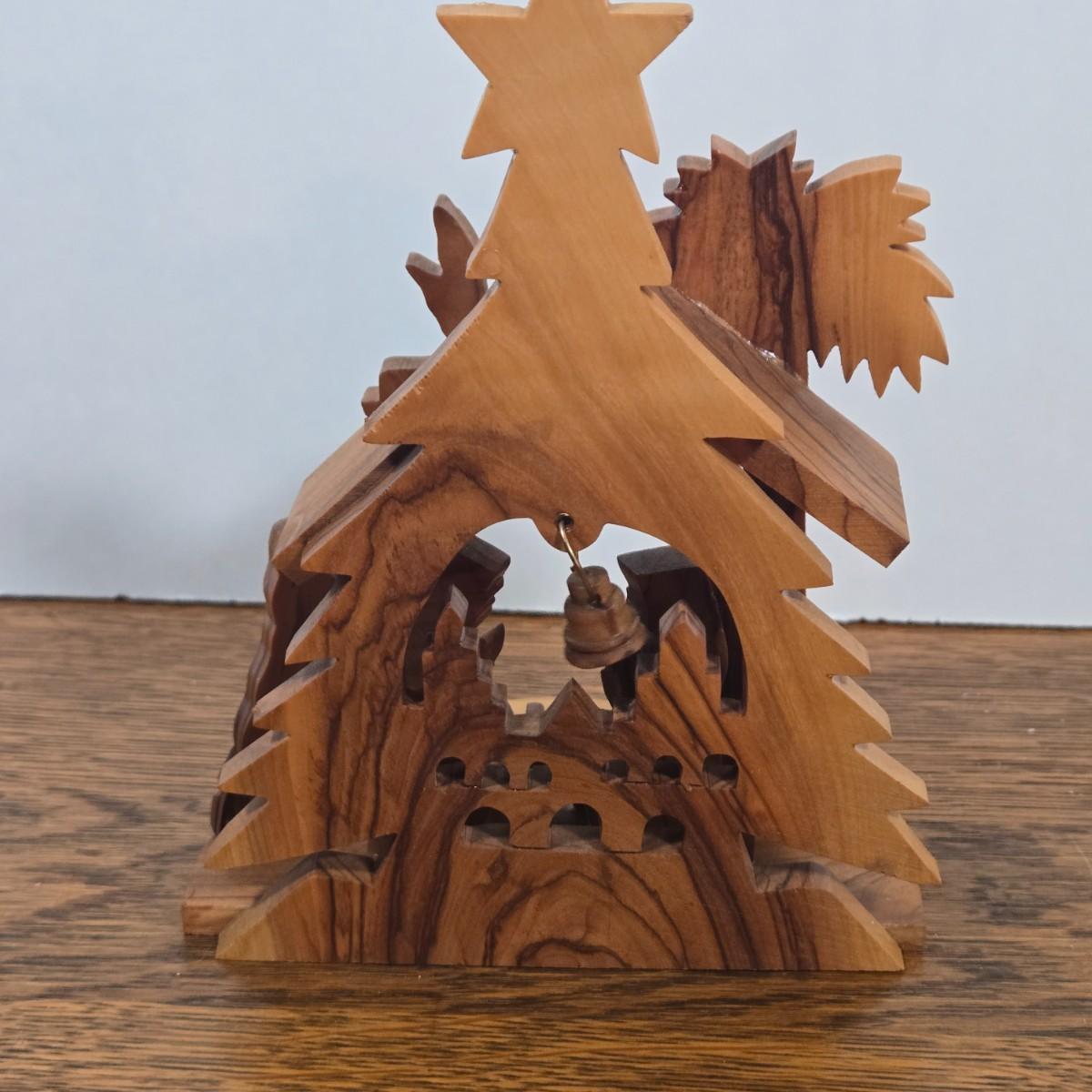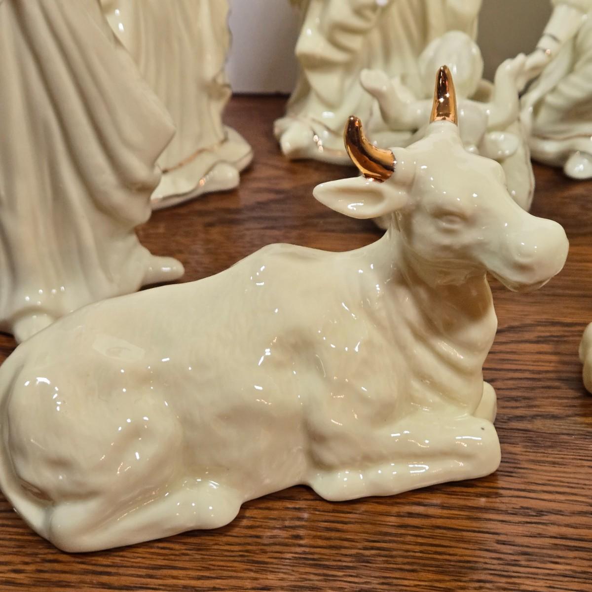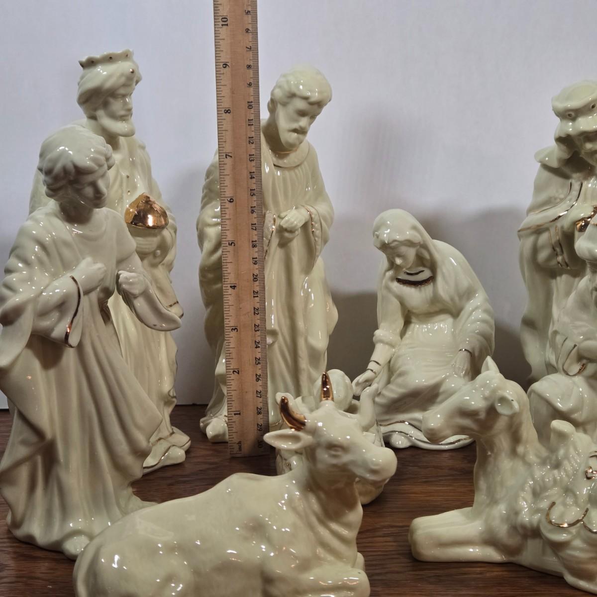 LOT 14L: Gold-Tone Trimmed Nativity Set, Hand Carved in Bethlehem Olive Wood Nativity, and Ardco Porcelain Madonna Holding Baby Jesus and Two Angels