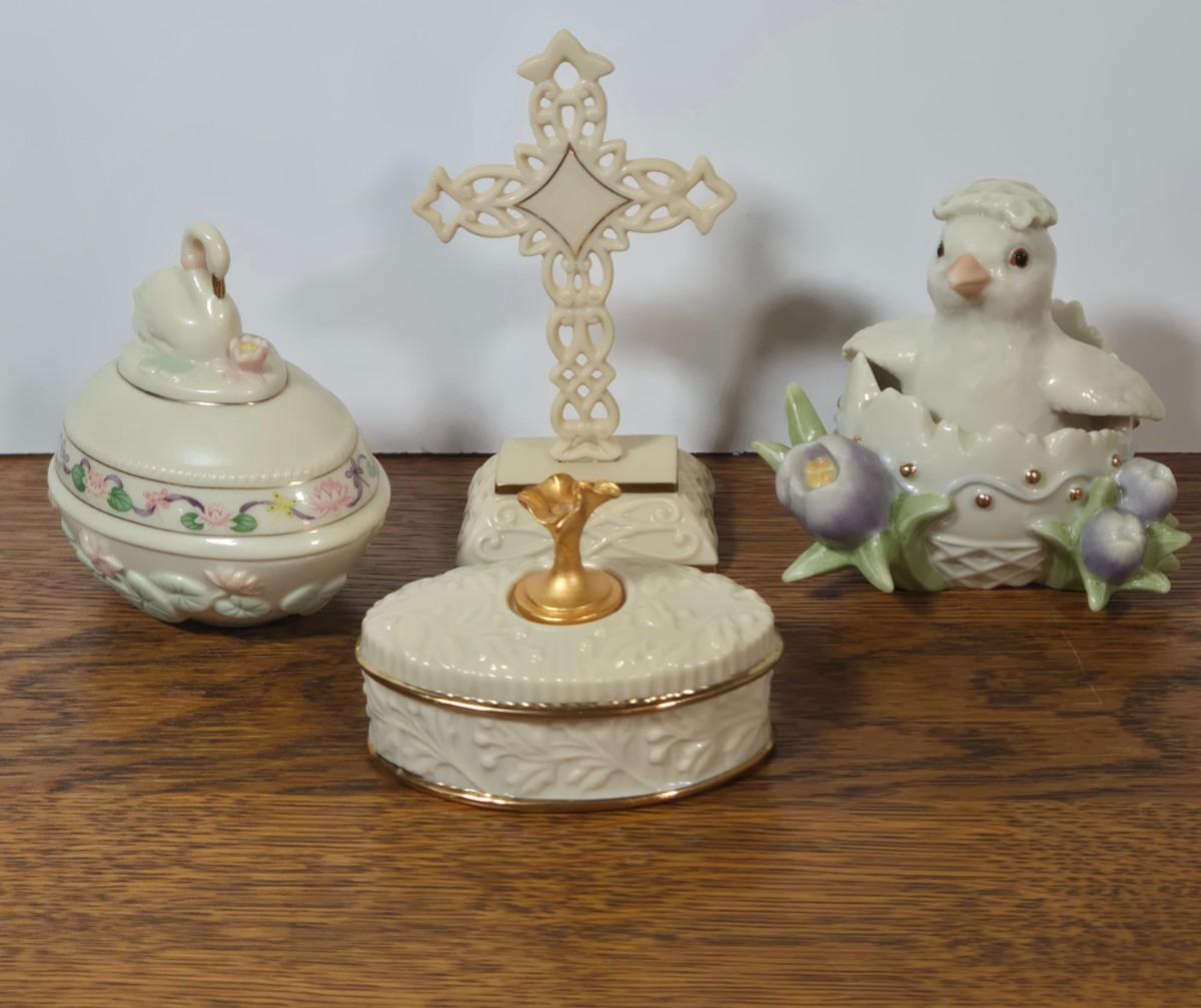 LOT 23L: Lenox Easter Egg Surprise, Standing Cross, Swan Easter Egg Trinket Box, and April Birthstone Trinket Box