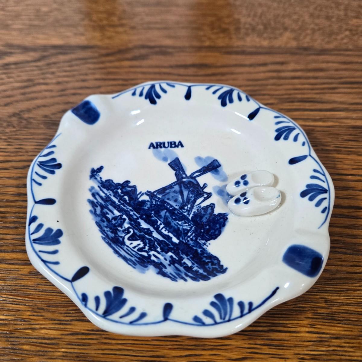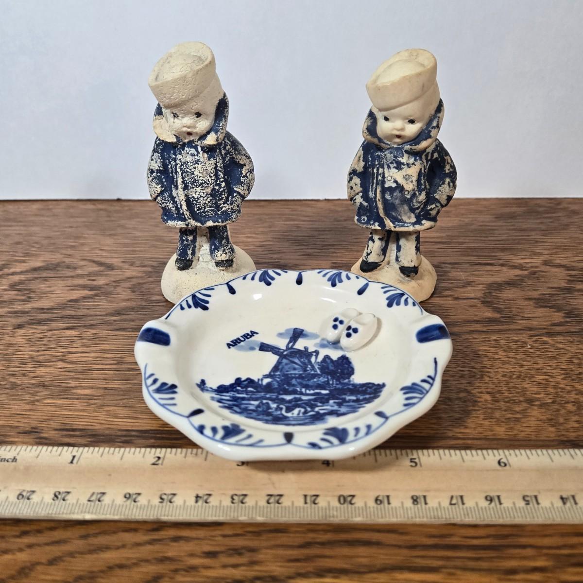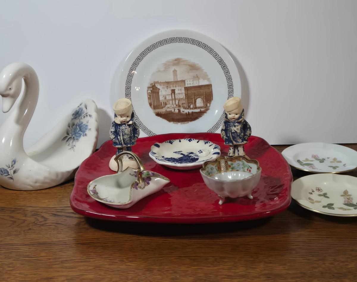 LOT 28D: Hand Painted in Italy Red Plate, Richard Ginori Plate, Athena Ceramic Swan, 2 Wedgewood Ashtrays, Hand Painted Aruba Ashtray, 2 Nippon Trinket Bowls, & Two 1940's Chalkware Sailor Figurines